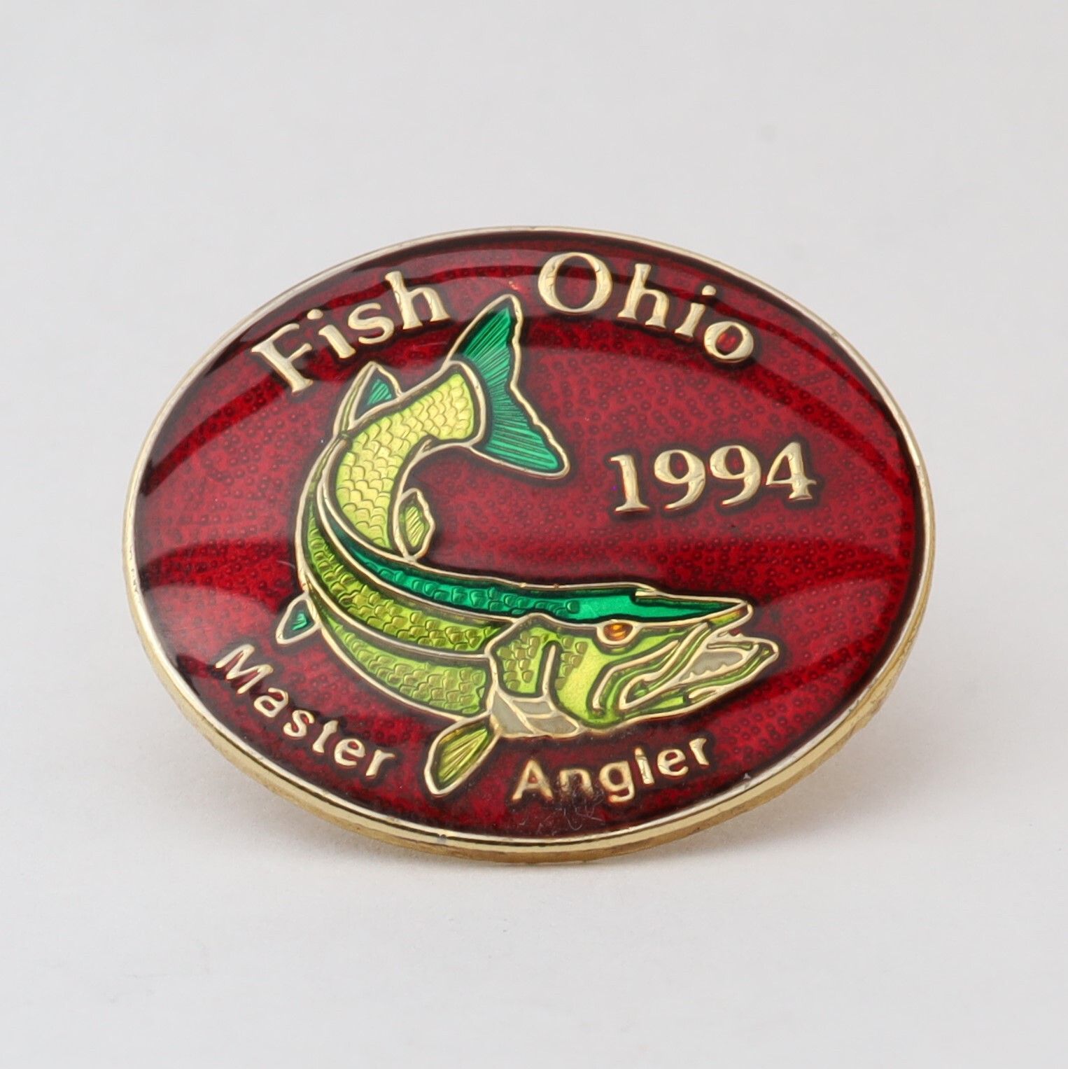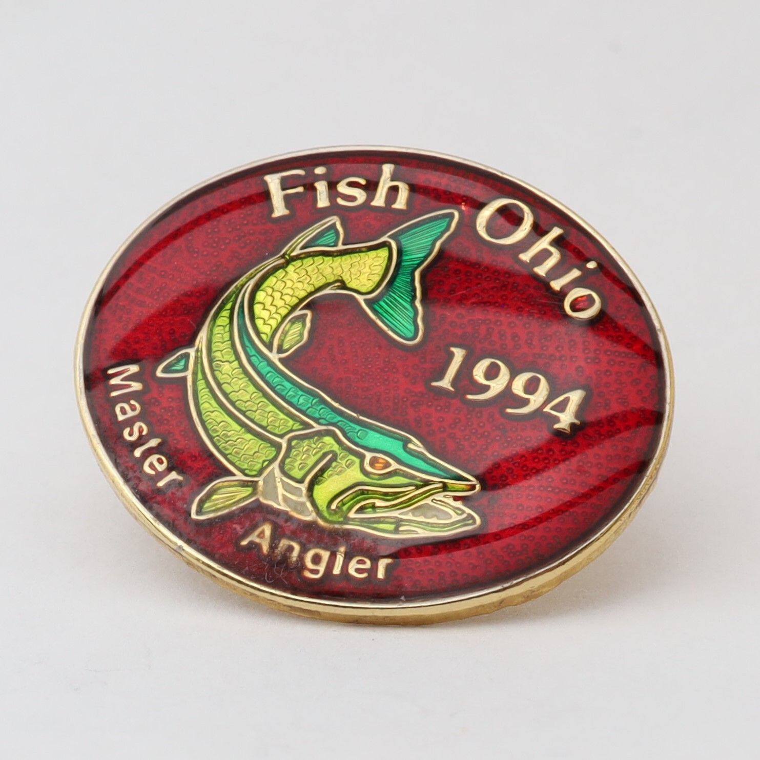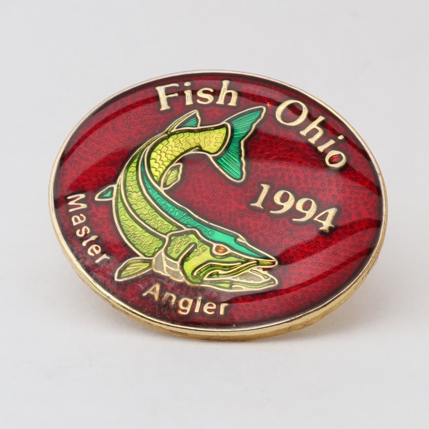 Prototype of the 1994 Master Angler pin featuring muskie.Context