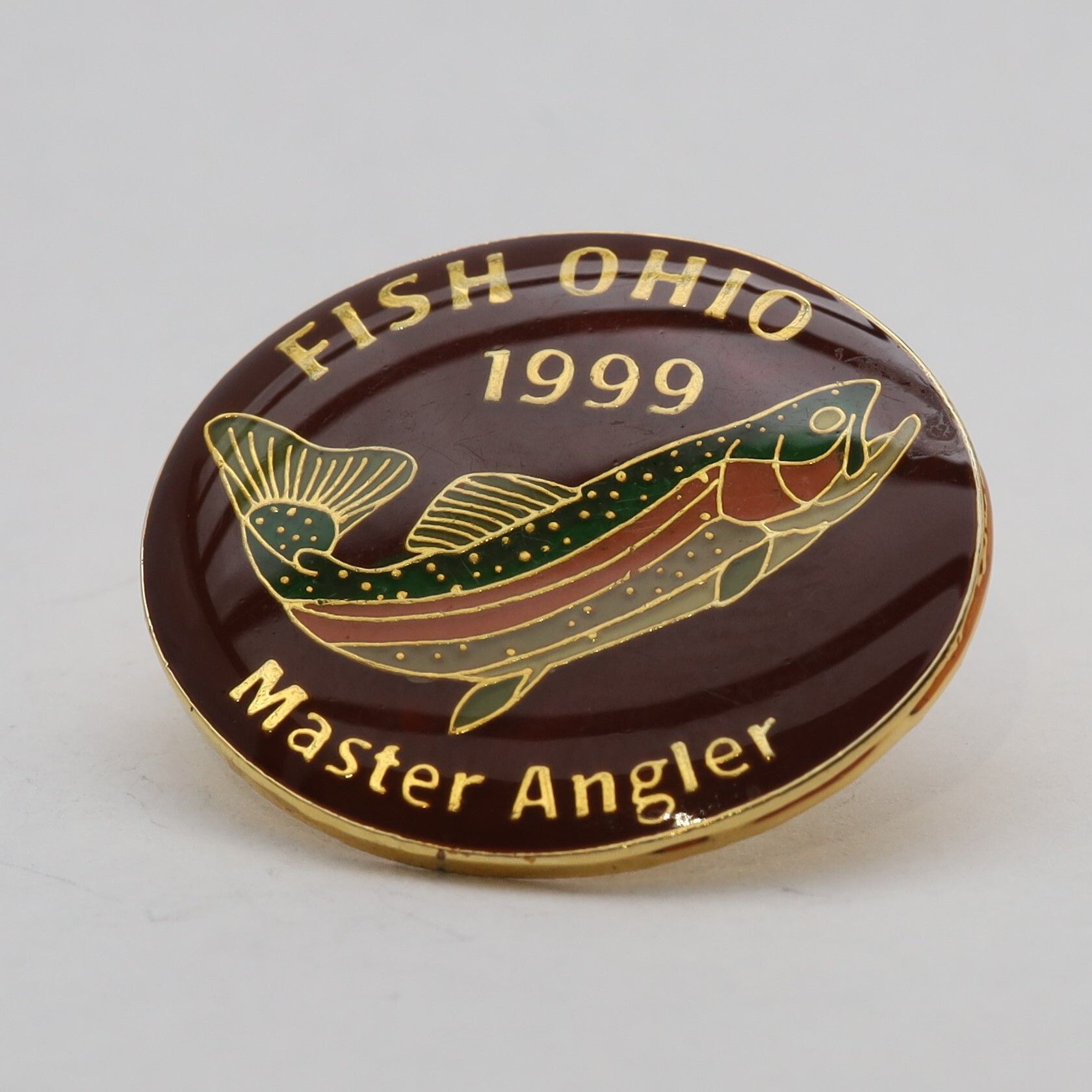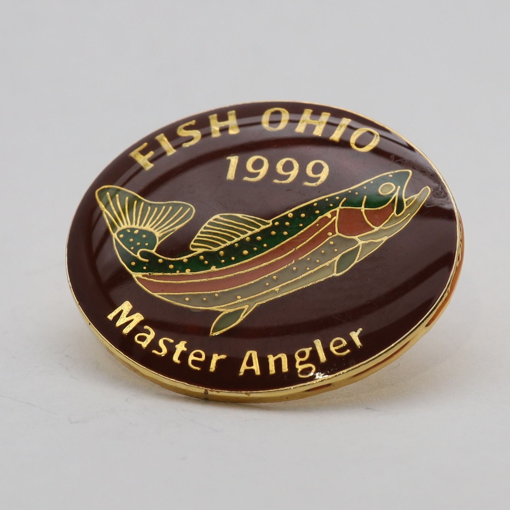 The 1999 Master Angler pin features a rainbow trout enameled in dark green, orange, and tan scales and fins. The fish's belly is a lighter tan or off-white. Fish Ohio and the year are above the fish in gold with the words Master Angler below the trout in gold. The pin's background is dark brown.Use