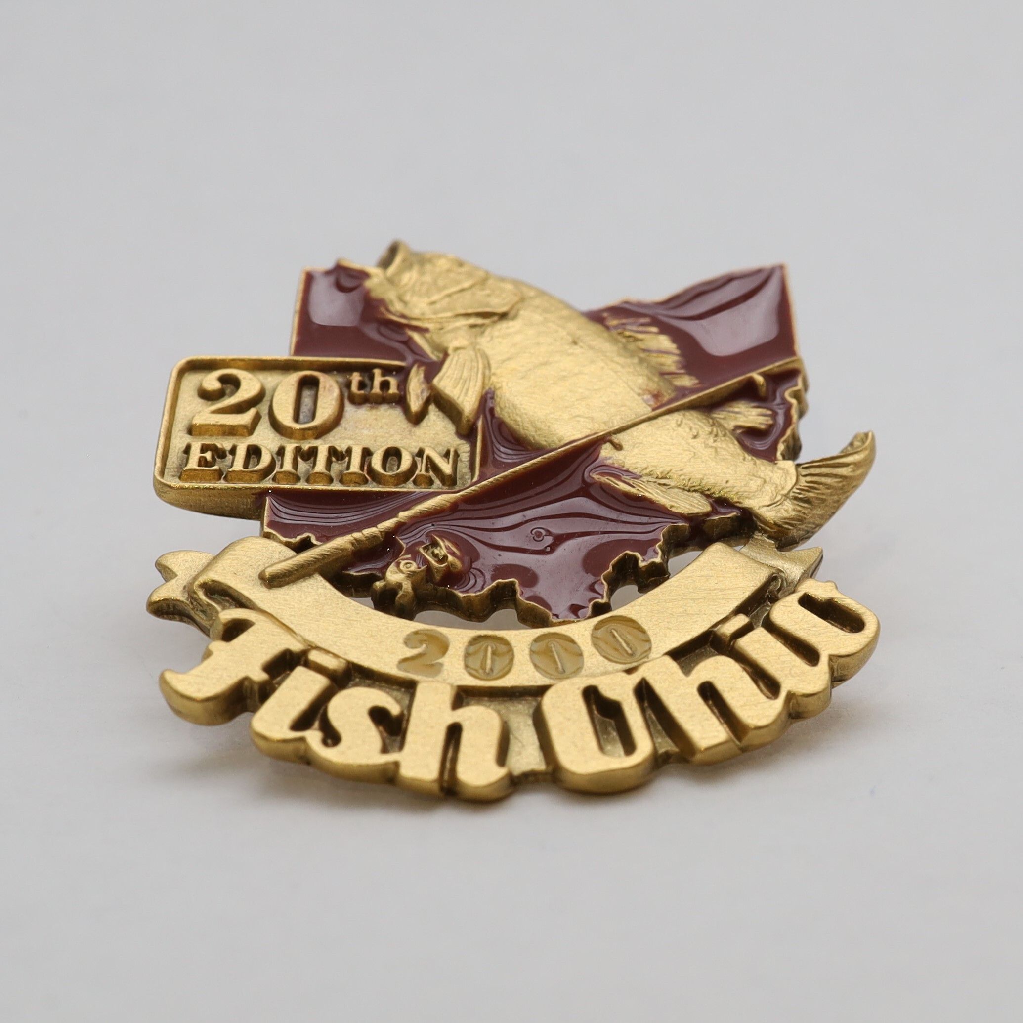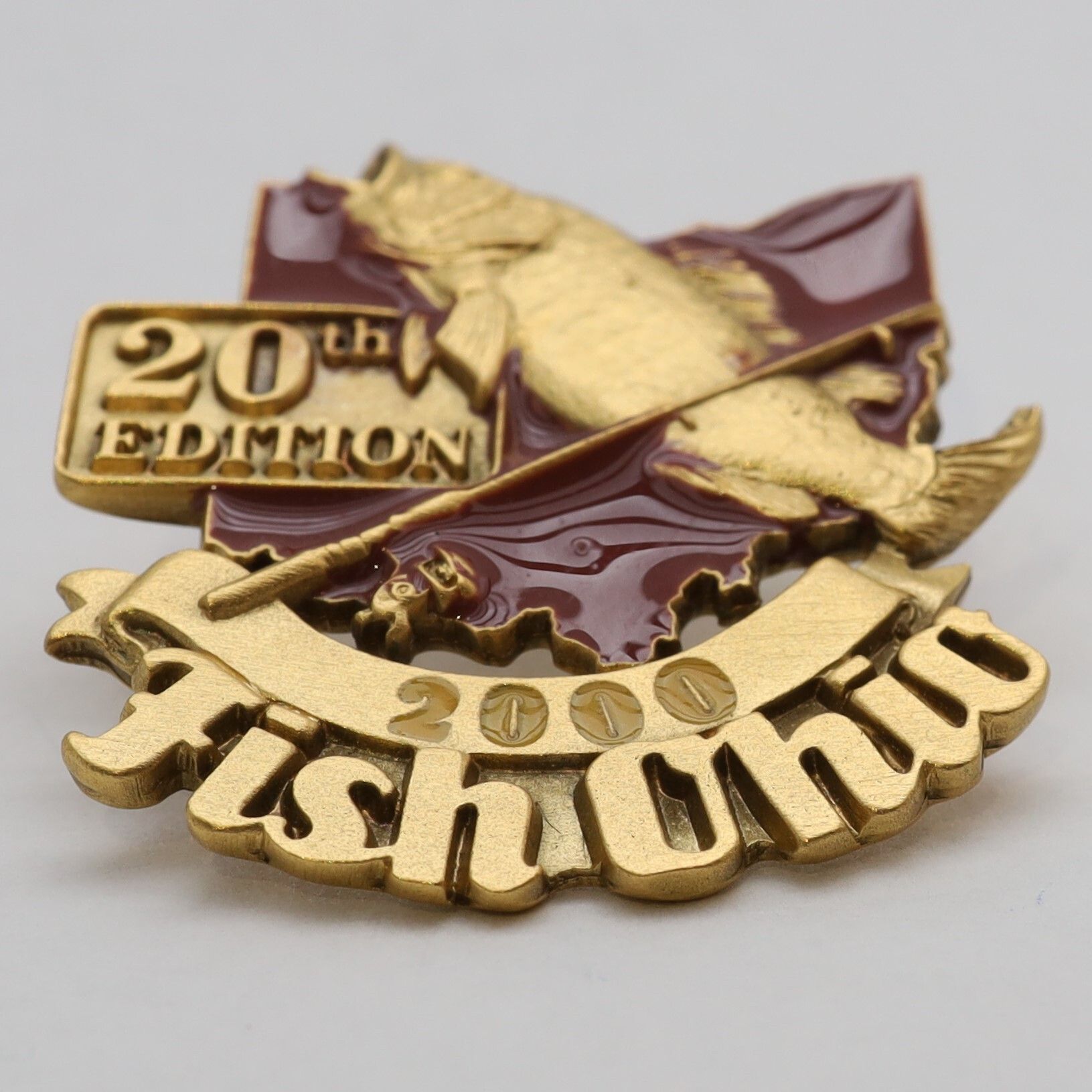In honor of the 20th anniversary of the Fish Ohio pins, the 2000 pin is in pewter and features a largemouth bass. This is the Master Angler version of the pin. It is covered in gold rather than the natural pewter of the regular Fish Ohio pin. Additionally, the state of Ohio is enameled in burgundy.