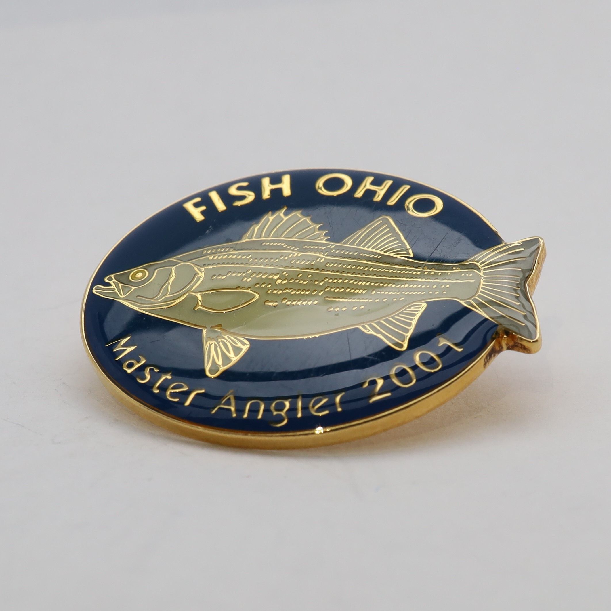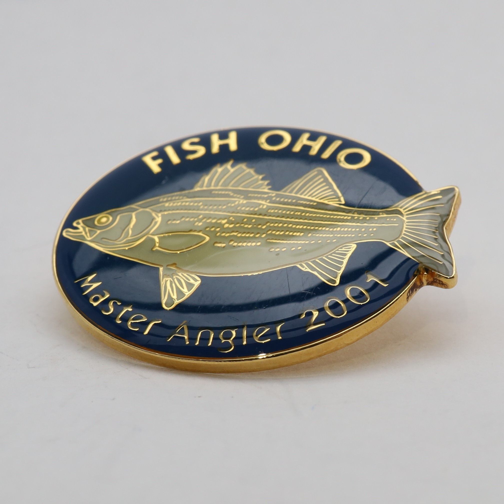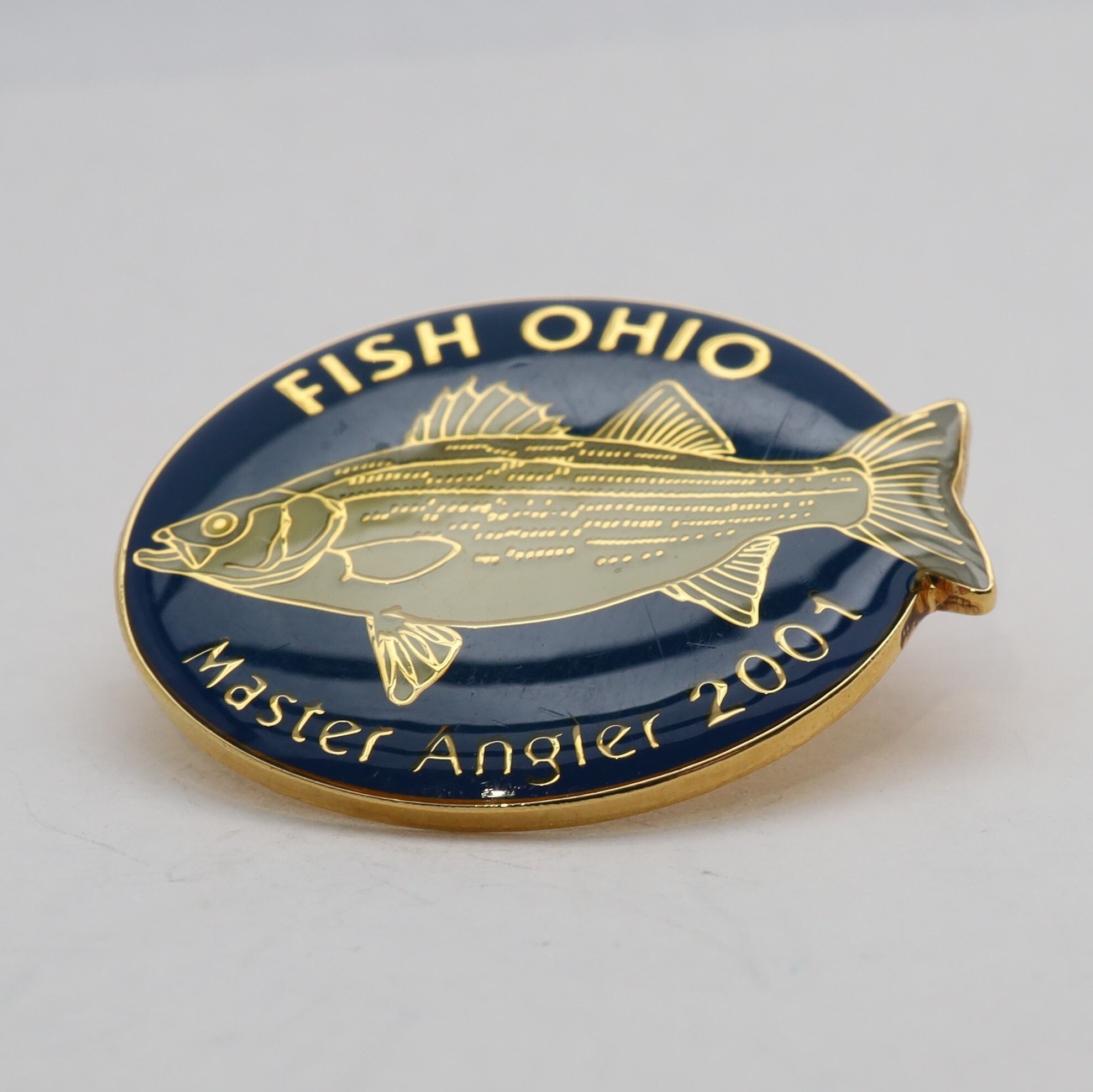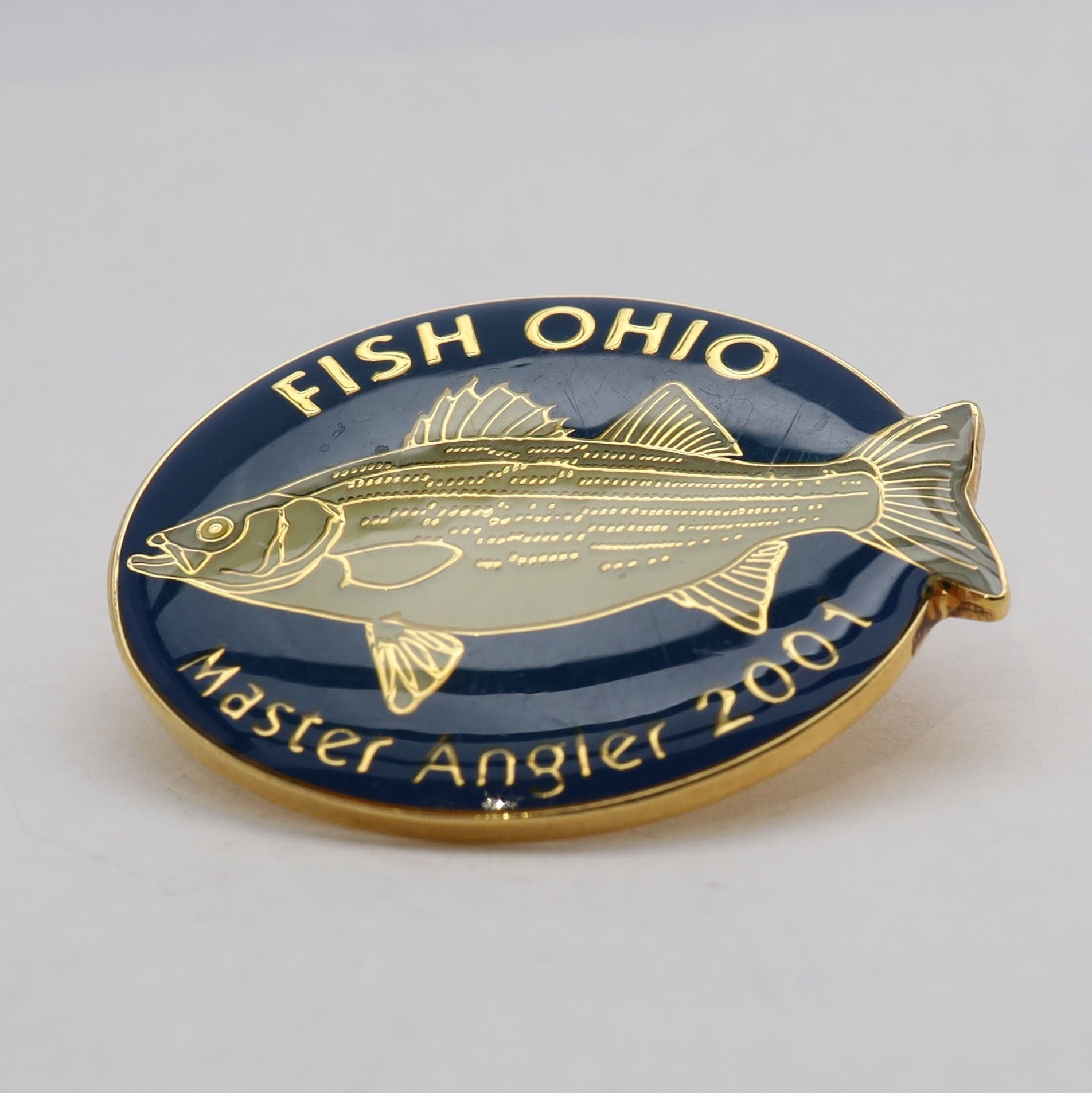 The 2001 Master Angler pin features a hybrid striped bass. Enameled in shades of grey green, the rear fin of the bass hangs over the edge of the main circle of the pin. Fish Ohio is above the fish in gold and Master Angler 2001 below it. The background is a dark blue.Use