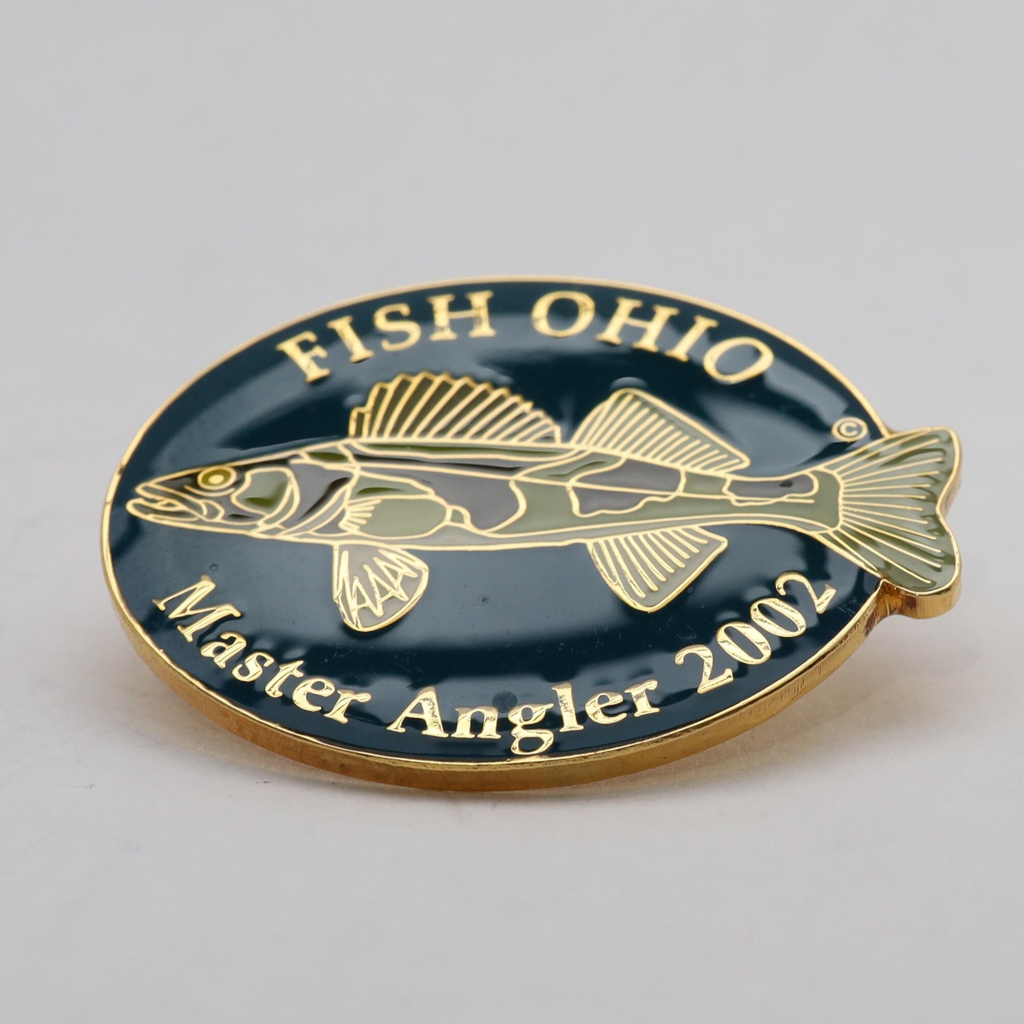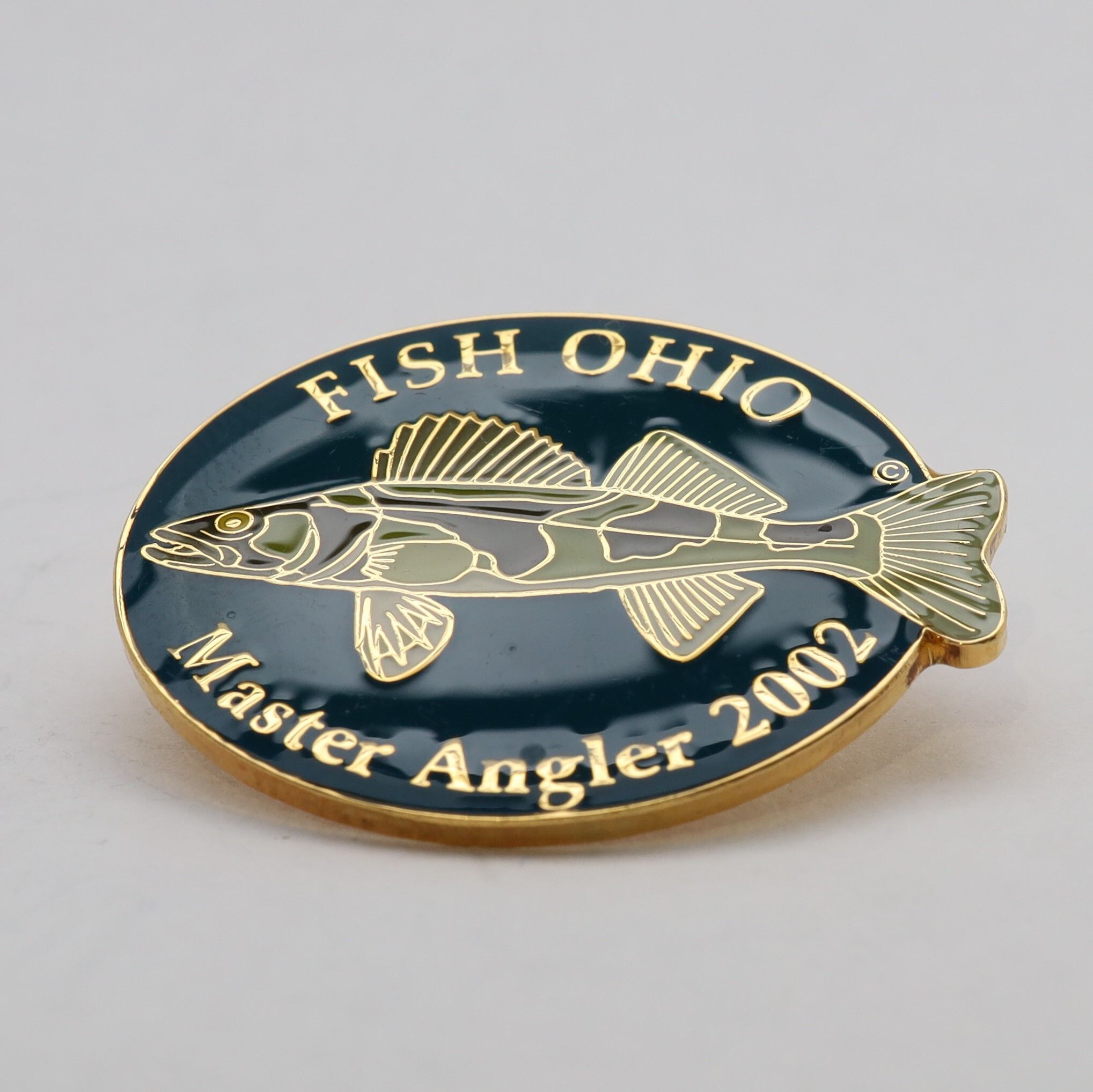 The 2002 Master Angler pin features a saugeye. The saugeye is enameled in brown green with darker brown spots on a blue black background. Fish Ohio is in gold above the fish and Master Angler 2002 below it.