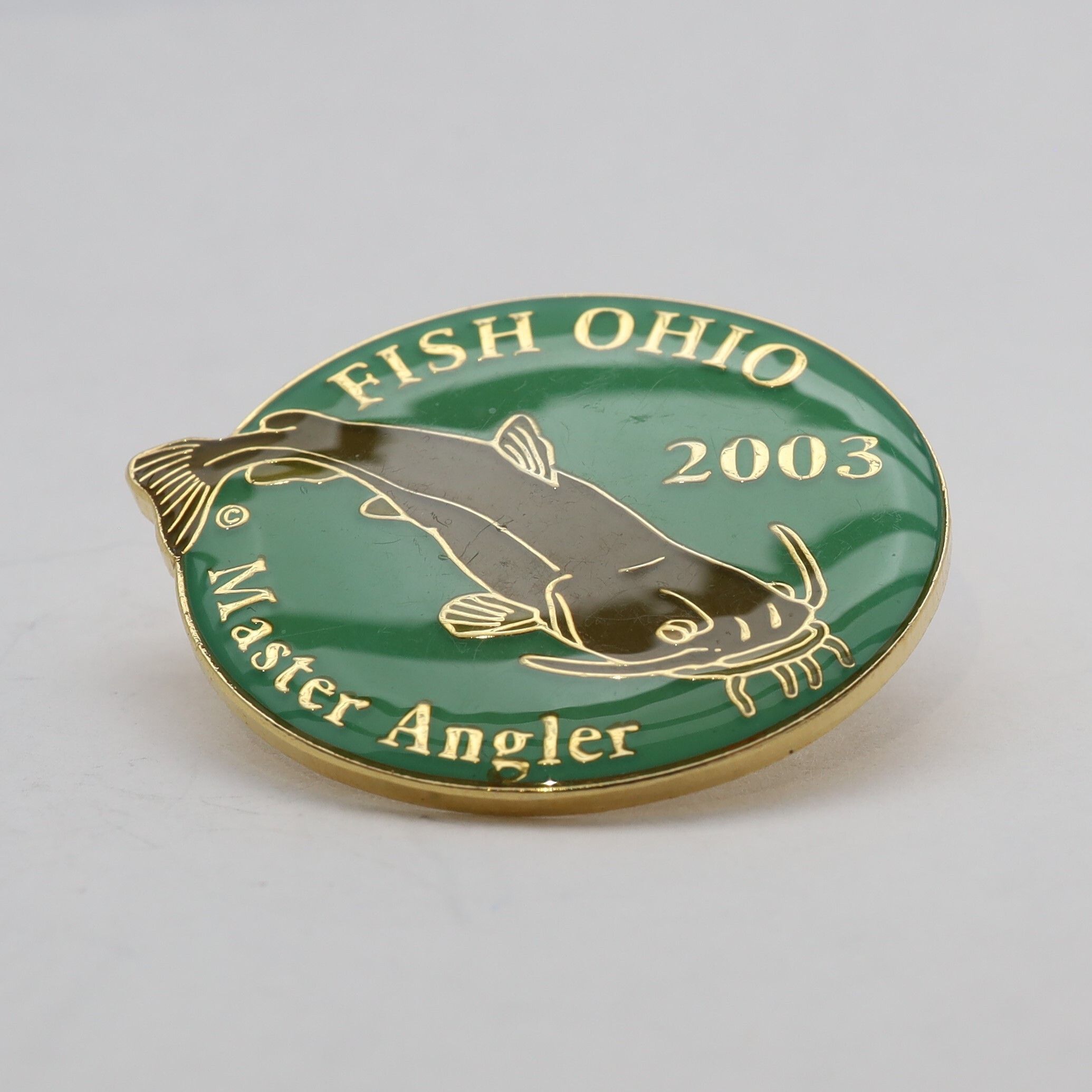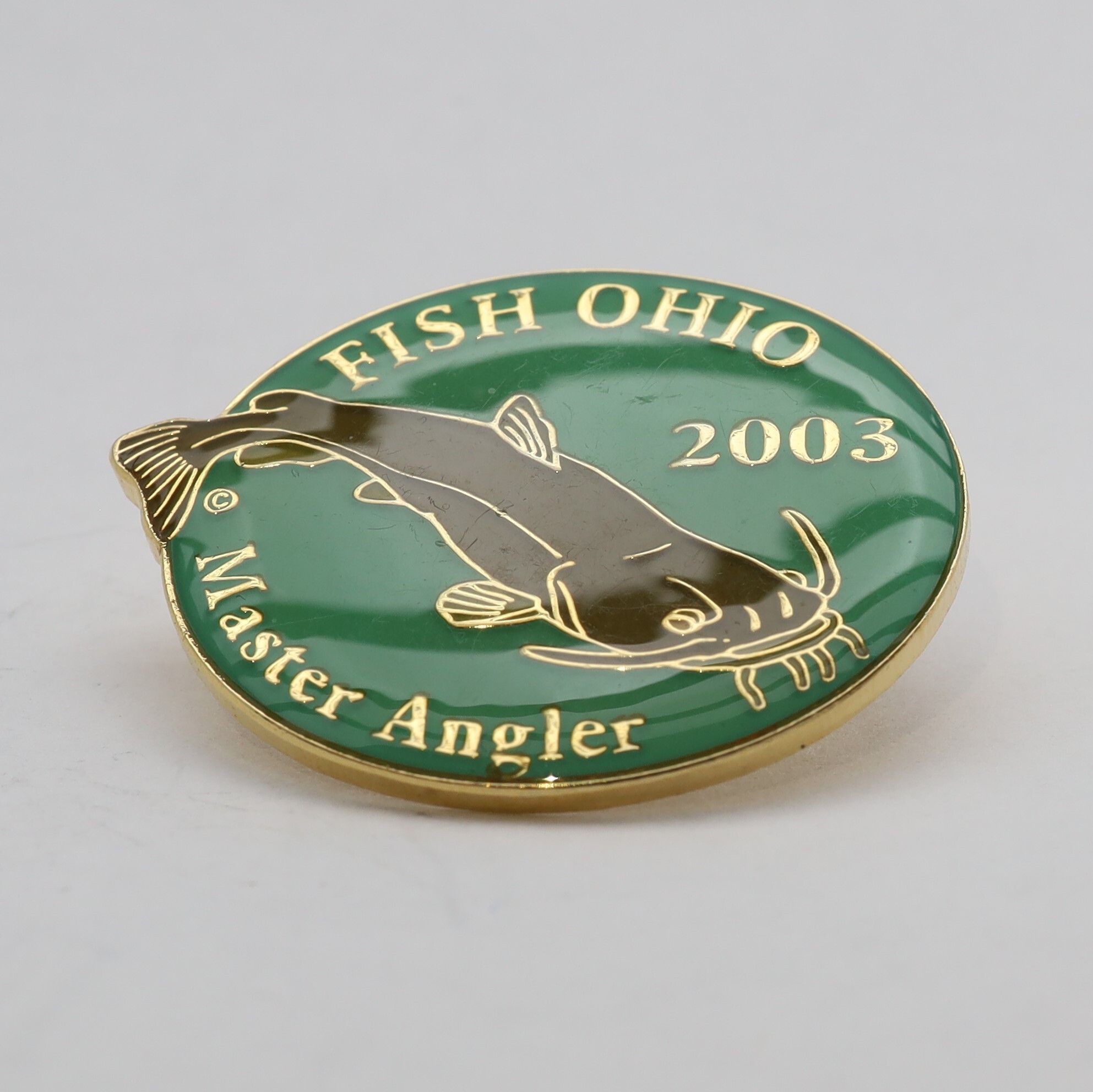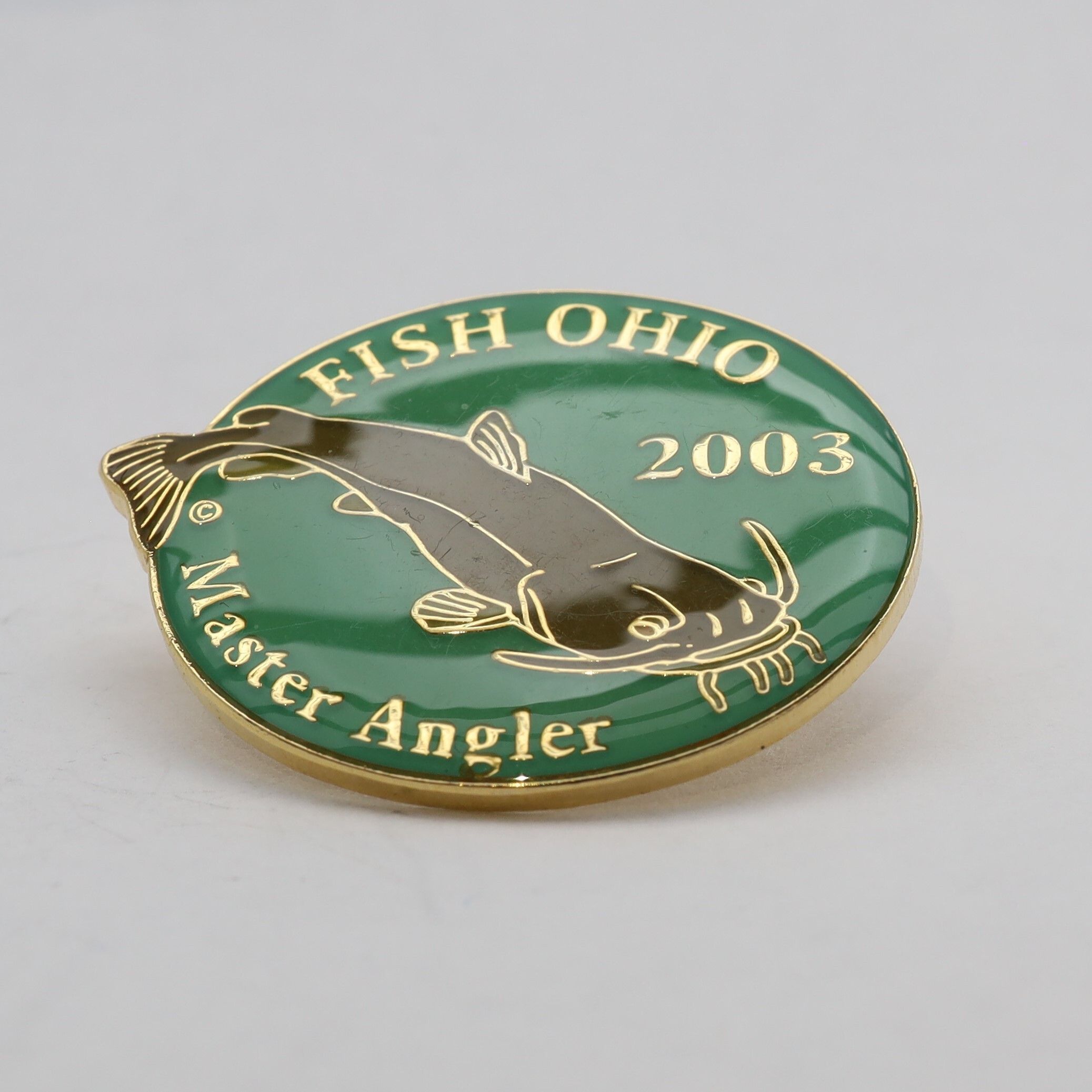 The 2003 Master Angler pin features a flathead catfish. The catfish is enameled in a green brown on a bright green background. The back fin of the fish extends outside of the round pin. Fish Ohio is in gold above the catfish. The date is below and to the right of that and Master Angler is below the fish, also in gold.Use