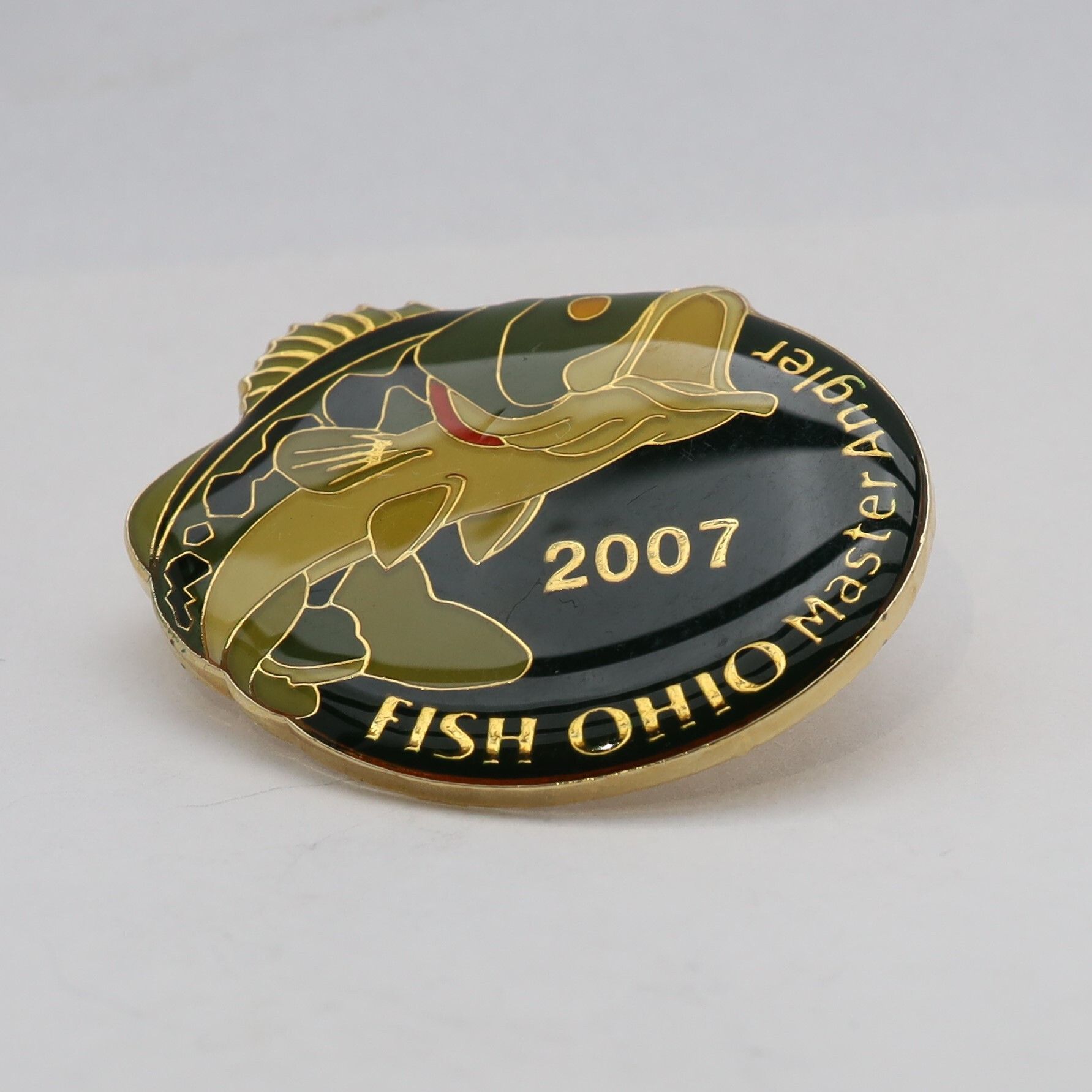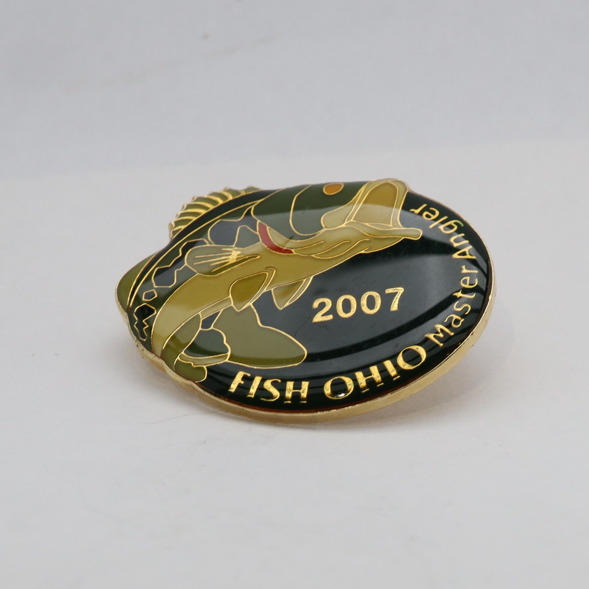 The 2007 Master Angler pin features a largemouth bass. The placement of the bass differs from earlier pins. With the open mouth toward the top and larger than the rest of the body, and the tail bent behind the fish, the bass has more depth than the previous, flatter fish. The bass is enameled in shades of green, with a lighter belly and mouth. Additionally, the visible eye is yellow, and there is a red accent on the gills. The bass on this pin is darker than the Fish Ohio counterpart, and the background is black. The date, Fish Ohio, and the words Master Angler are enameled in gold below the bass.Use