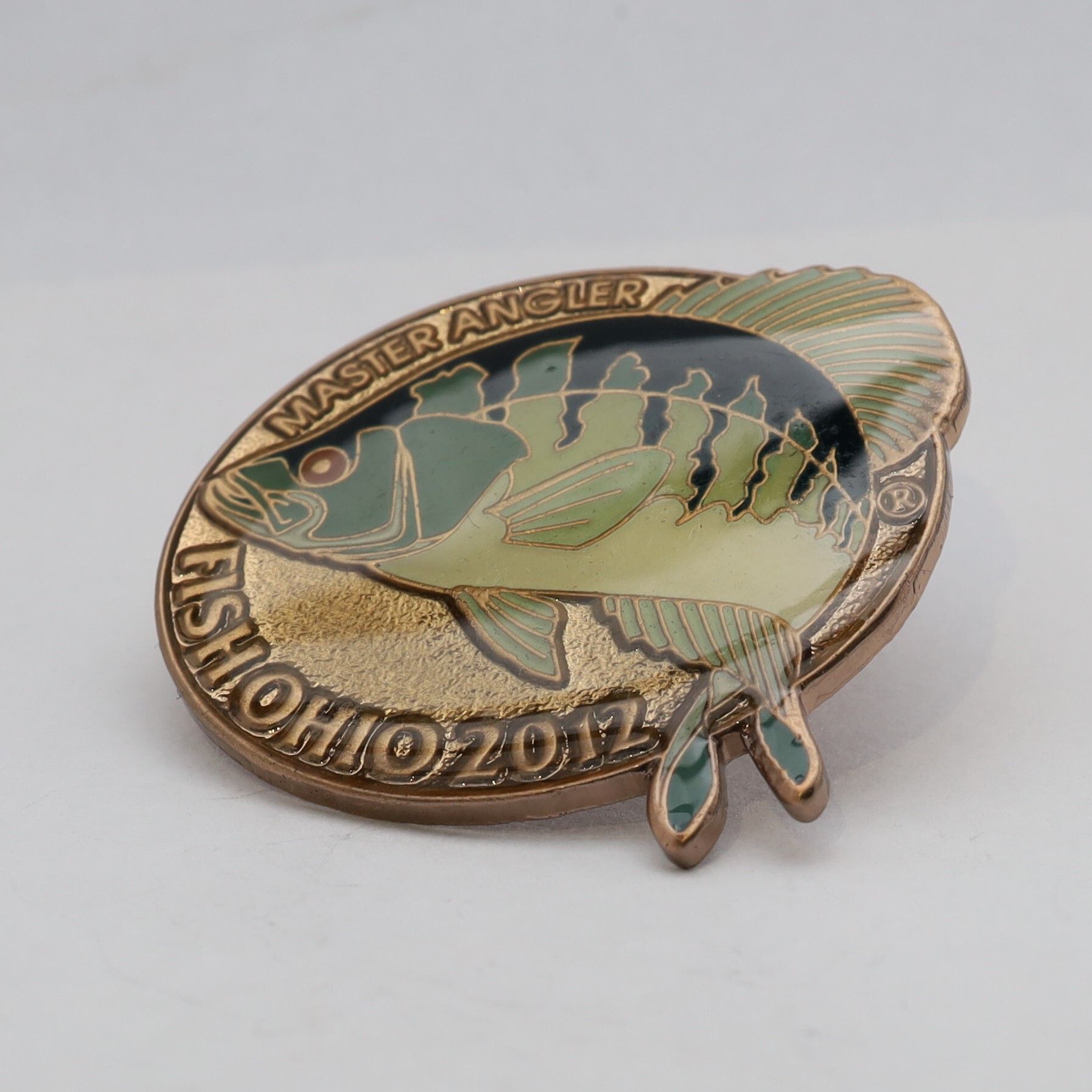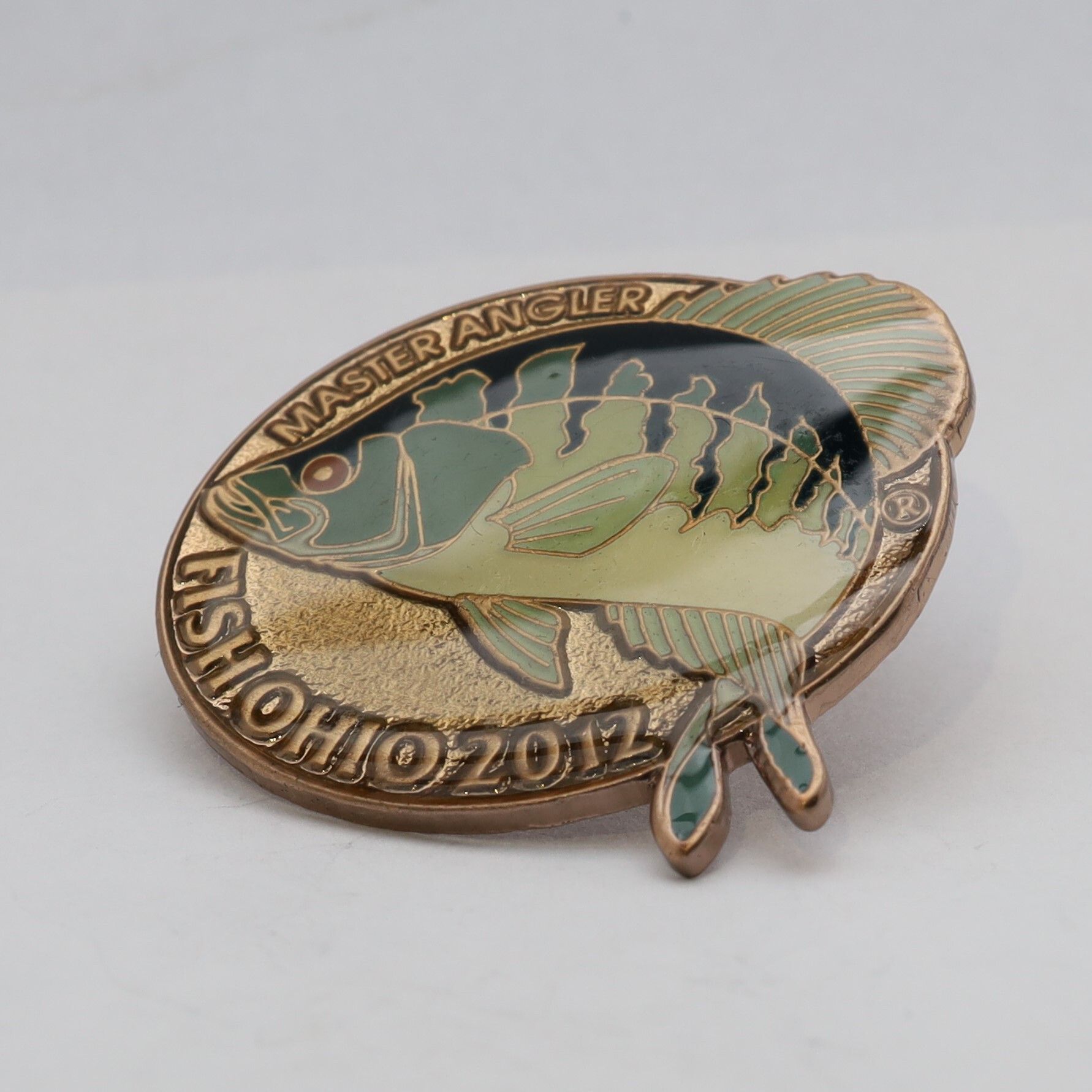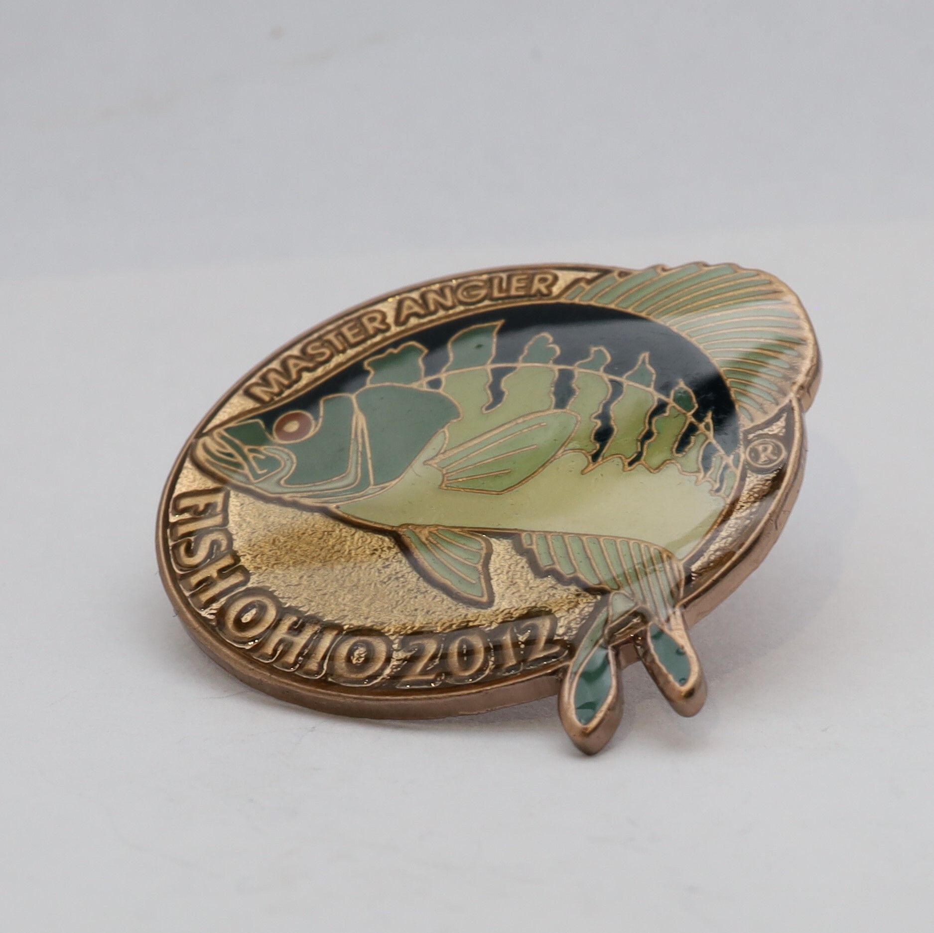 The 2012 Master Angler pin features a crappie. The fish is enameled in shades of green, with dark stripes along the back extending toward the belly. The eye is red, and the crappie extends past the edges of the round pin base on the top and bottom edges. The background is gold with the words Master Angler in all capital letters above the crappie and Fish Ohio and the date below the fish.Use
