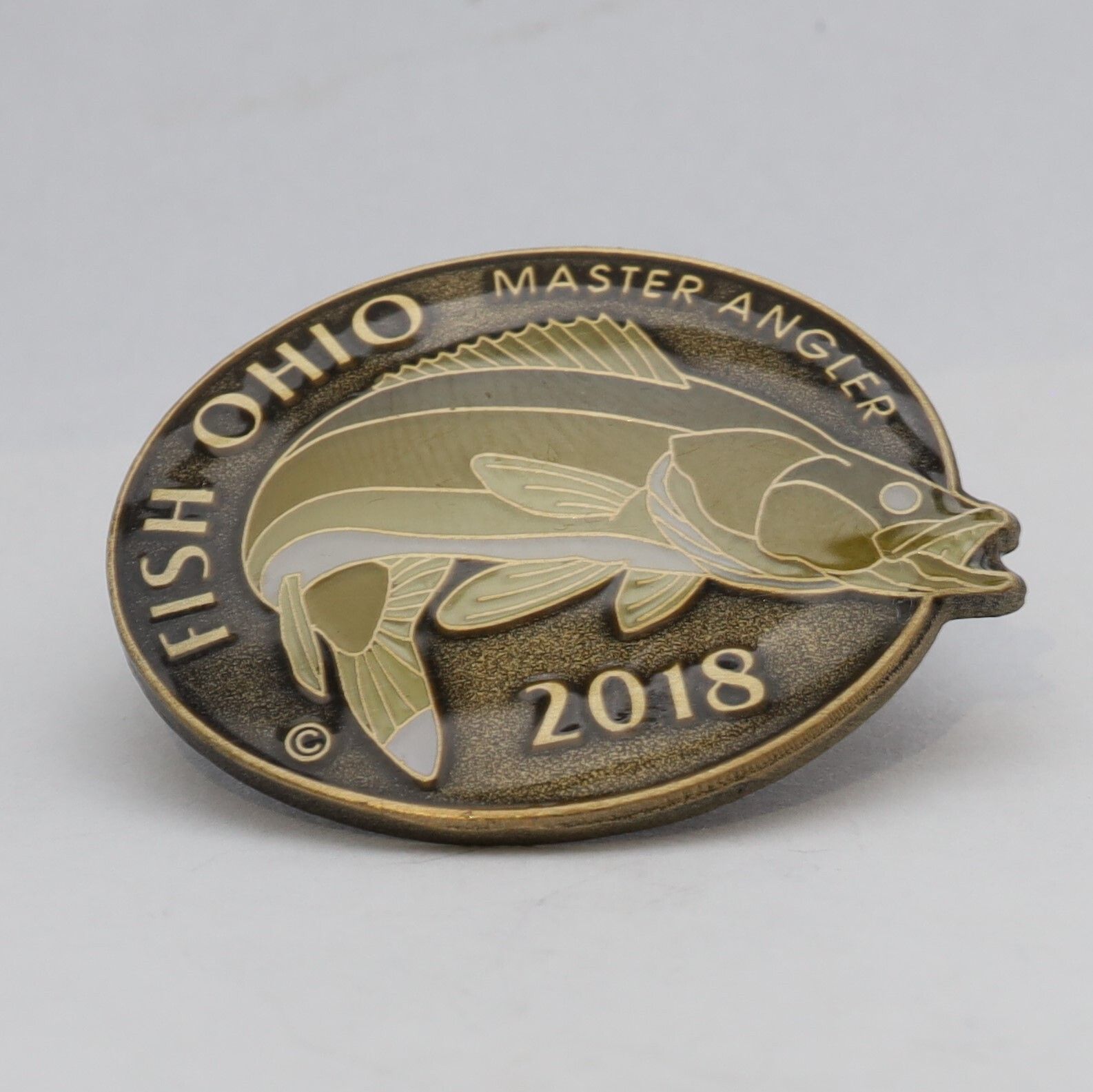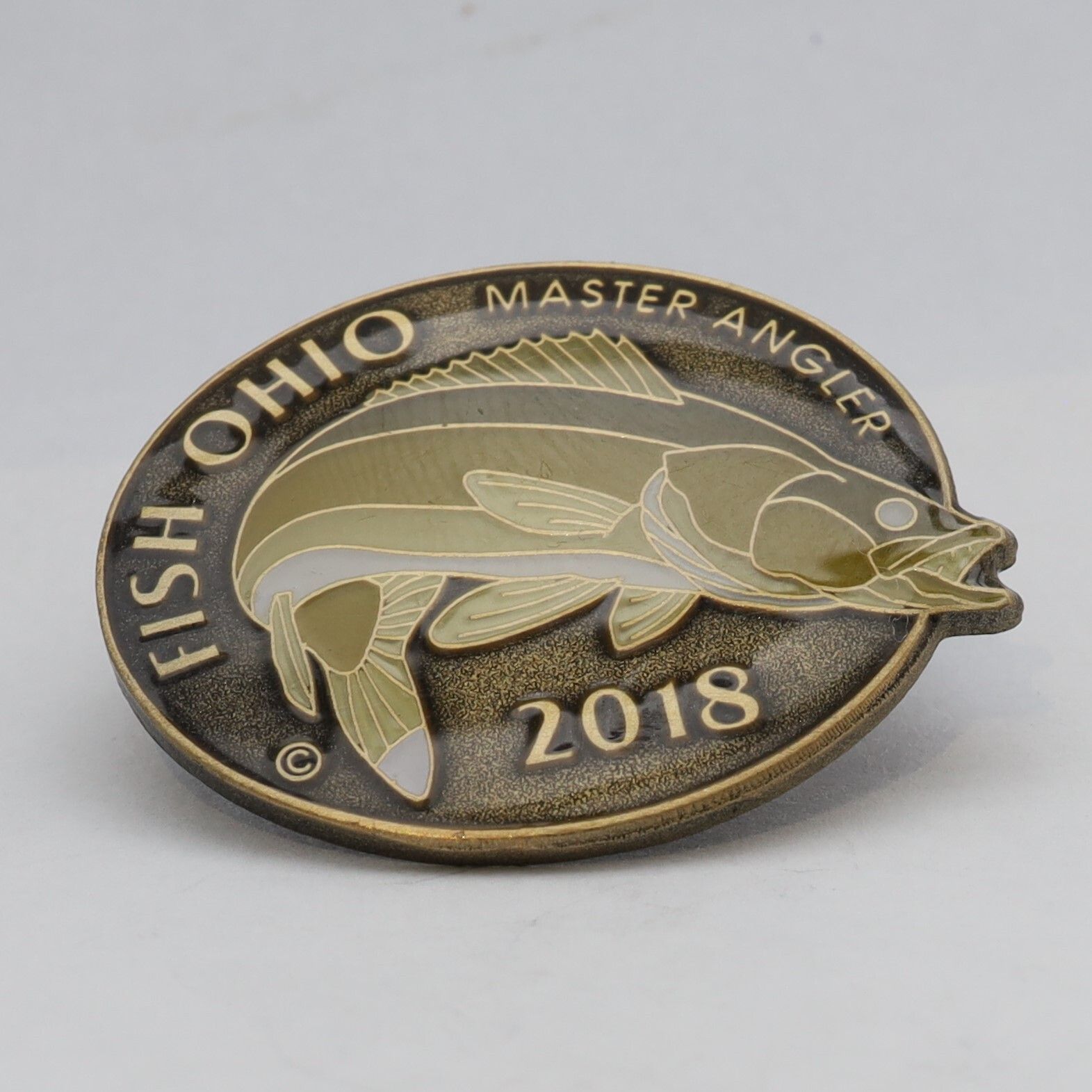 The 2018 Master Angler pin features a walleye. The fish is enameled in decreasing shades of brown, starting with a darker shade on its back and ending with a white belly. The mouth of the walleye is open and extends beyond the circular base of the pin. Fish Ohio and Master Angler are above the walleye, and the date is below it.Use