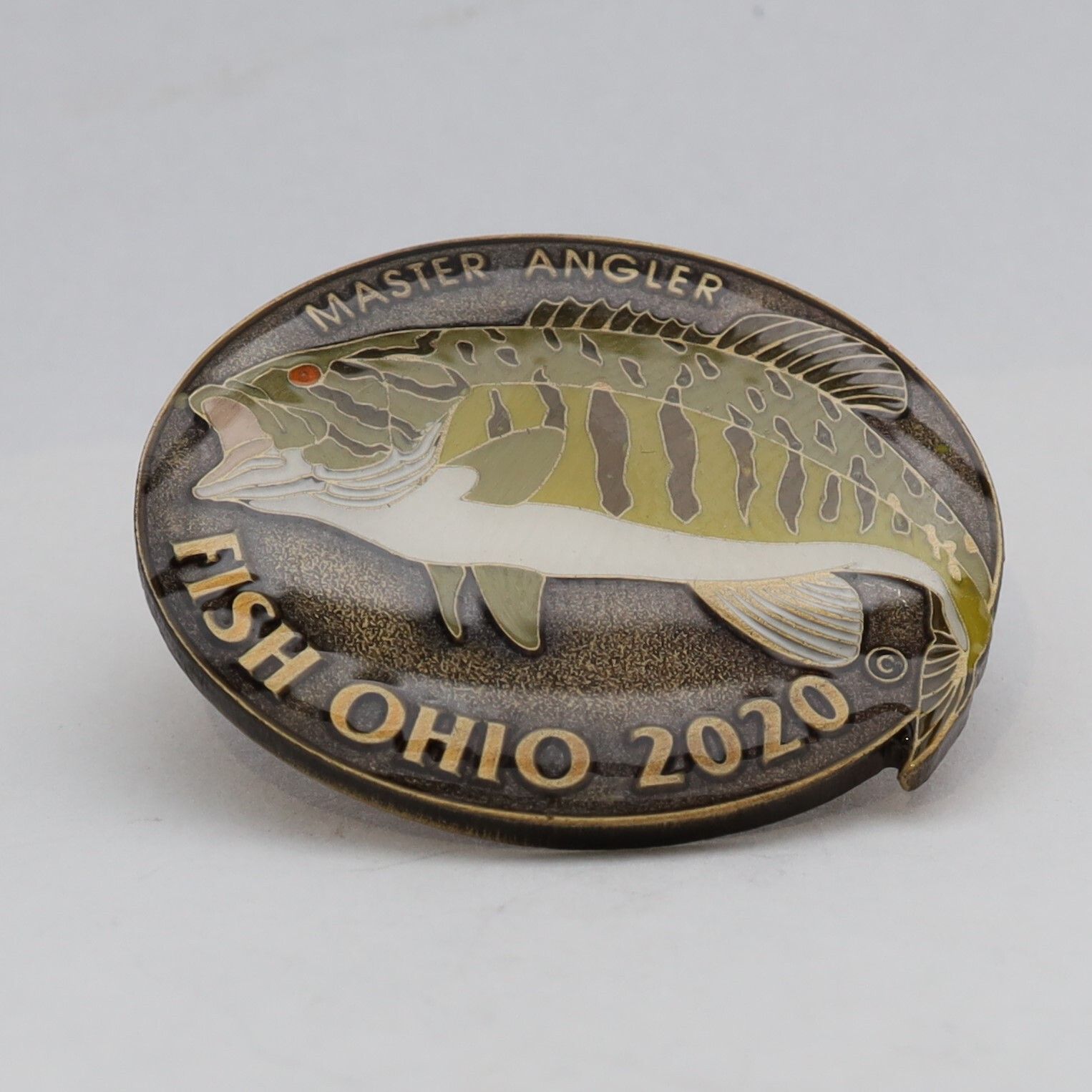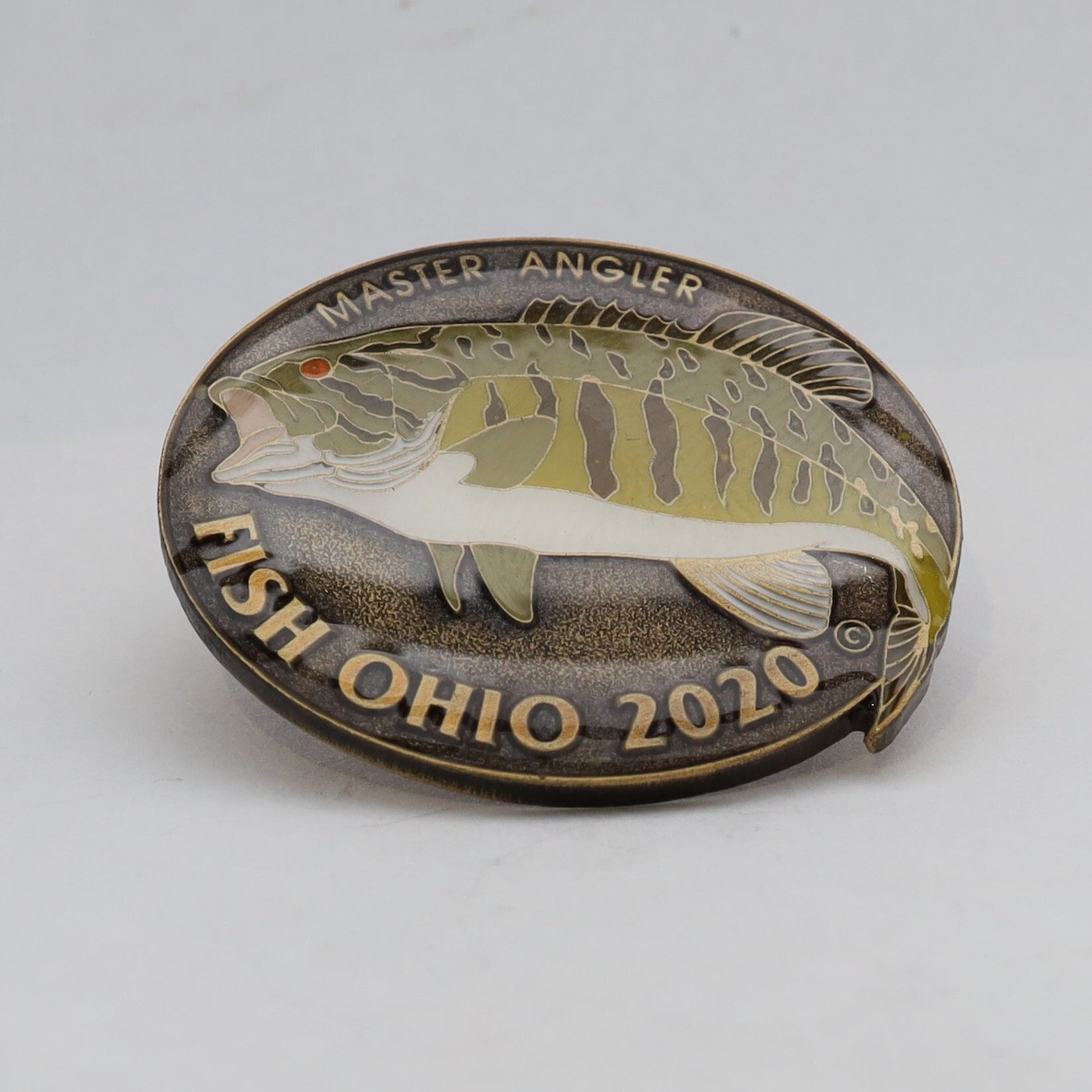 The 2020 Master Angler pin features a smallmouth bass. The pin is enameled metal with the bass in color. The Master Angler category is for anglers who catch four different Fish Ohio-qualifying species in a single year.Context