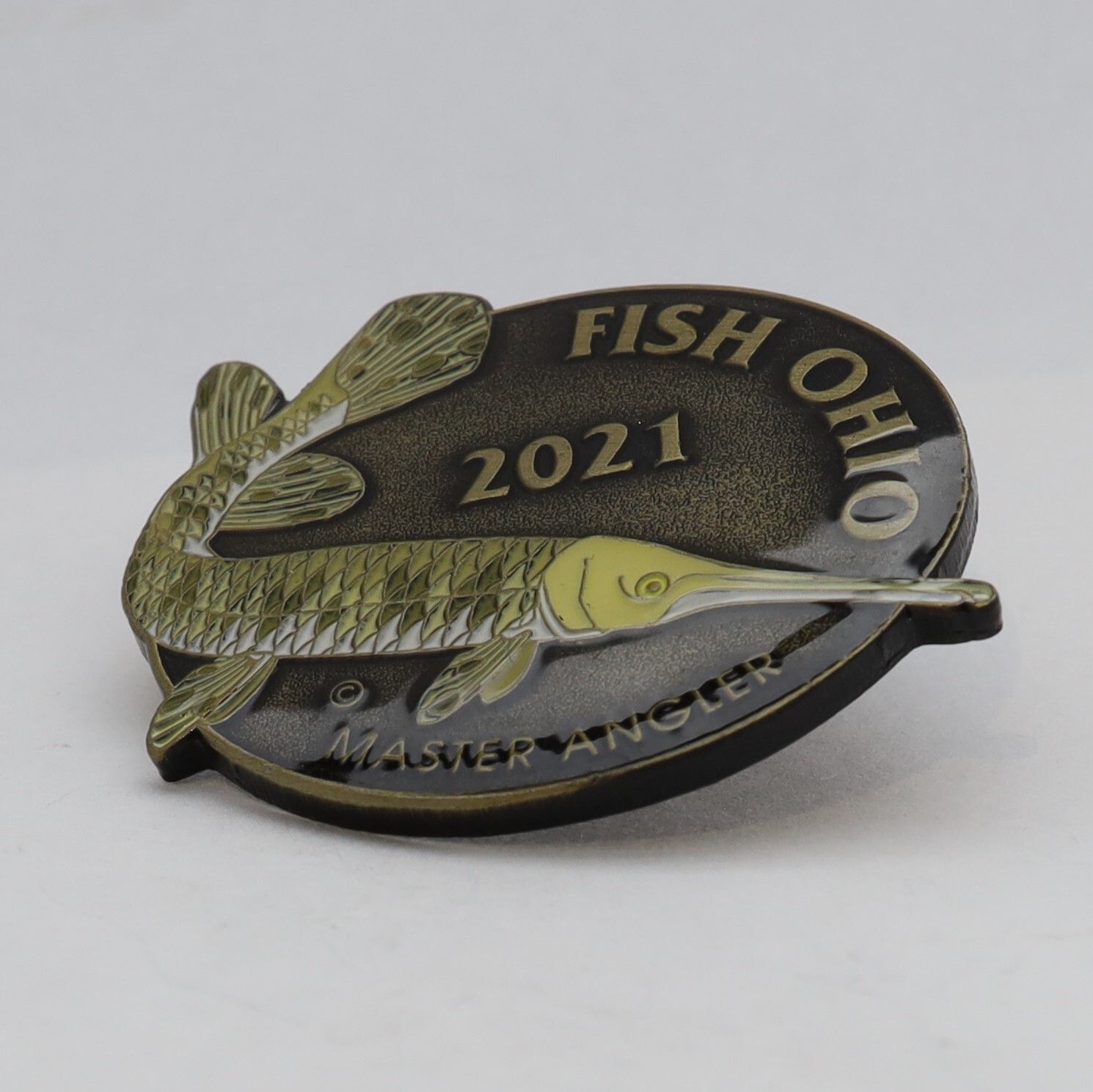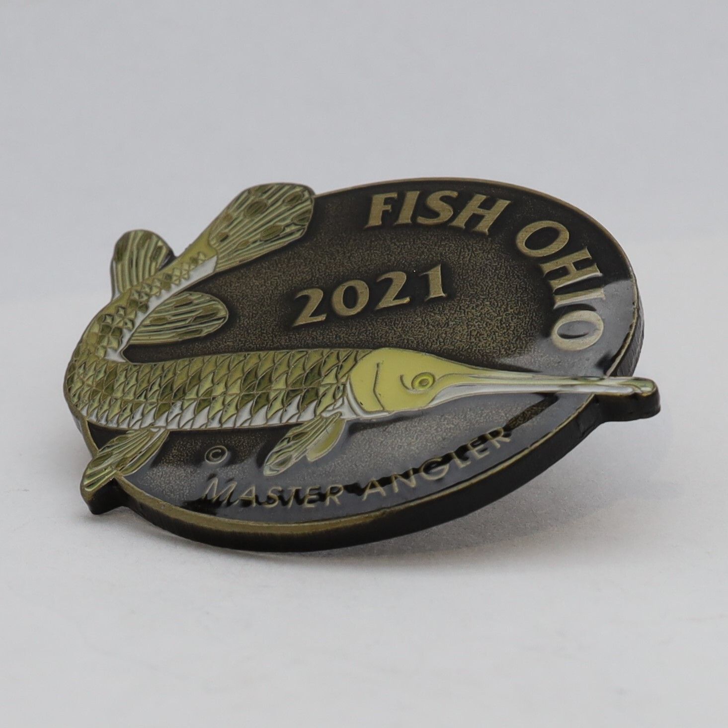 The 2021 Master Angler pin features a longnose gar. The fish's scales are shades of green with occasional dark brown spots. The belly is white. The nose and some of the fins of the longnose gar extend beyond the edge of the circular base of the pin. Fish Ohio is in bronze around the edge of the pin and the date is centered just above the fish. Master Angler is in the same color below the gar.Use