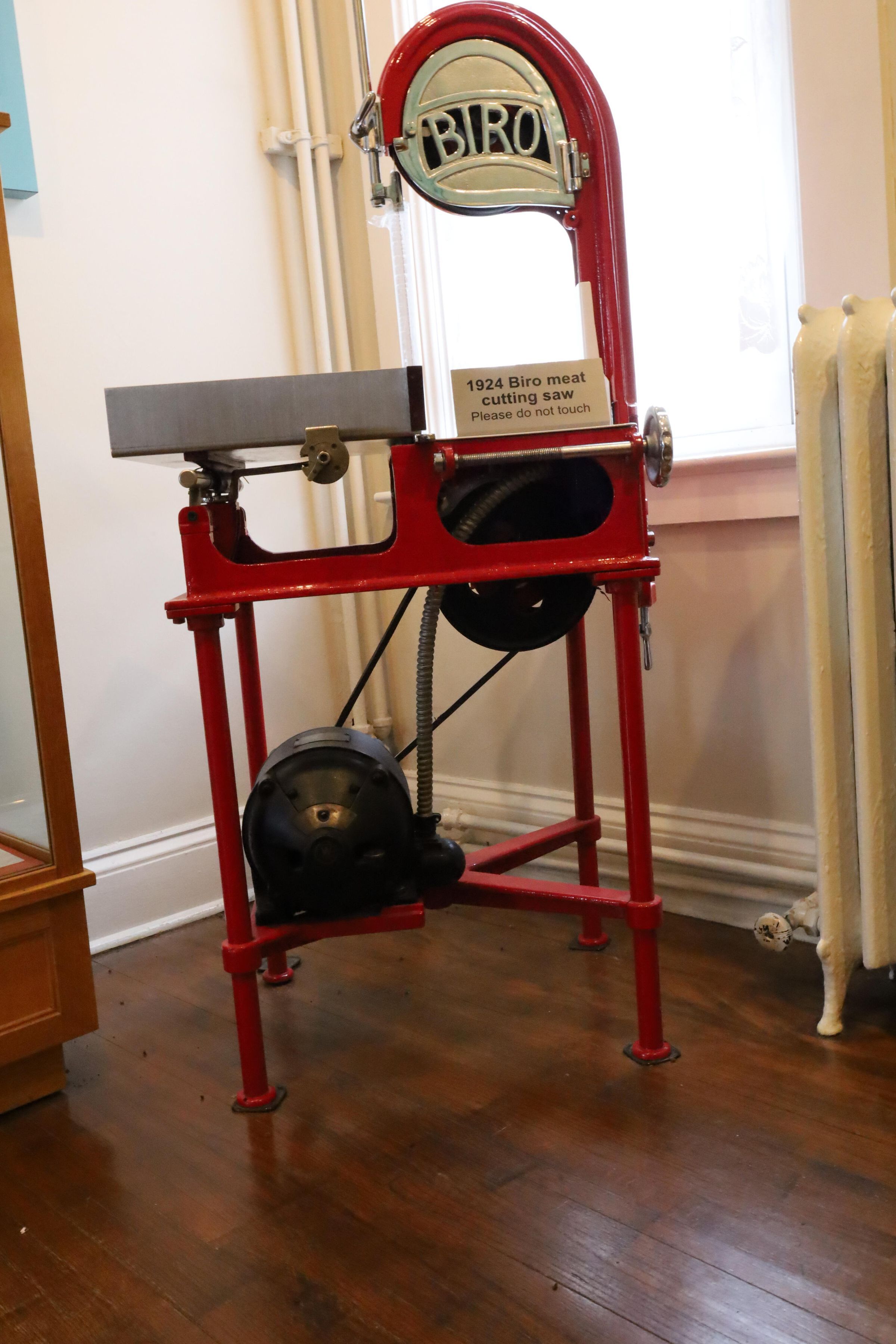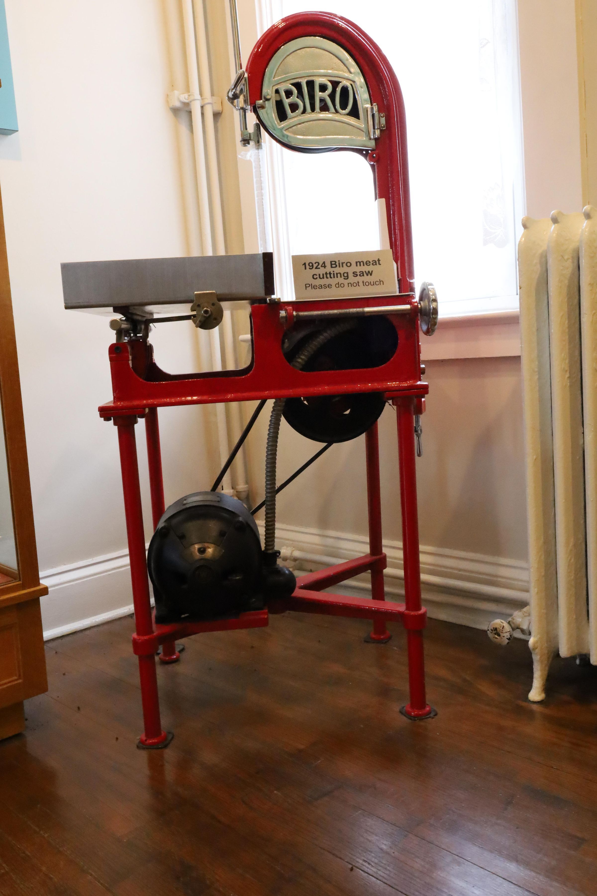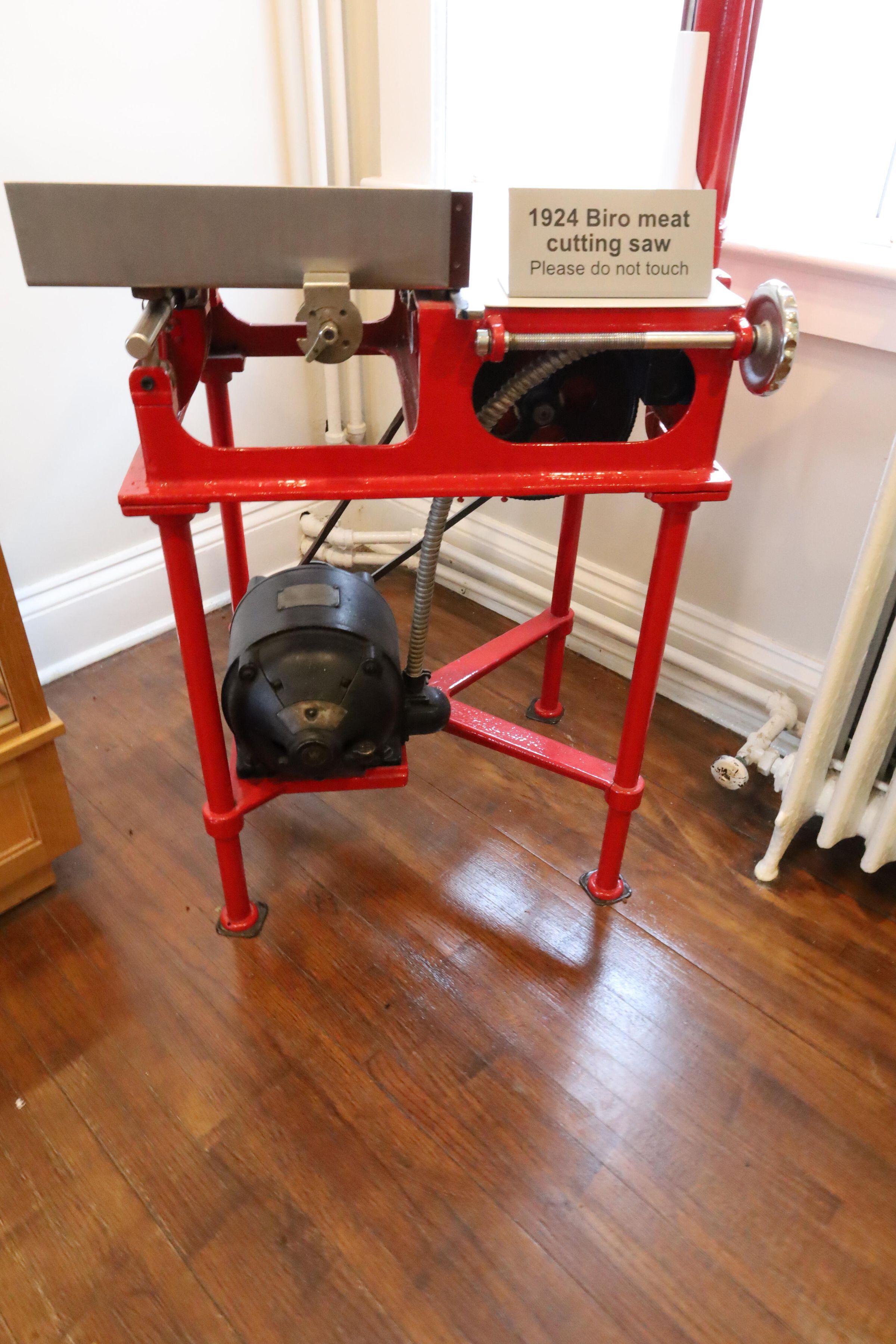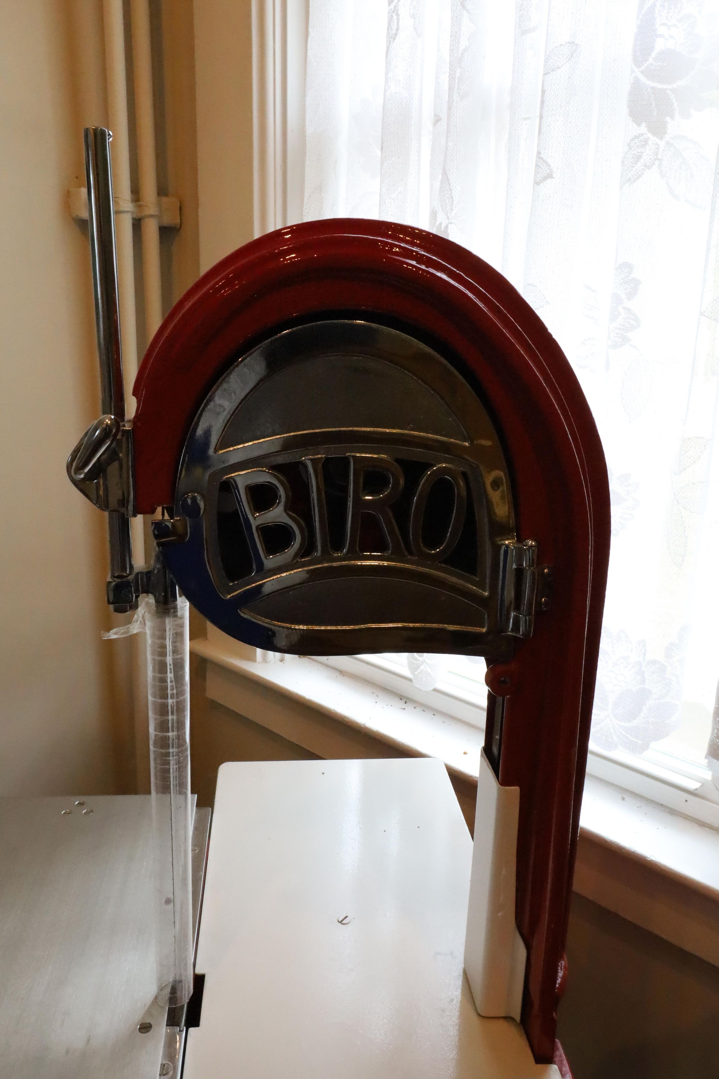 This is a restored red enameled meat cutting saw 1924 manufactured by Biro Company.