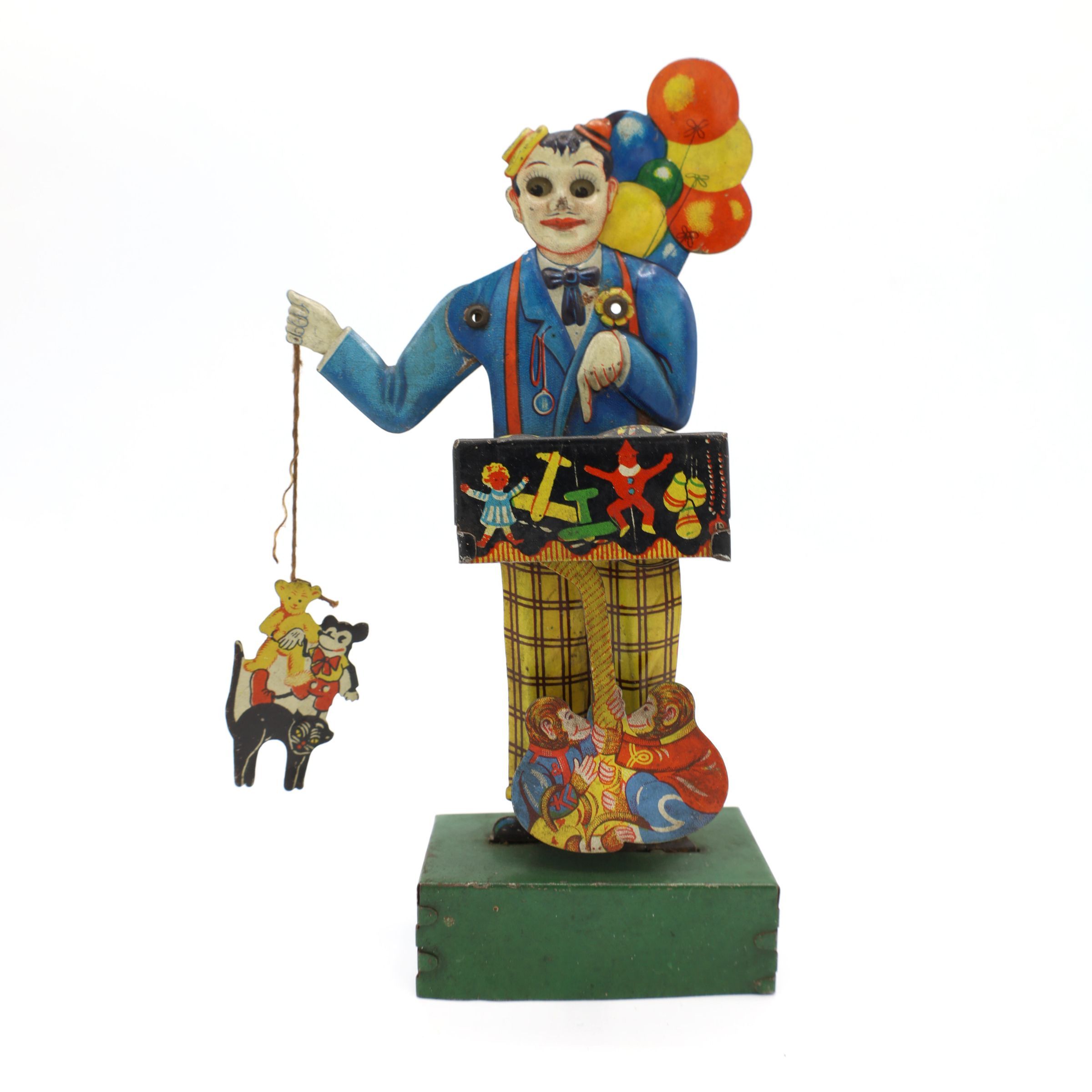The toy is shaped like a balloon vendor. The vendor is holding a box packed with a wide array of toys. He holds a toy display in his right hand with a teddy bear, Mickey Mouse, and a black cat in his hand. Swinging monkeys are at his feet.Context