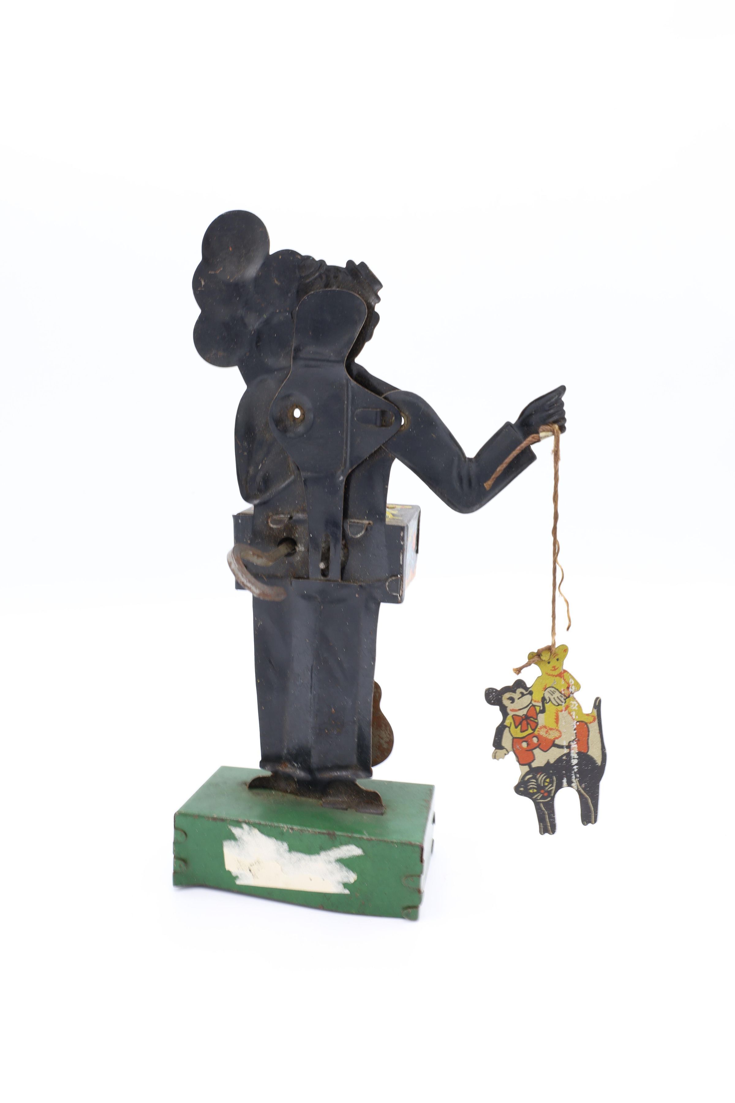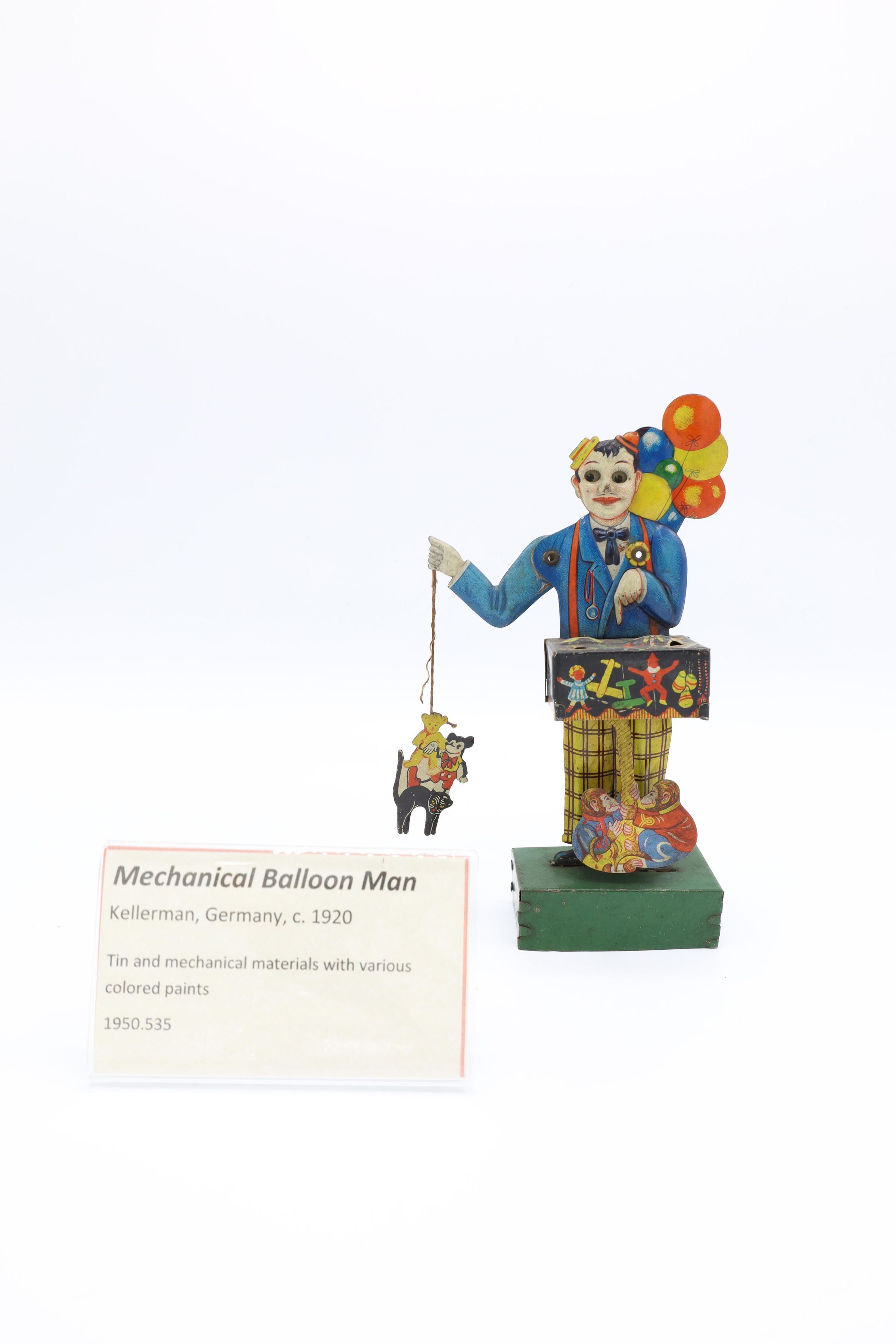 Spring-activated tin toys originated in Germany in the 1850s. In the late 1880s, offset lithography was used to print designs on tinplate. After the colorful designs were printed on the metal, they were formed by dies and assembled with small tabs. The lightweight nature of the toys allowed them to be shipped less expensively and easier than the heavier cast iron toys.Location