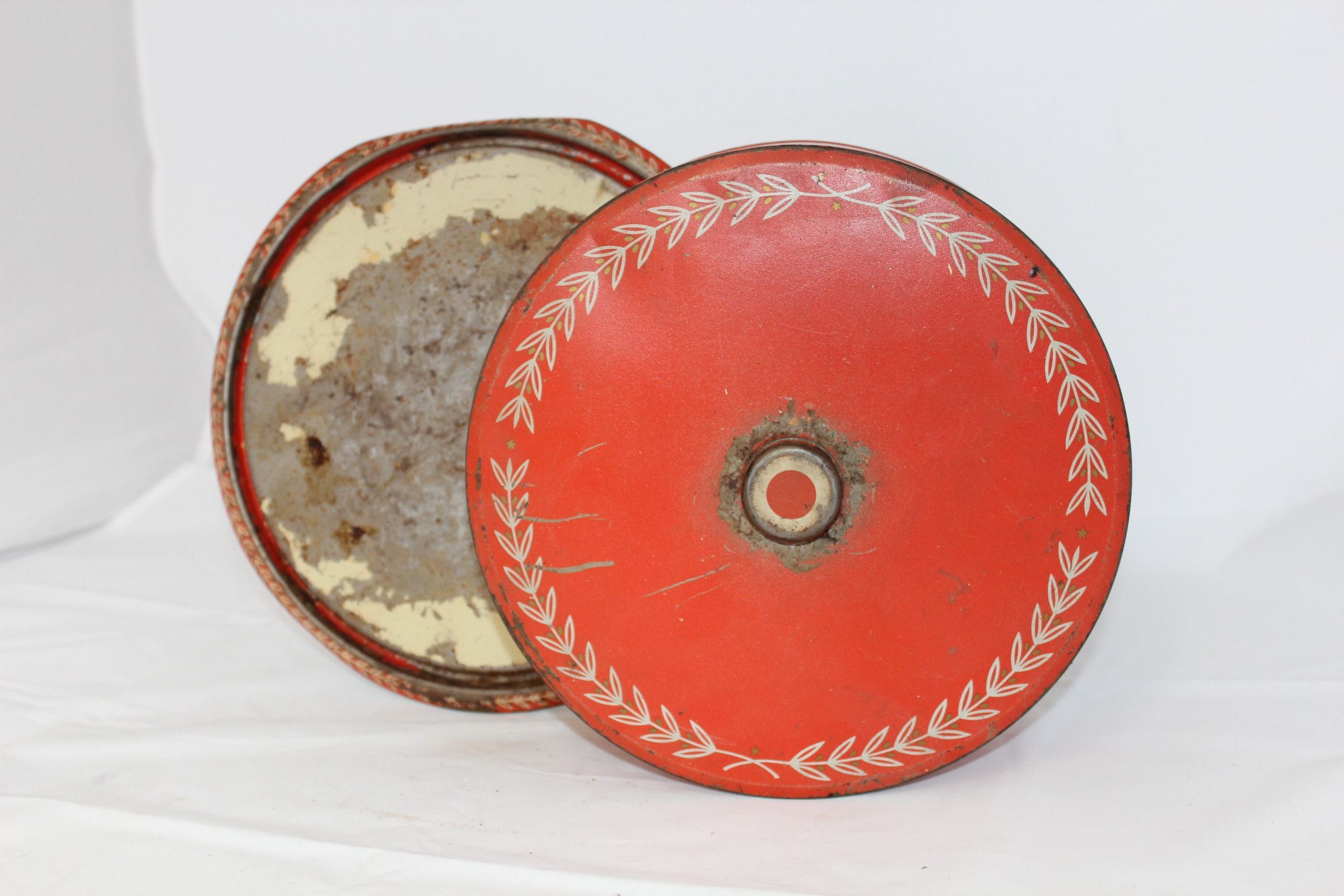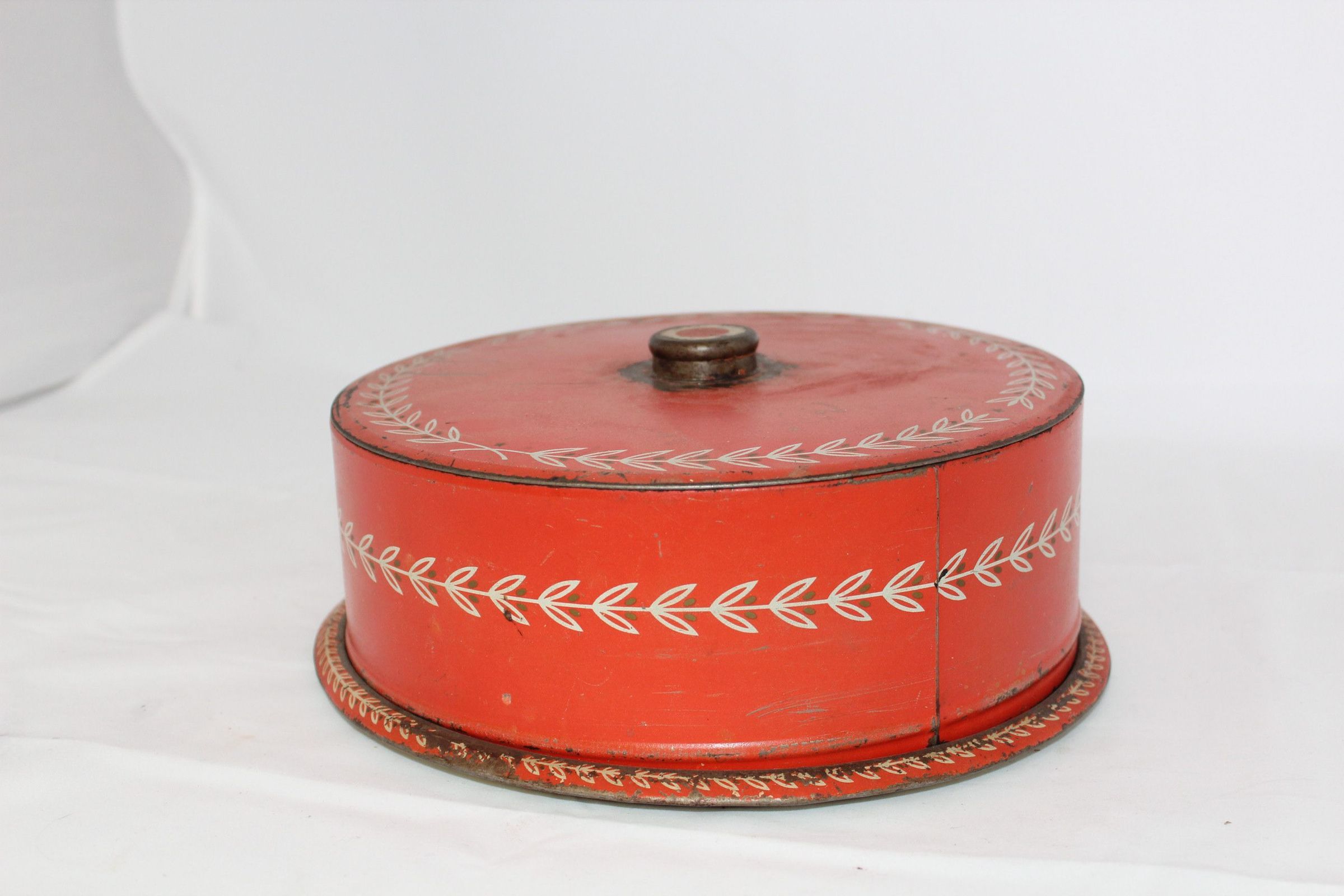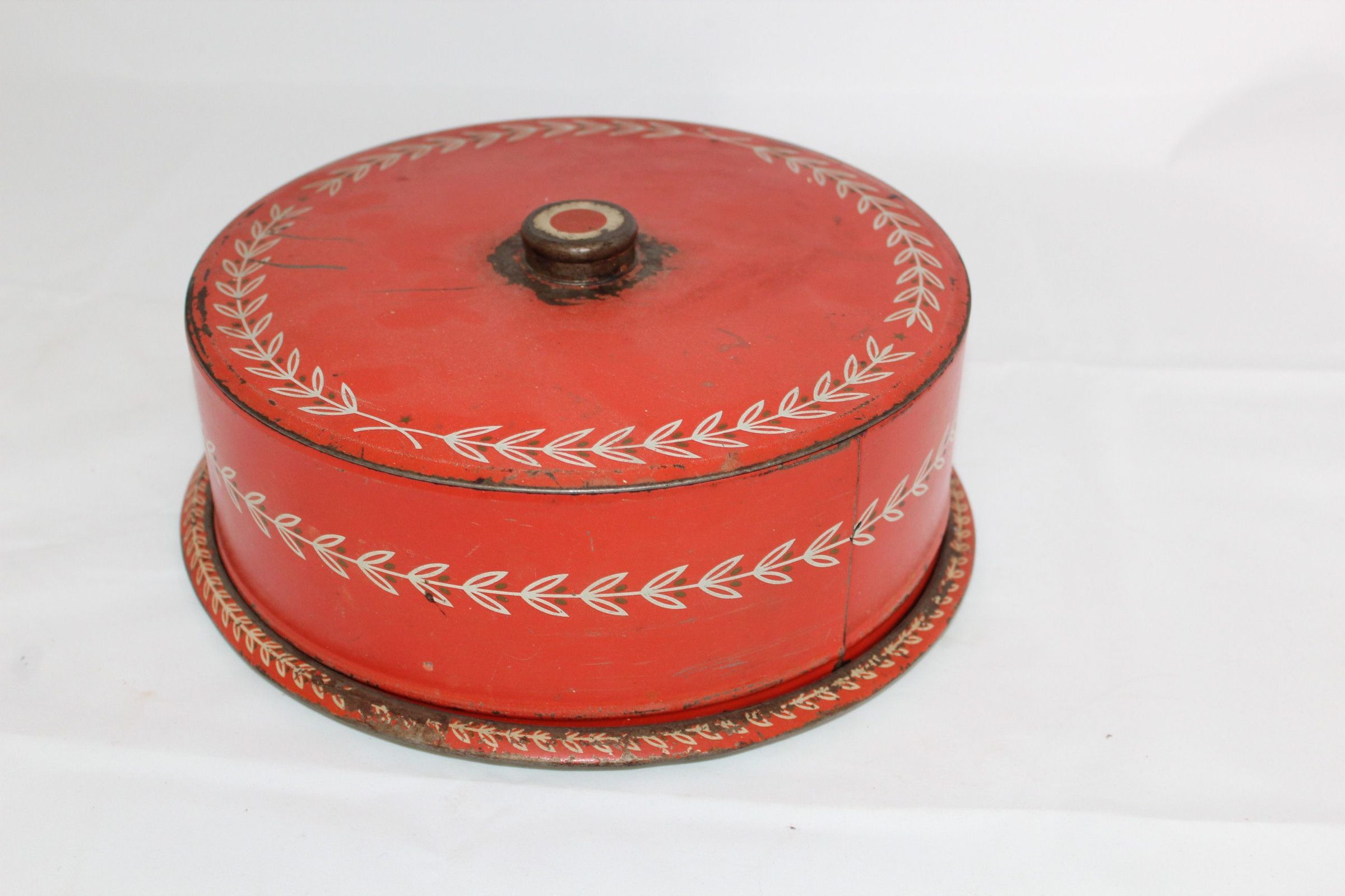 The example shown here is painted metal with a simple vine design on both the cover and the plate of the keeper. It likely dates to the 1940s and may be missing the metal frame that allows it to be used as a cake carrier.Cataloged By