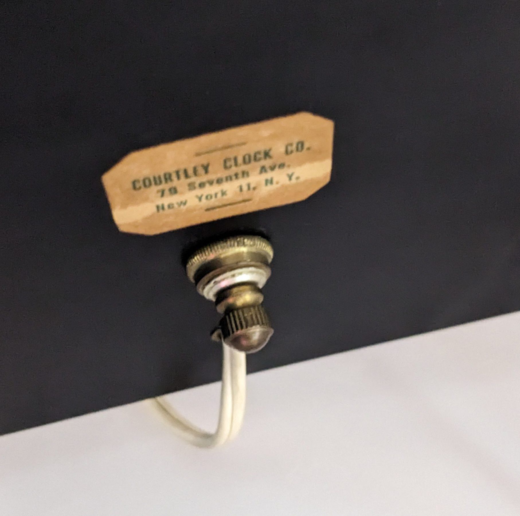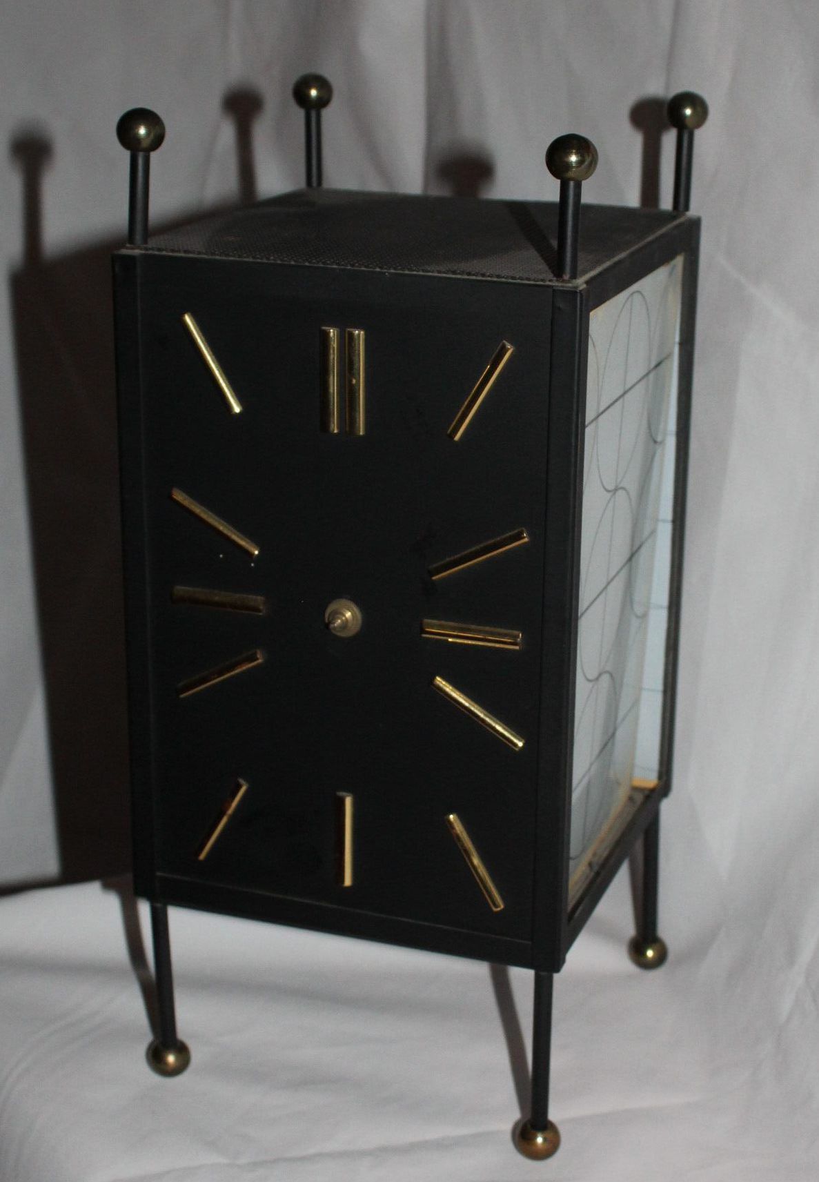 Manufactured by the Courtley Clock Company of New York, NY, this mantel clock has two frosted glass sides and gold accents. The majority of the clock is black metal, including the feet and corresponding pieces protruding from the top. The glass sides show a geometric pattern in black printed on the frosted glass.