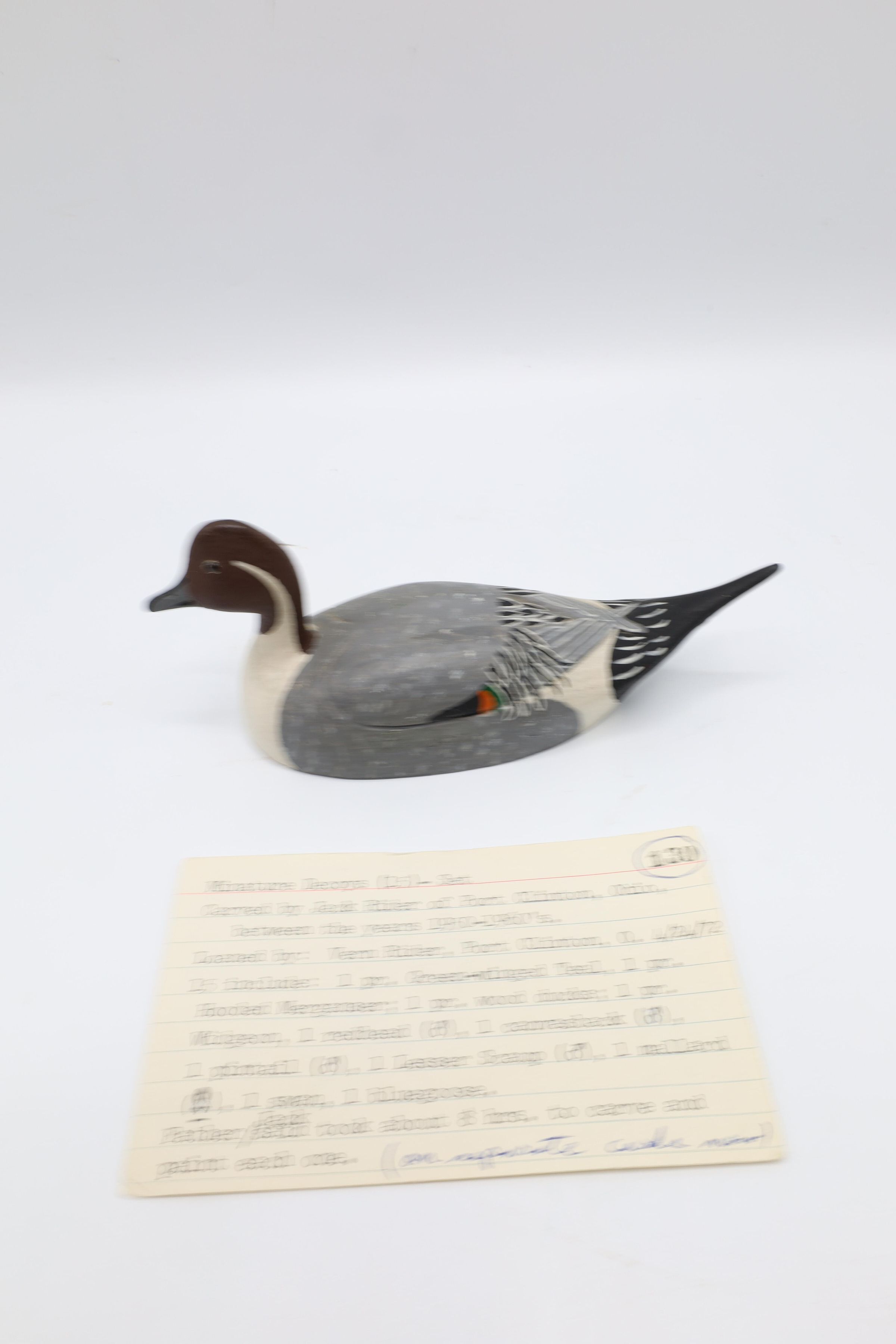 The fine detail on the feathers of this Pintail drake makes the miniature distinctive. It was carved by Jack Rider, a famous decoy carver from Port Clinton, Ohio, in the 1950s or 1960s.Context