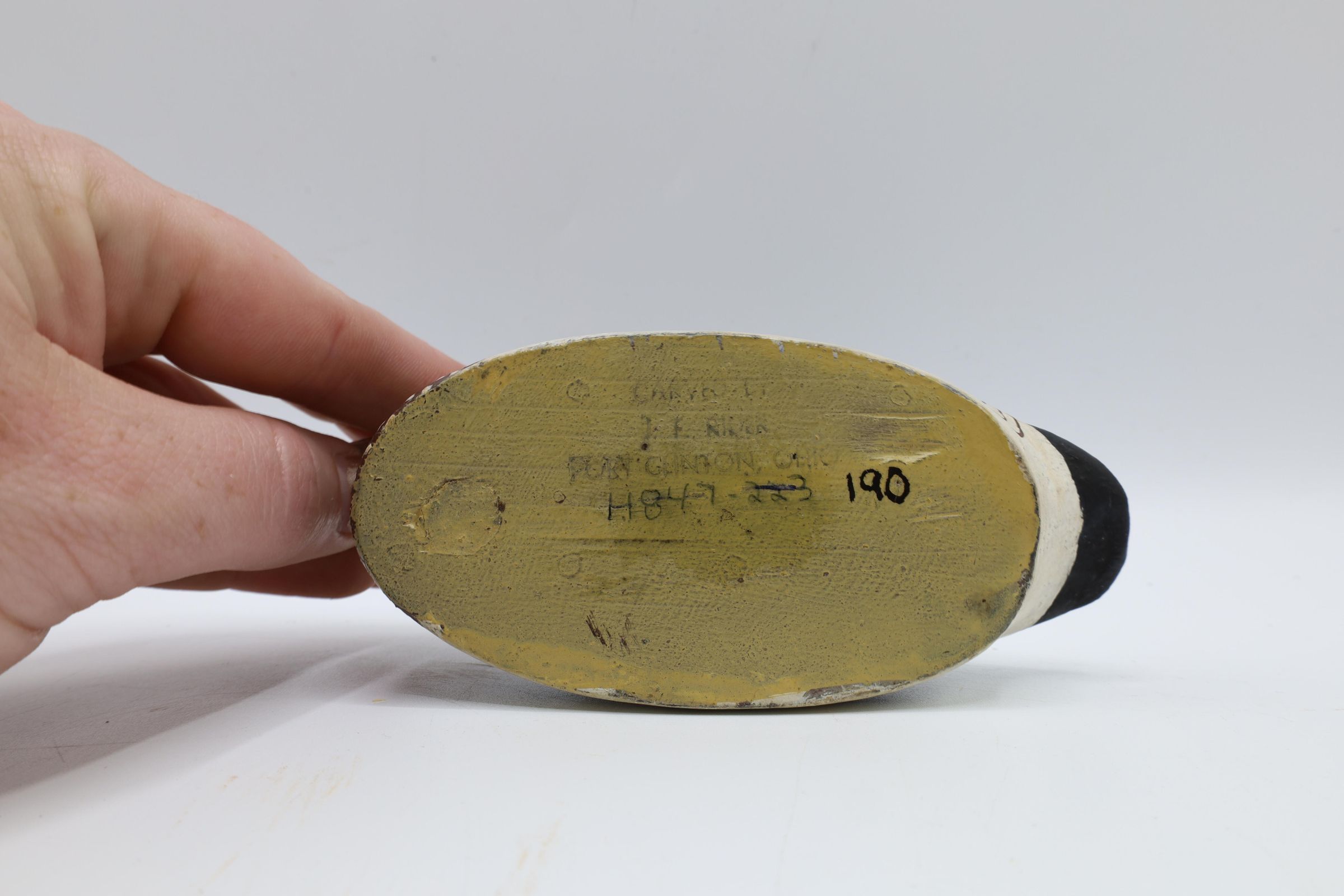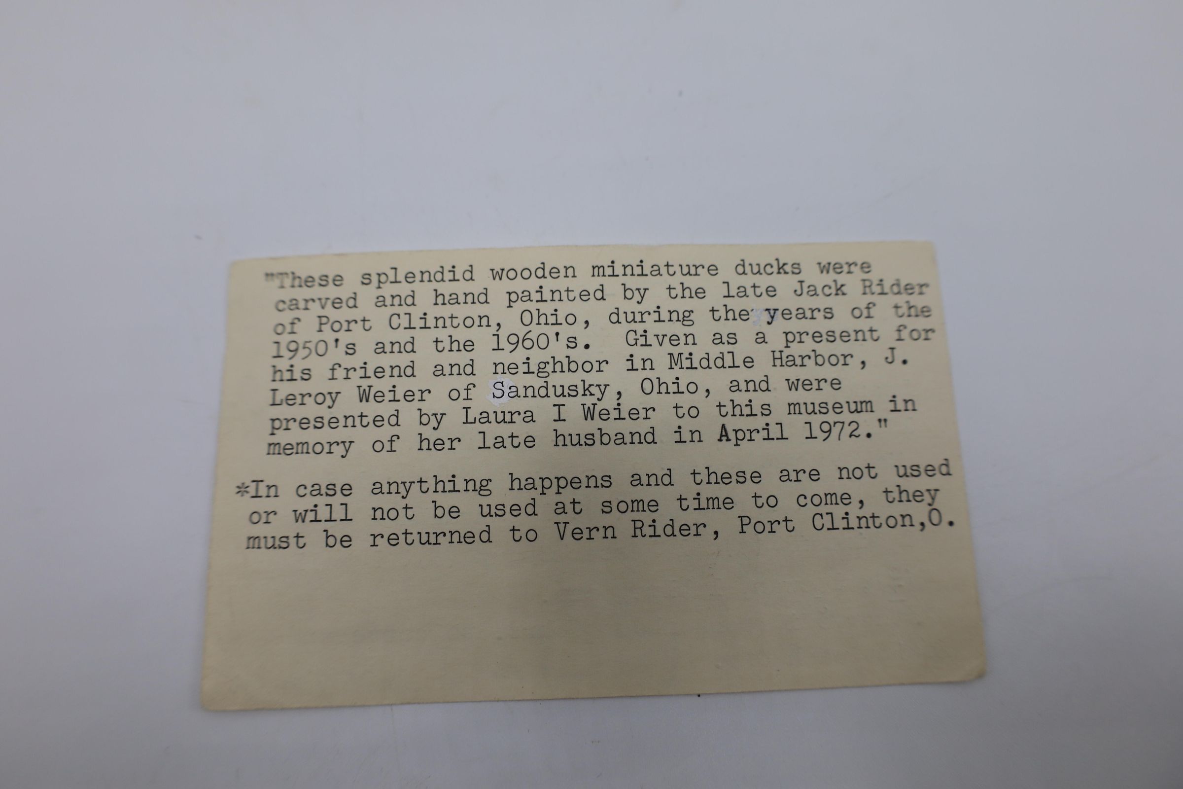 Jack Rider (1881-1967) began carving decoys after his retirement as a waterworks employee. He began carving them in 1950, initially carving only drakes. The early examples of Rider’s work did not yet fully reflect the style of his later work. Over the years, as the demand for Rider decoys increased, his style became simpler and more streamlined. His son Vernon Rider (1912-1983) was instrumental in maintaining Jack Rider’s legacy as a talented decoy carver.Collection
