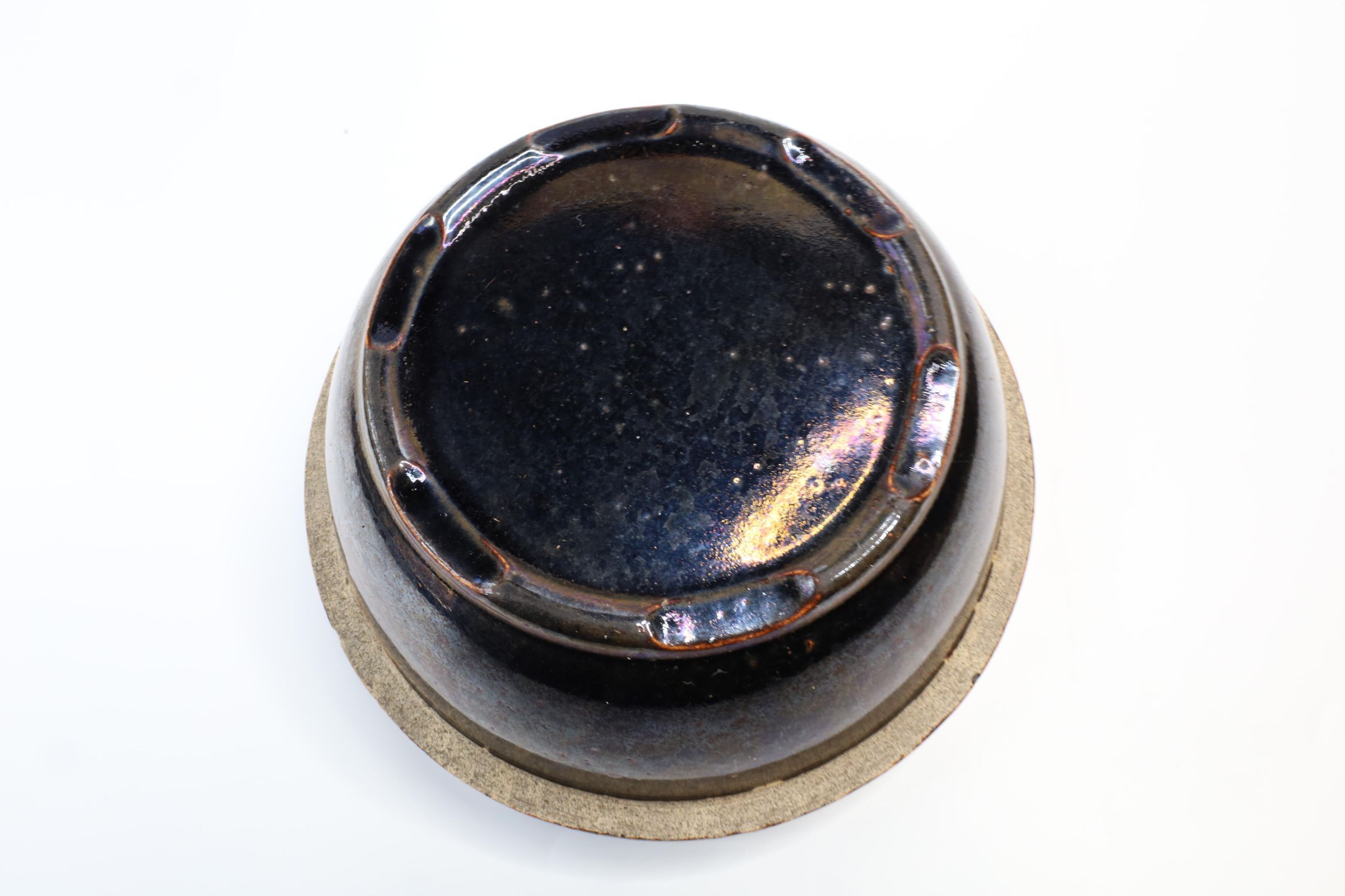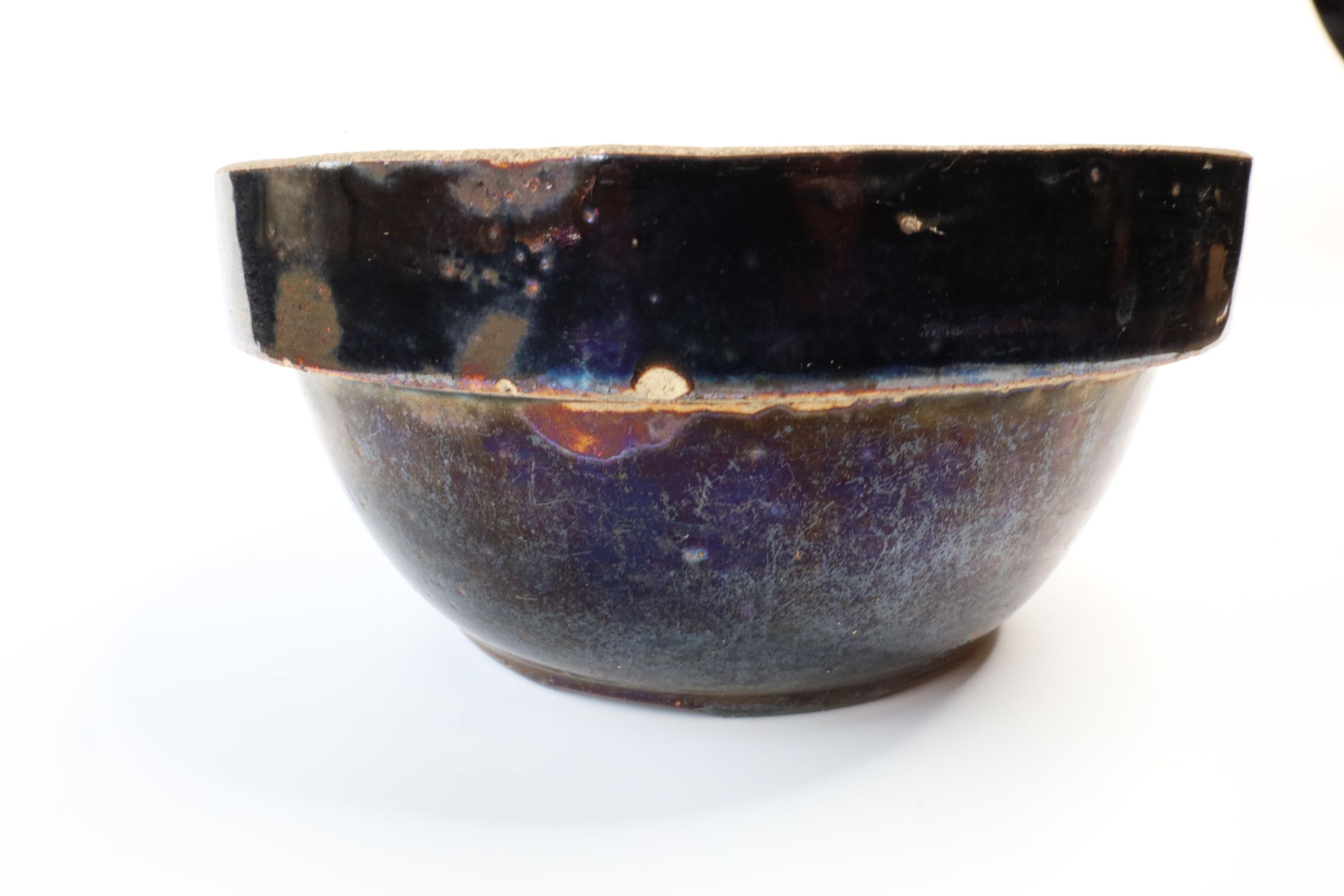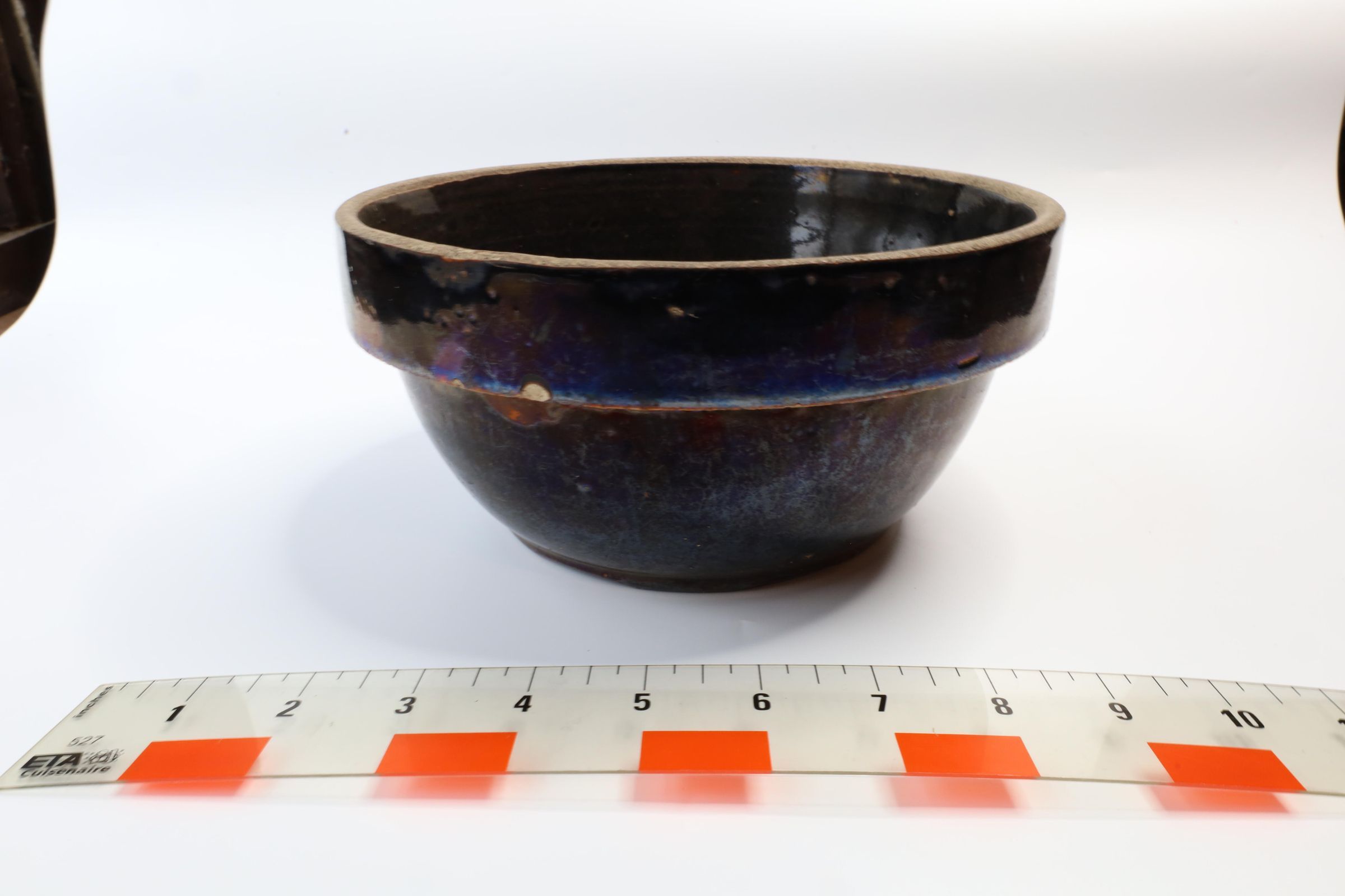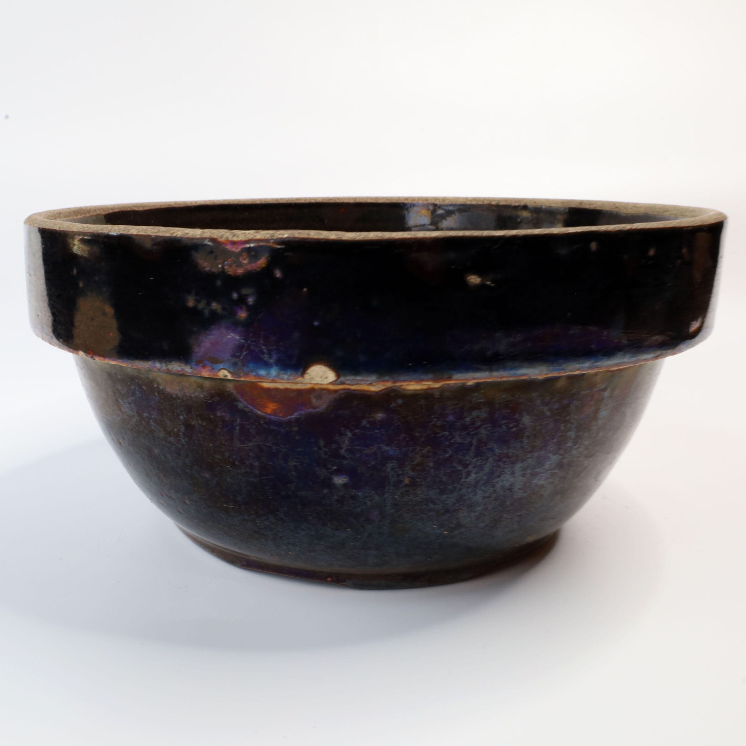 This 8-inch brown glazed wide-band raised bottom crock pottery shows luminous colors that change when seen from different angles.