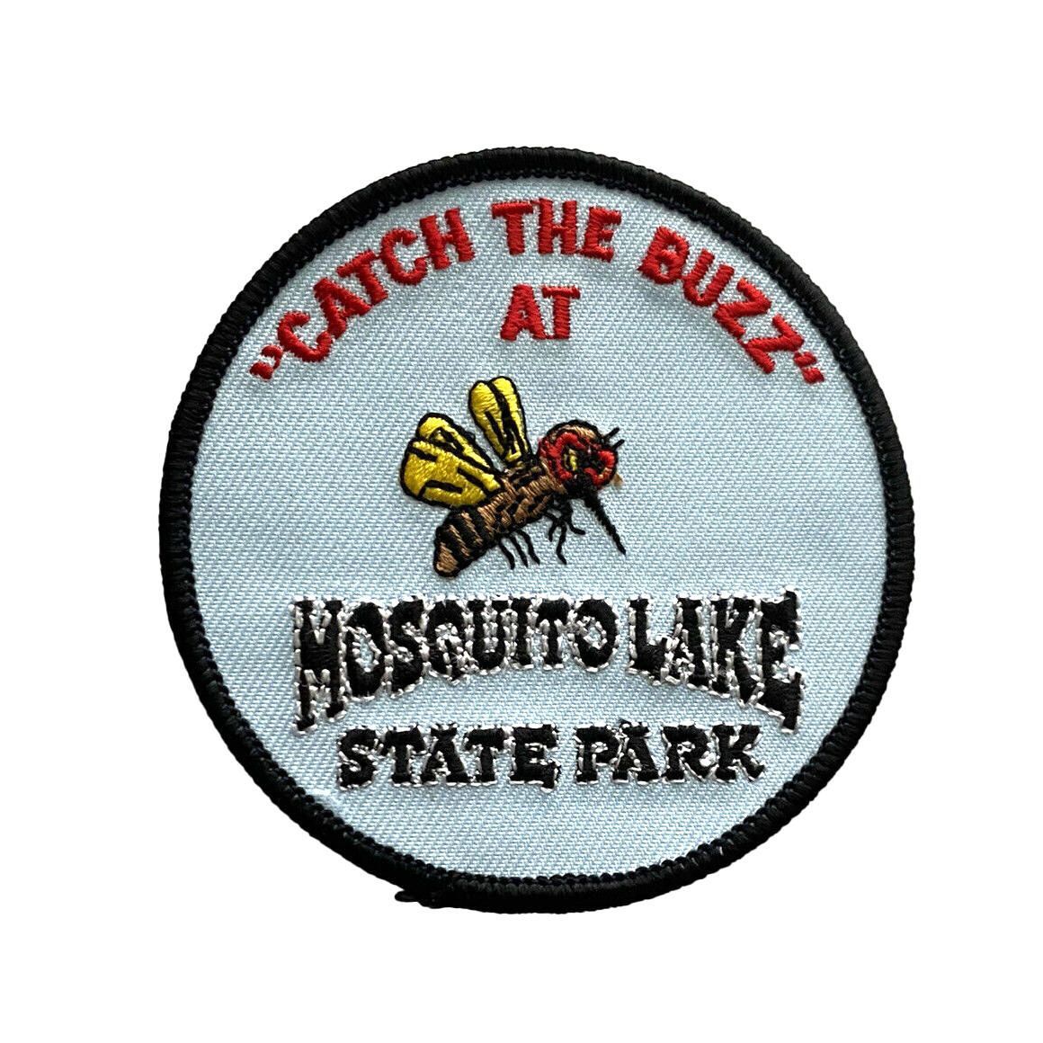 Embroidered 3-inch round patch with a light blue background and black border. A mosquito is featured in the center with "Catch The Buzz at" in red letters at the top and "Mosquito Lake State Park" in black letters at the bottom.