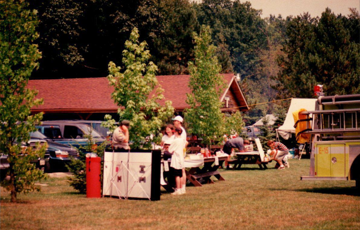 Parkgoers talk with park and outside staff set up at picnic tables during Mt. Gilead State Park's 1997 edition of their Farm Days festival.