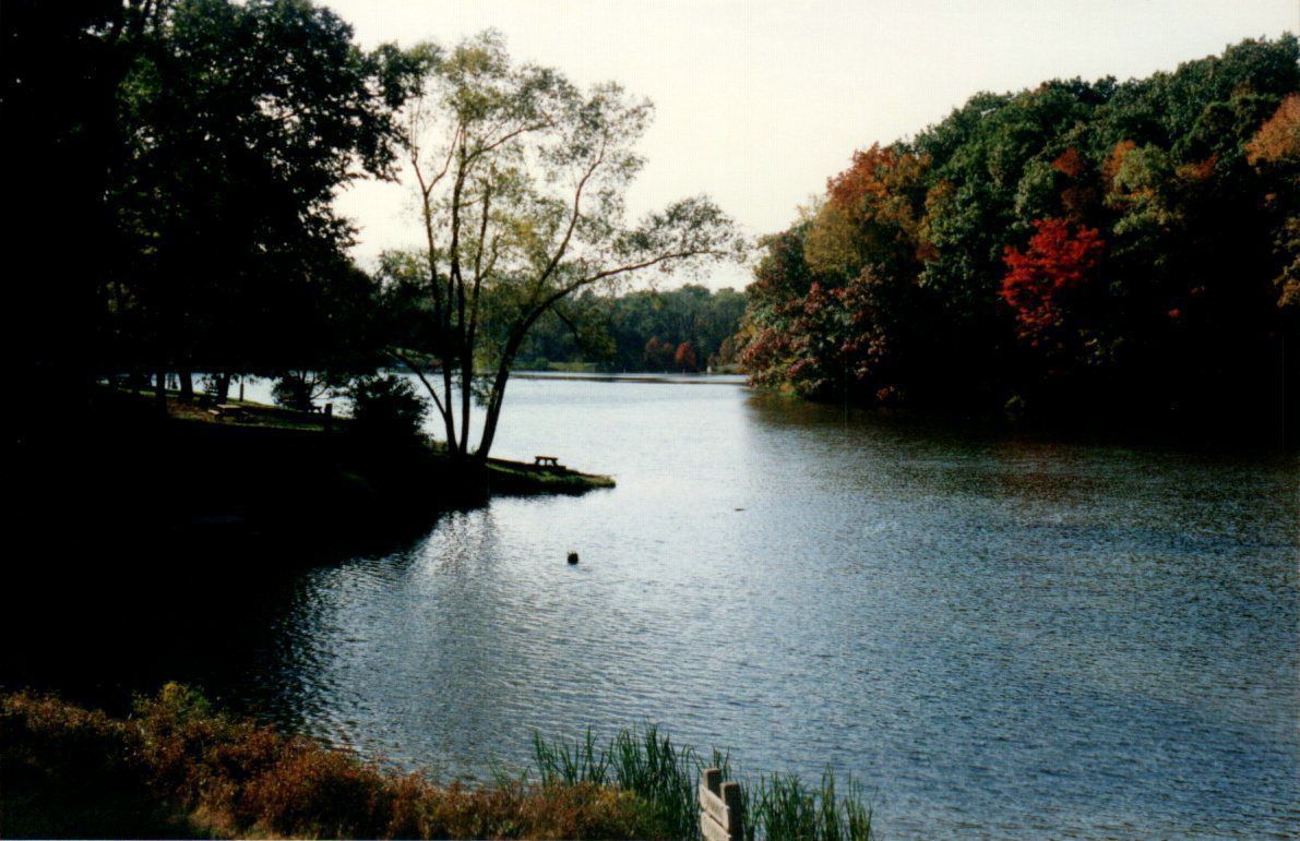 An expansive view of Mount Gilead Lake lined with trees that are gradually donning their autumn color.