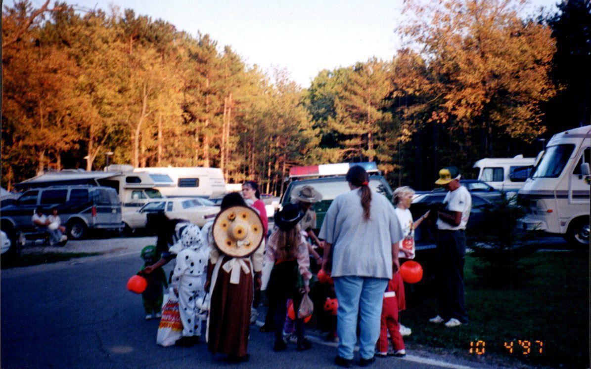 Children in costumes receive candy from a park ranger during Mt. Gilead State Park's trick-or-treat in 1997.