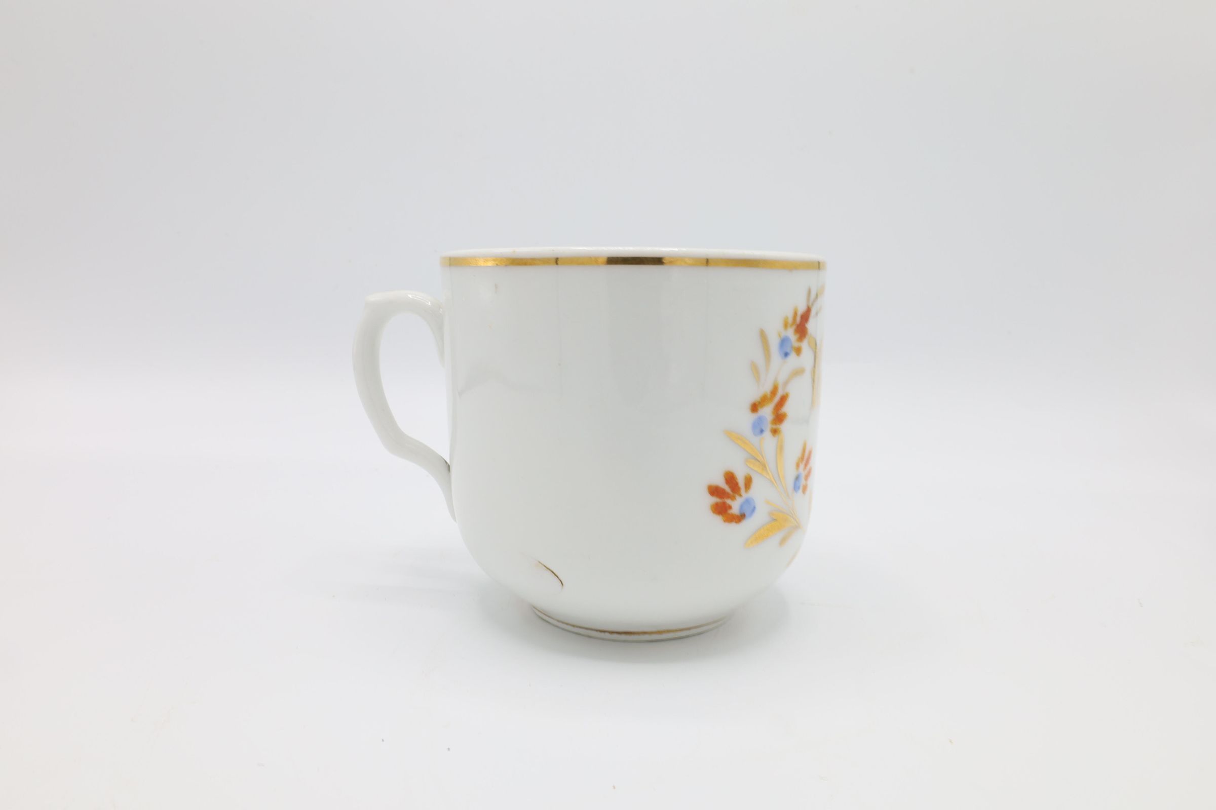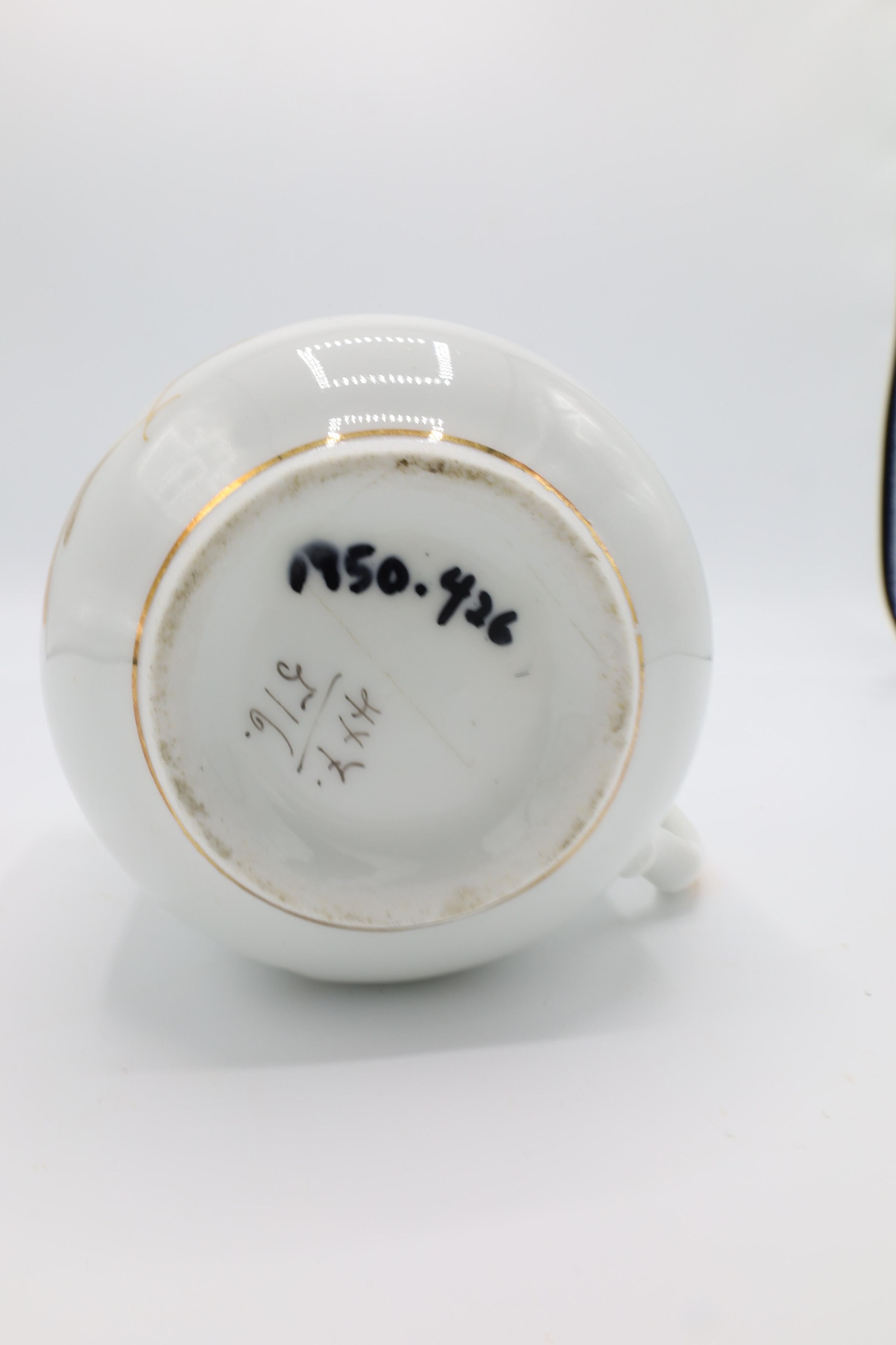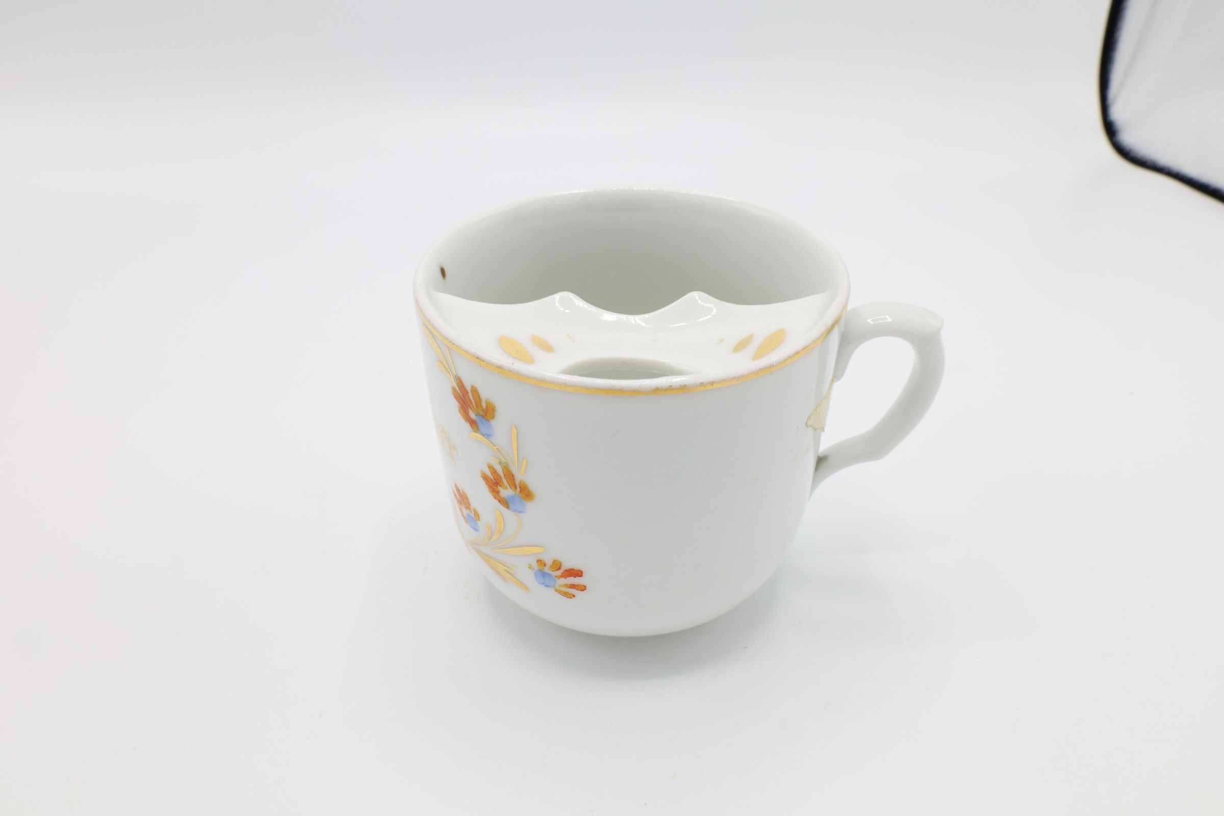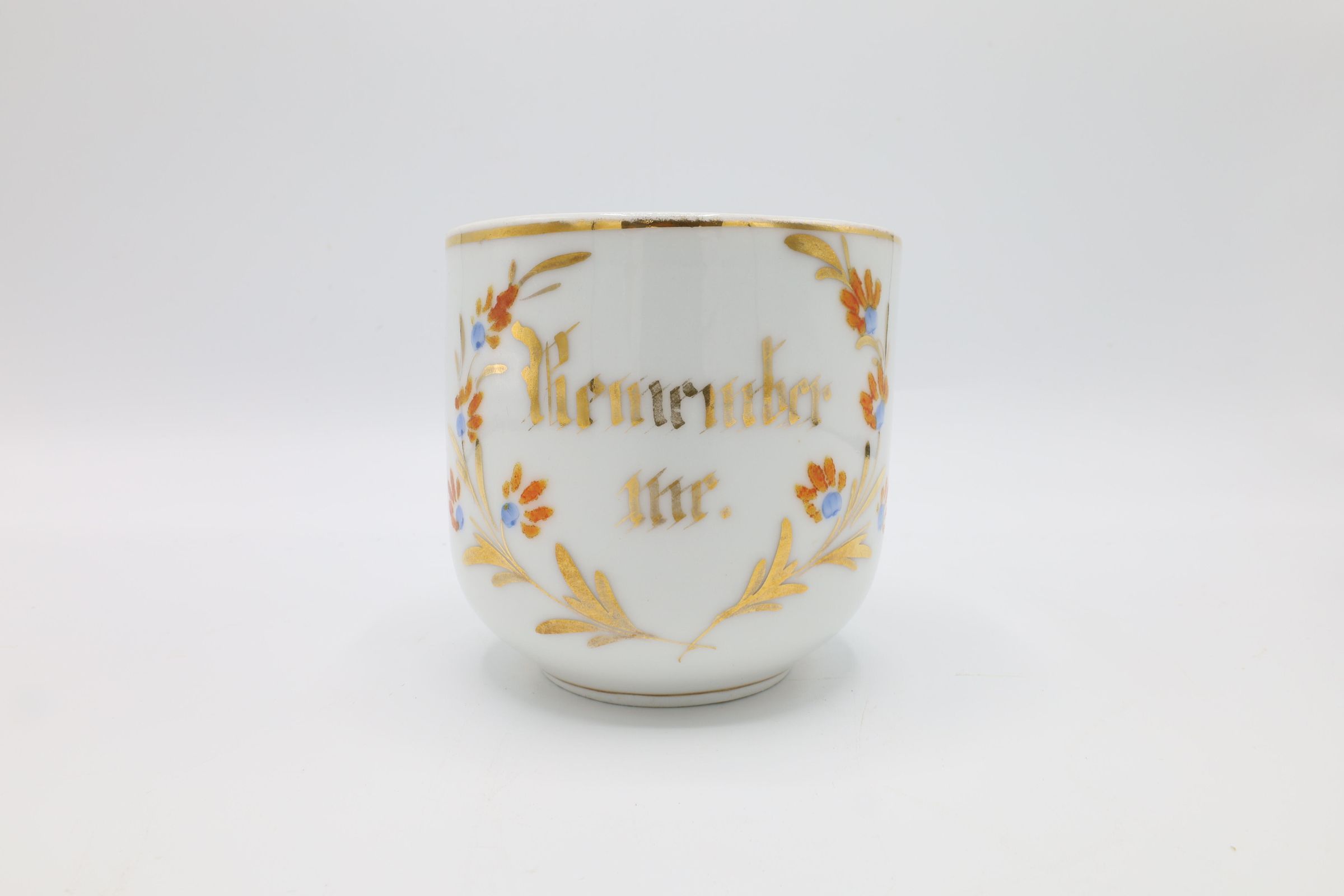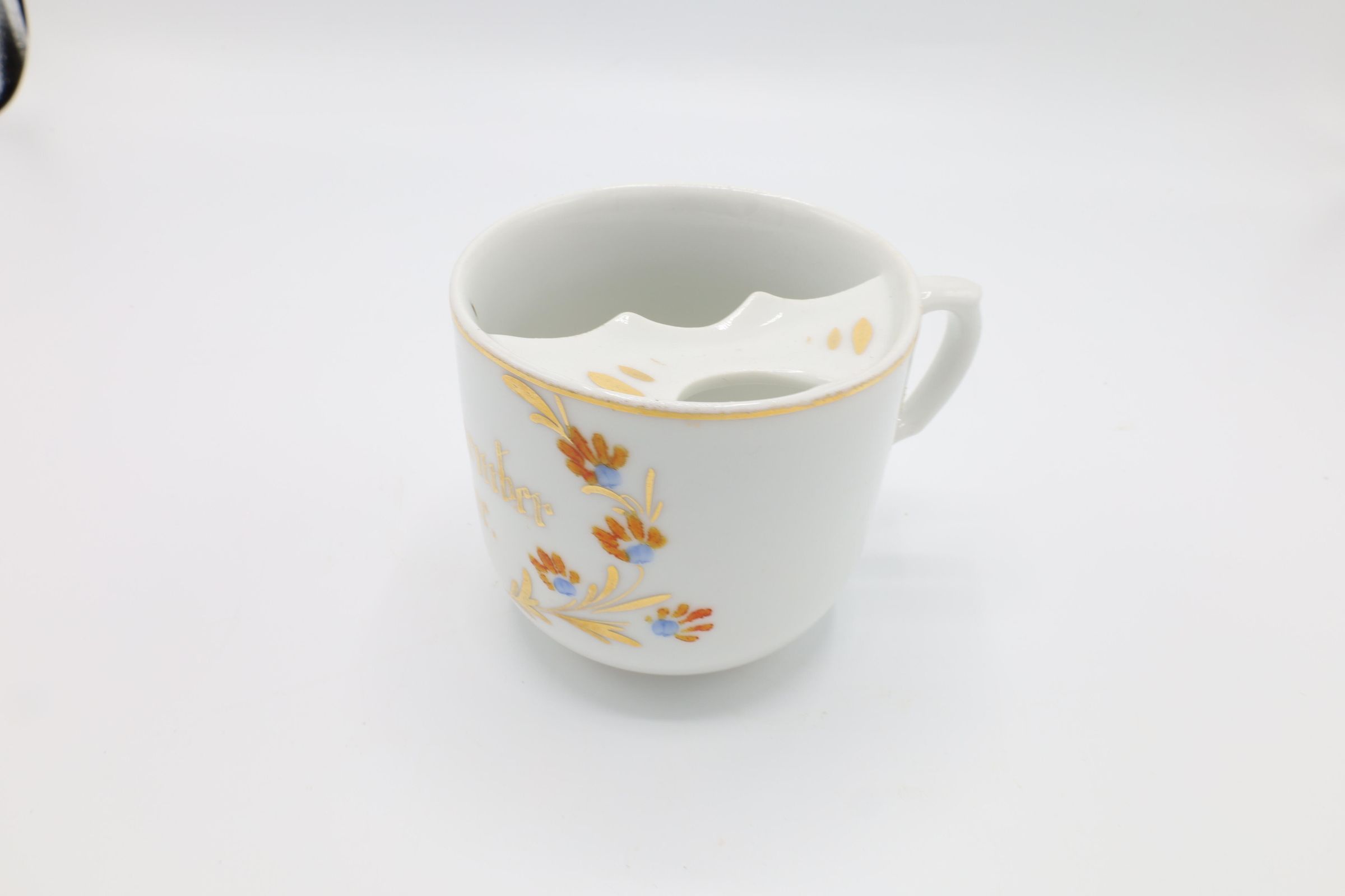 This china mustache cup, glazed with gold, orange, and blue floral decoration and the phrase 'Remember Me' in gold, offers a reminder of a fleeting cultural moment. Mustache cups were invented in the 1870s to protect men's facial hair from hot liquids. Most men at the end of the century had facial hair, and those who used wax or dye on their mustaches could experience damage to their facial hair style when drinking tea. The lip on the mustache cup protected the hair from the liquid. The example of a mustache cup includes gold accents and a curved edge on the lip. There are also hand-painted numbers on the bottom of the cup.