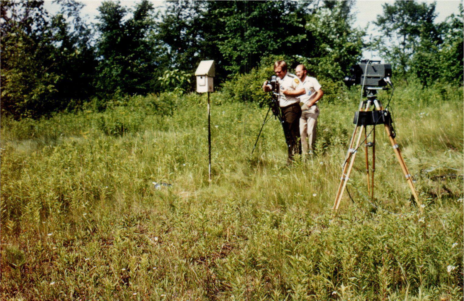 Members of Delaware State Park's staff place cameras in a meadow near a birdhouse to snap pictures of birds as they come and go.