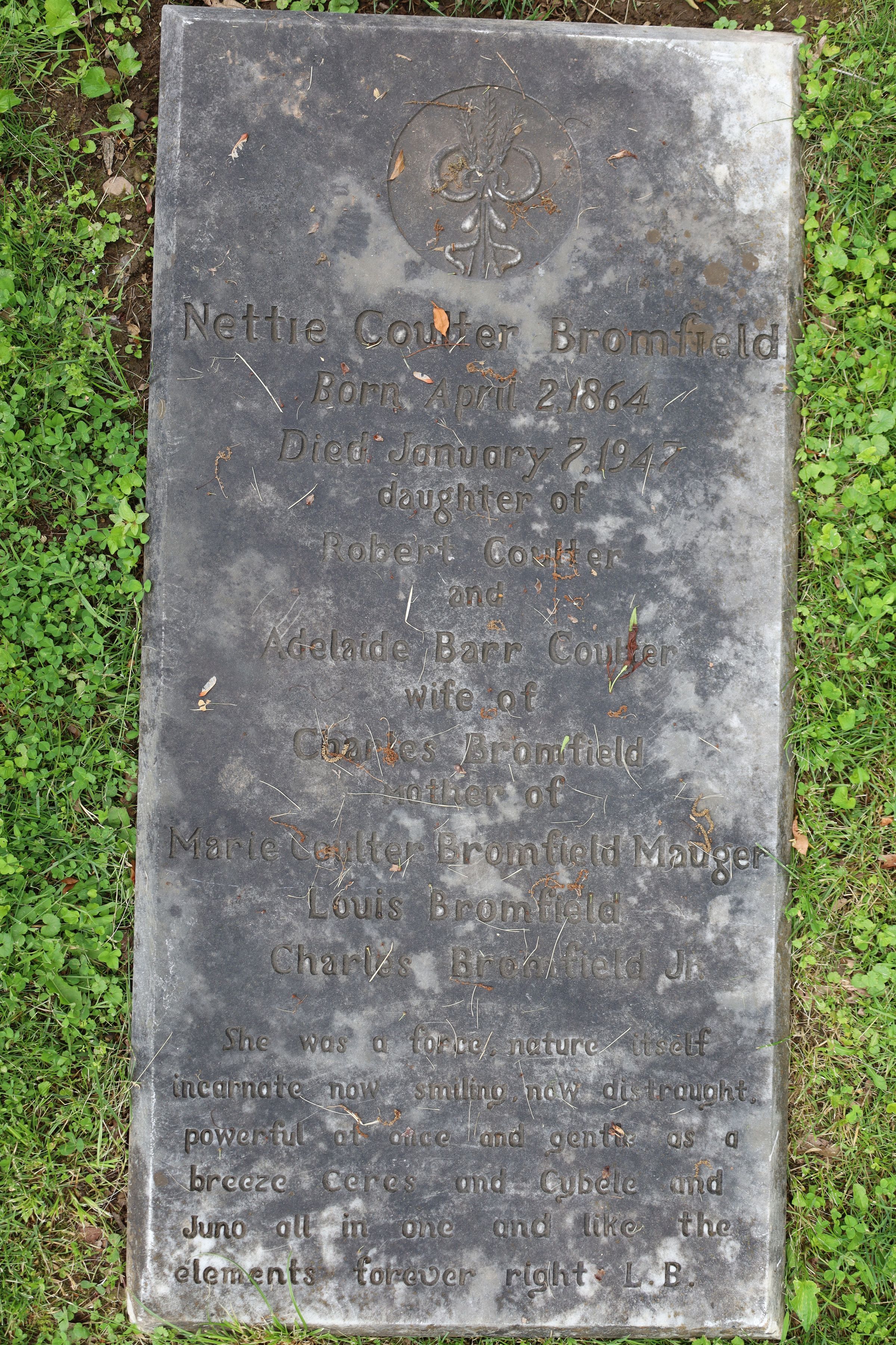Annette "Nettie" Marie Coulter Bromfield was the daughter of Robert and Susan Adelaide Barr Coulter. Nettie married Charles Bromfield in October 1885. Nettie and Charles Bromfield had three children Marie, Louis, and Charles.