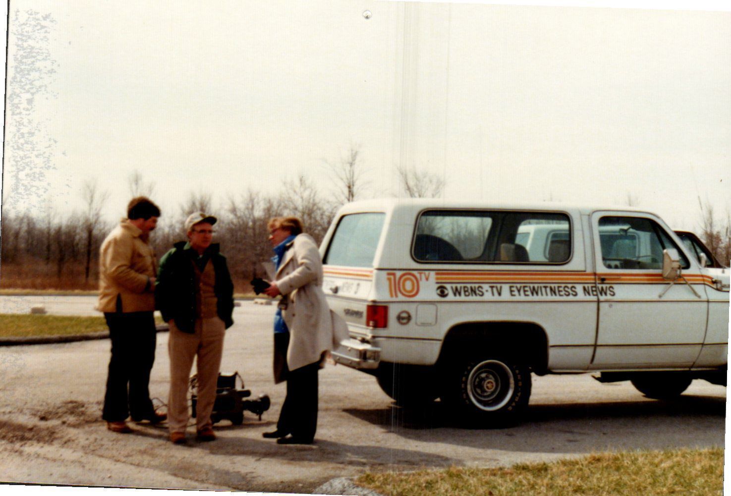 A film crew from 10TV WBNS stand outside and ready themselves to report from Delaware State Park on a cold winter day.