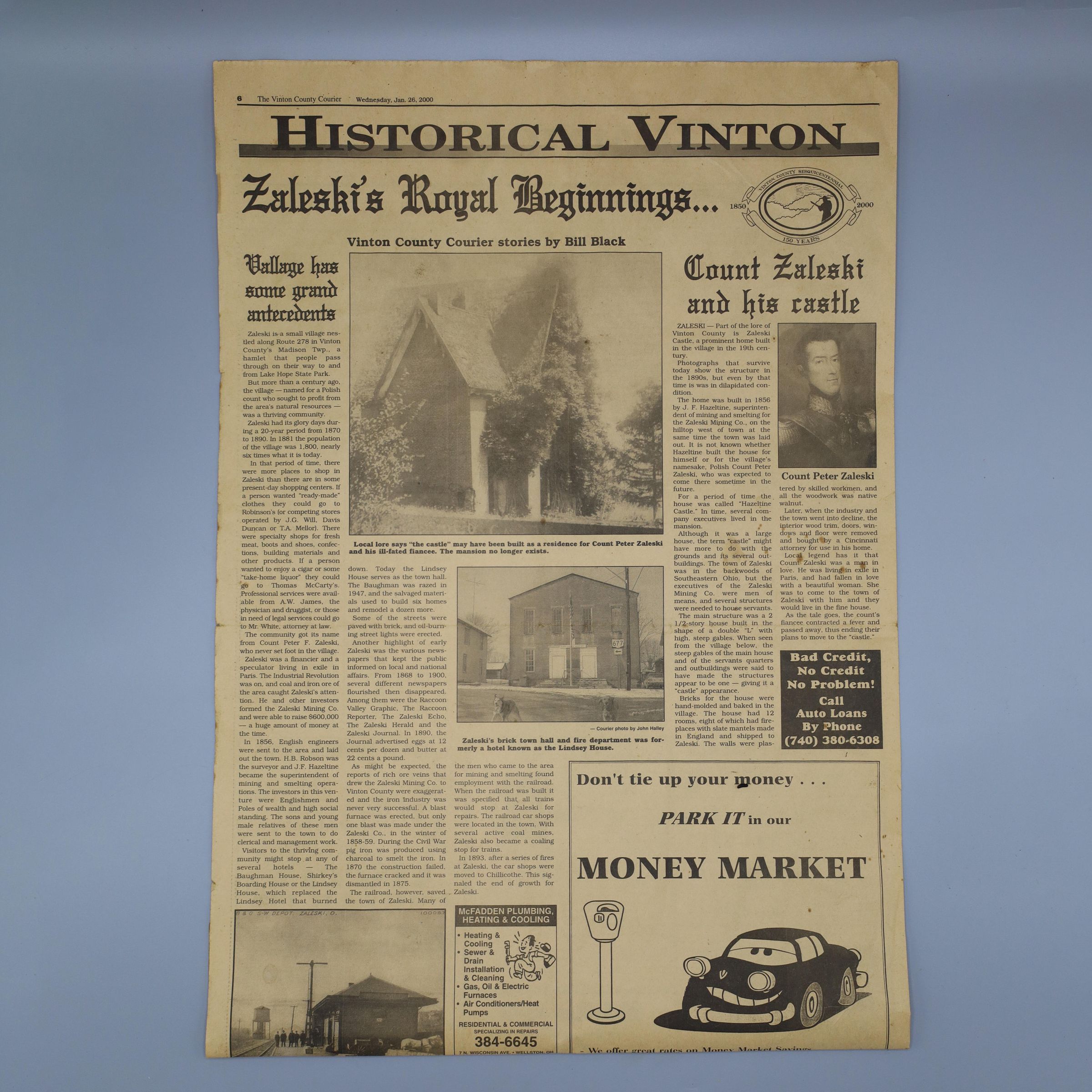 Vinton County Courier sesquicentennial edition articles by Bill Black. The article is titled "Zaleski's Royal Beginnings" and subtitled "Village Has Some Grand Antecedents" and "Count Zaleski & His Castle."Location