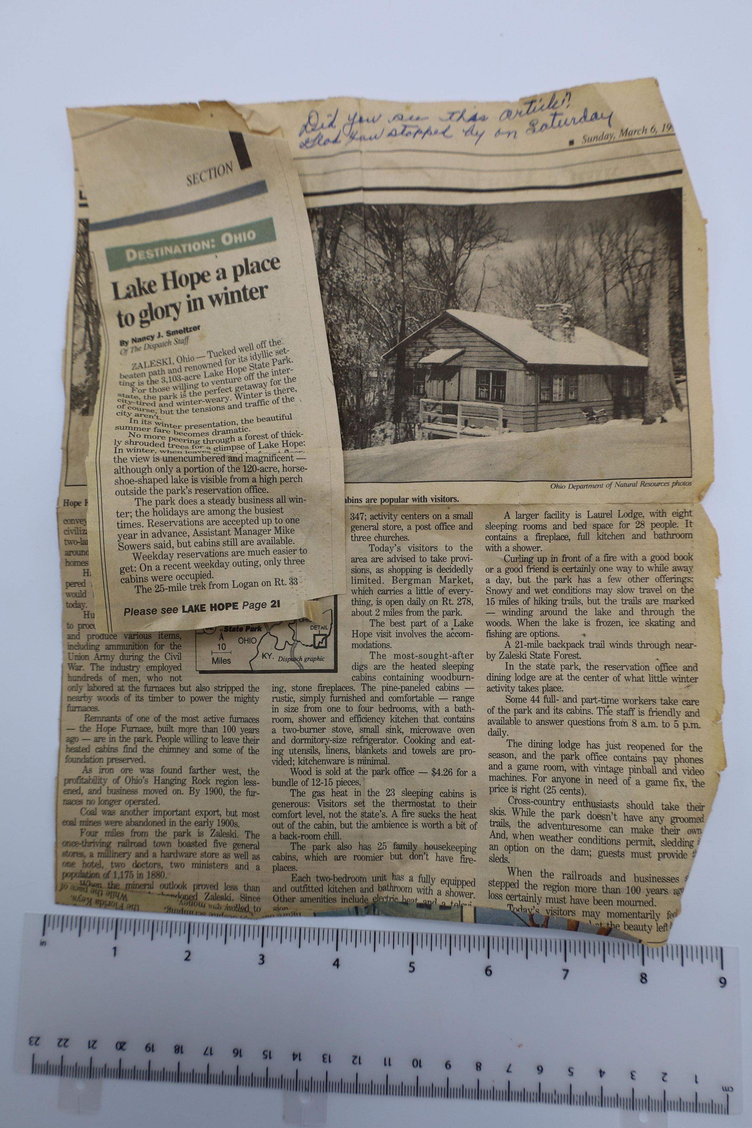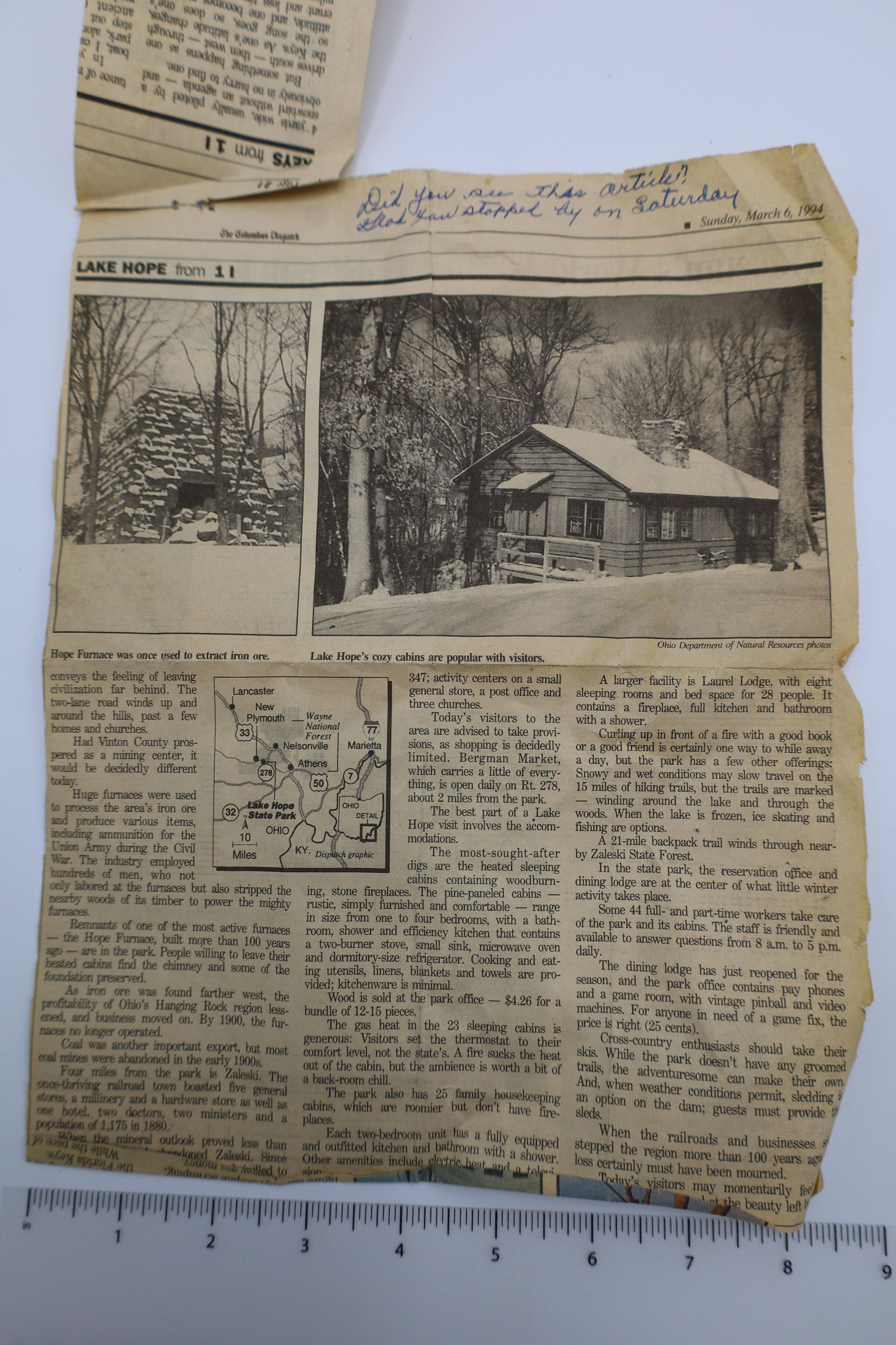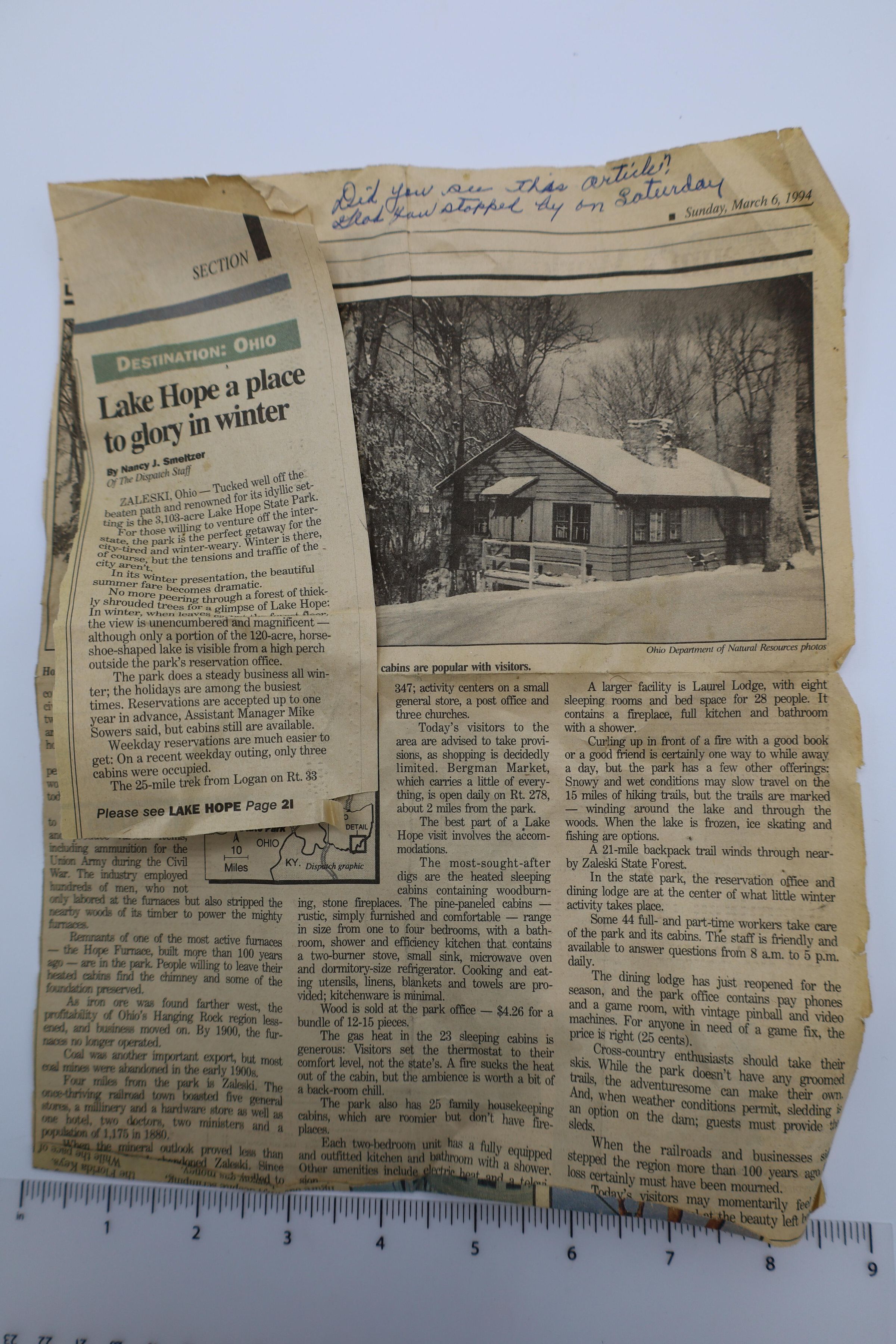 Columbus Dispatch March 16, 1994. Folded to highlight a news article titled: Lake Hope A Place to Glory in Winter. Includes photographs of Hope Furnace and a cabin in the winter. The newspaper is folded and yellowed.Location