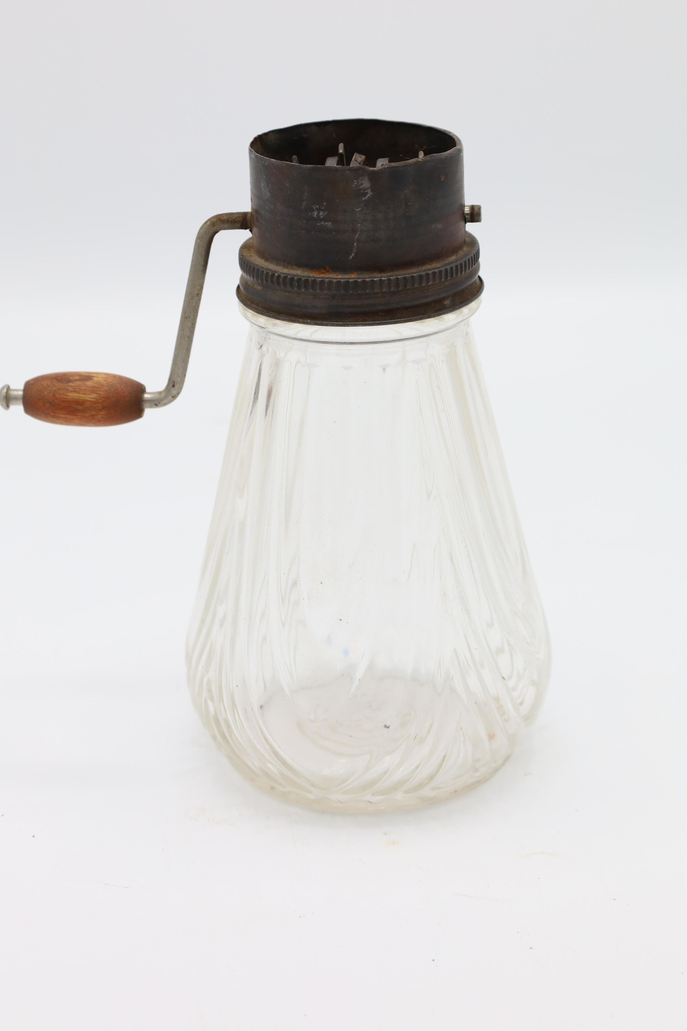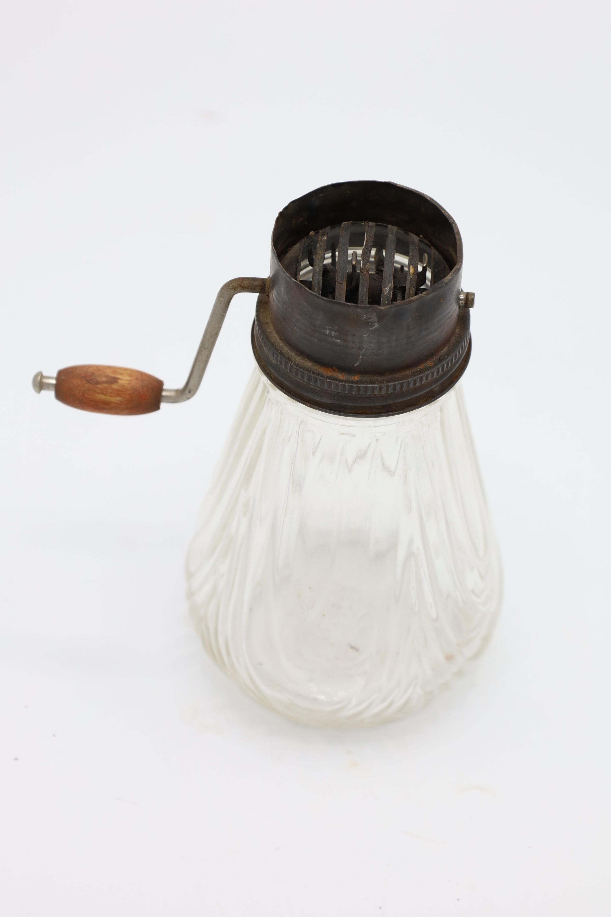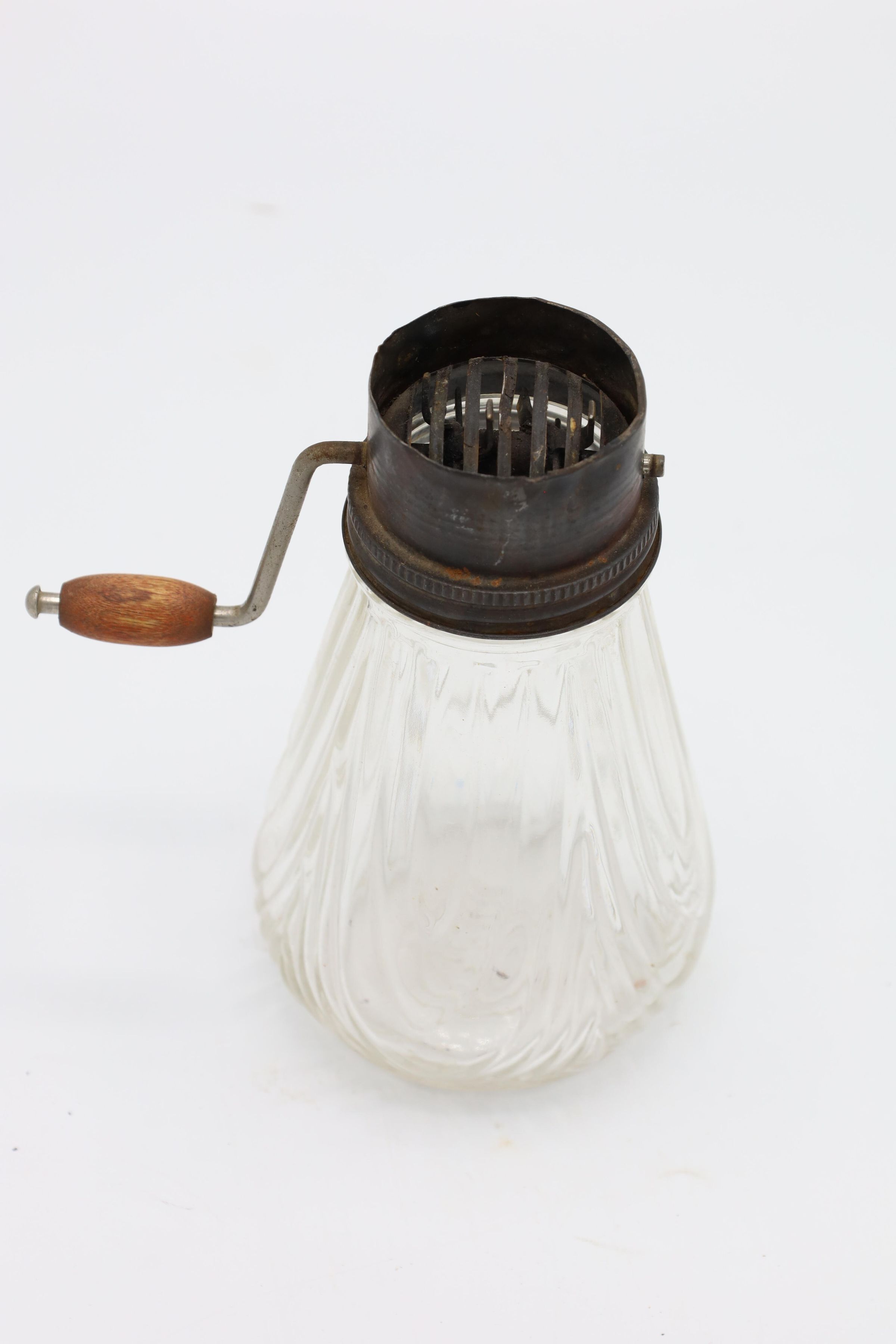 This manual nut grinder from the early or mid 20th century has a hand-crank and a glass jar bottom. The lid is missing. This nut grinder is 6" tall with a ribbed glass container and a metal screw top with tines and a crank handle. The nuts are placed on top and pushed down while turning the crank. The tines then grind the nuts. The missing lid would either be flat or a measuring cup. Similar grinders appear to have a flat metal lid.Location