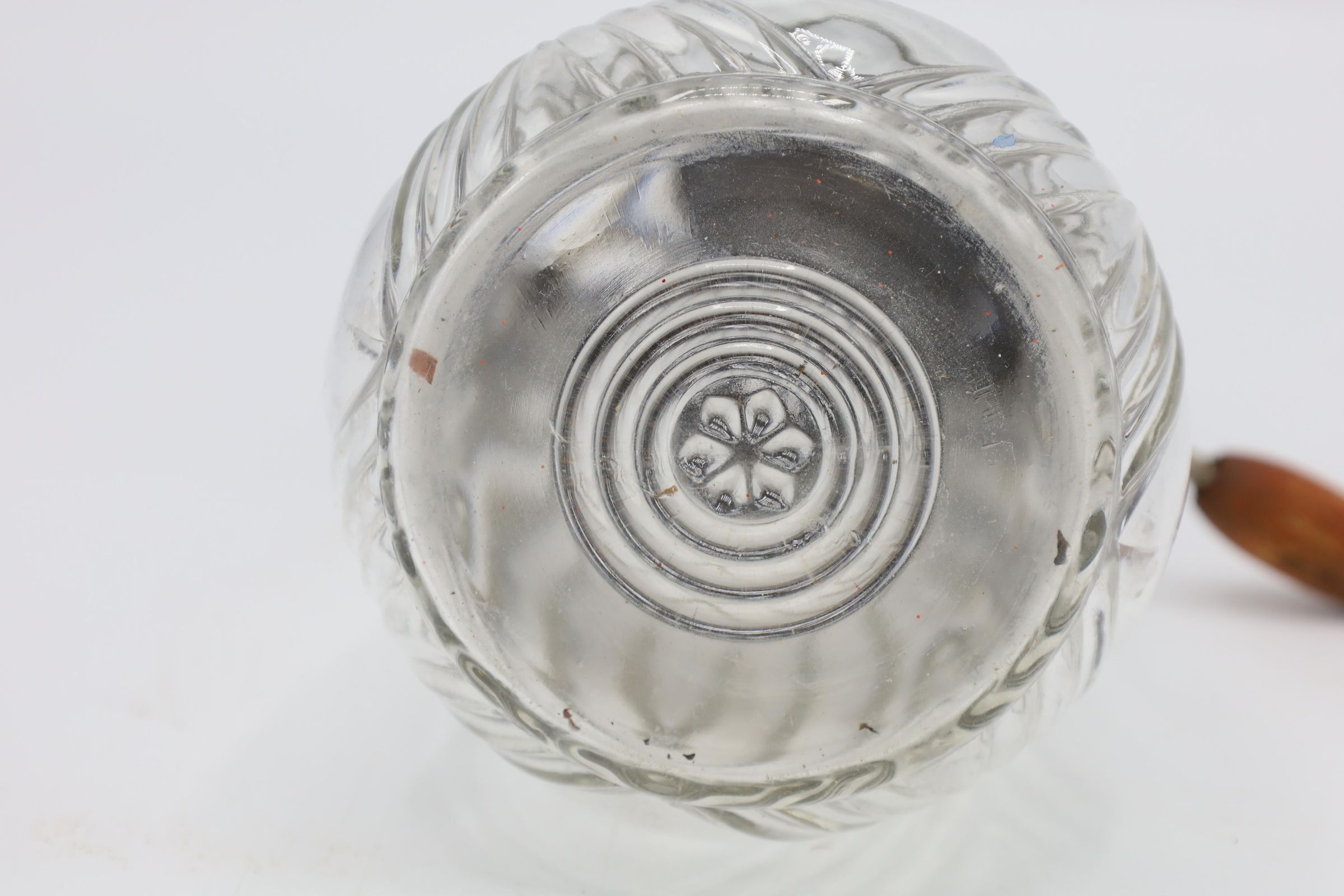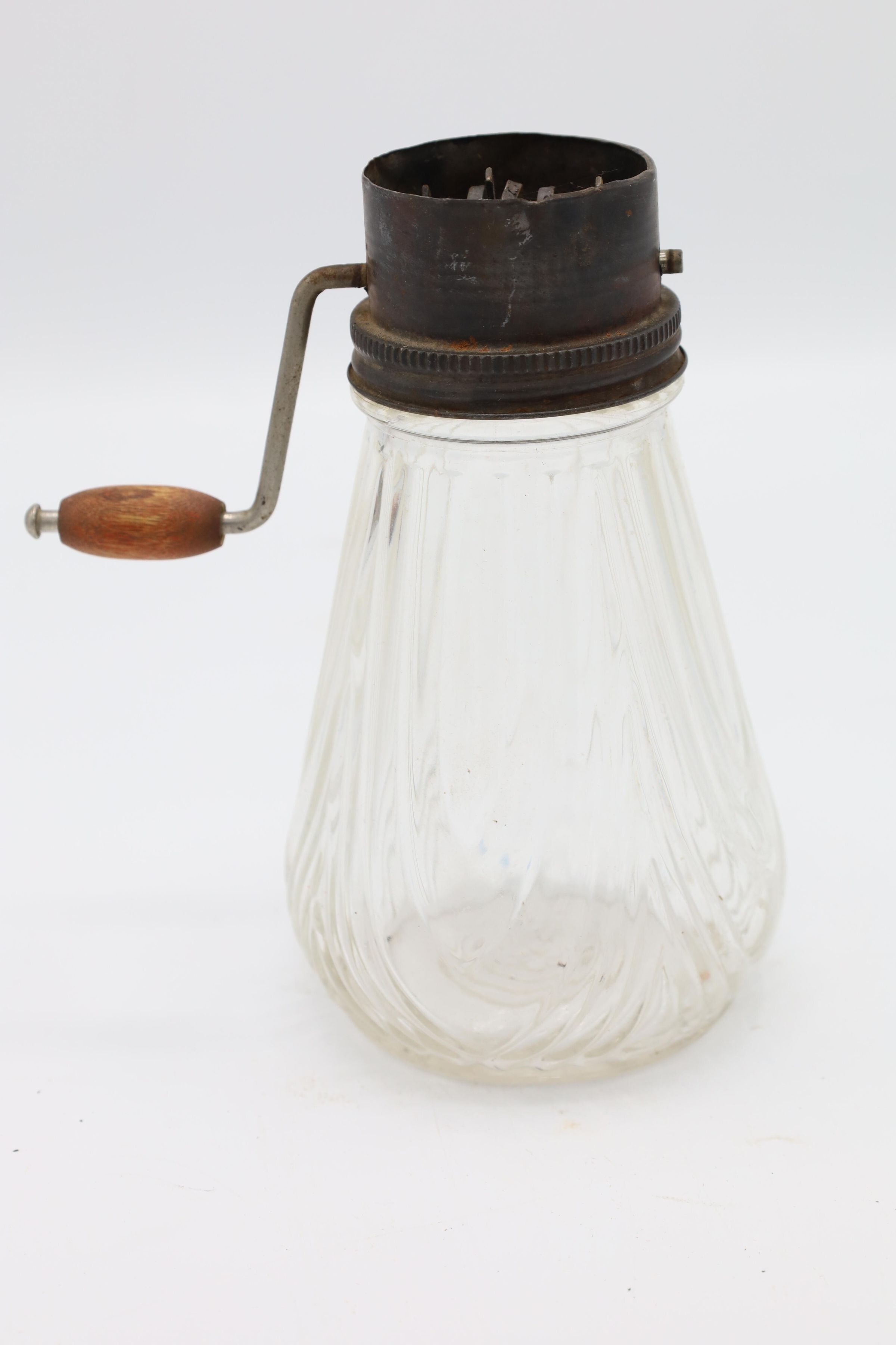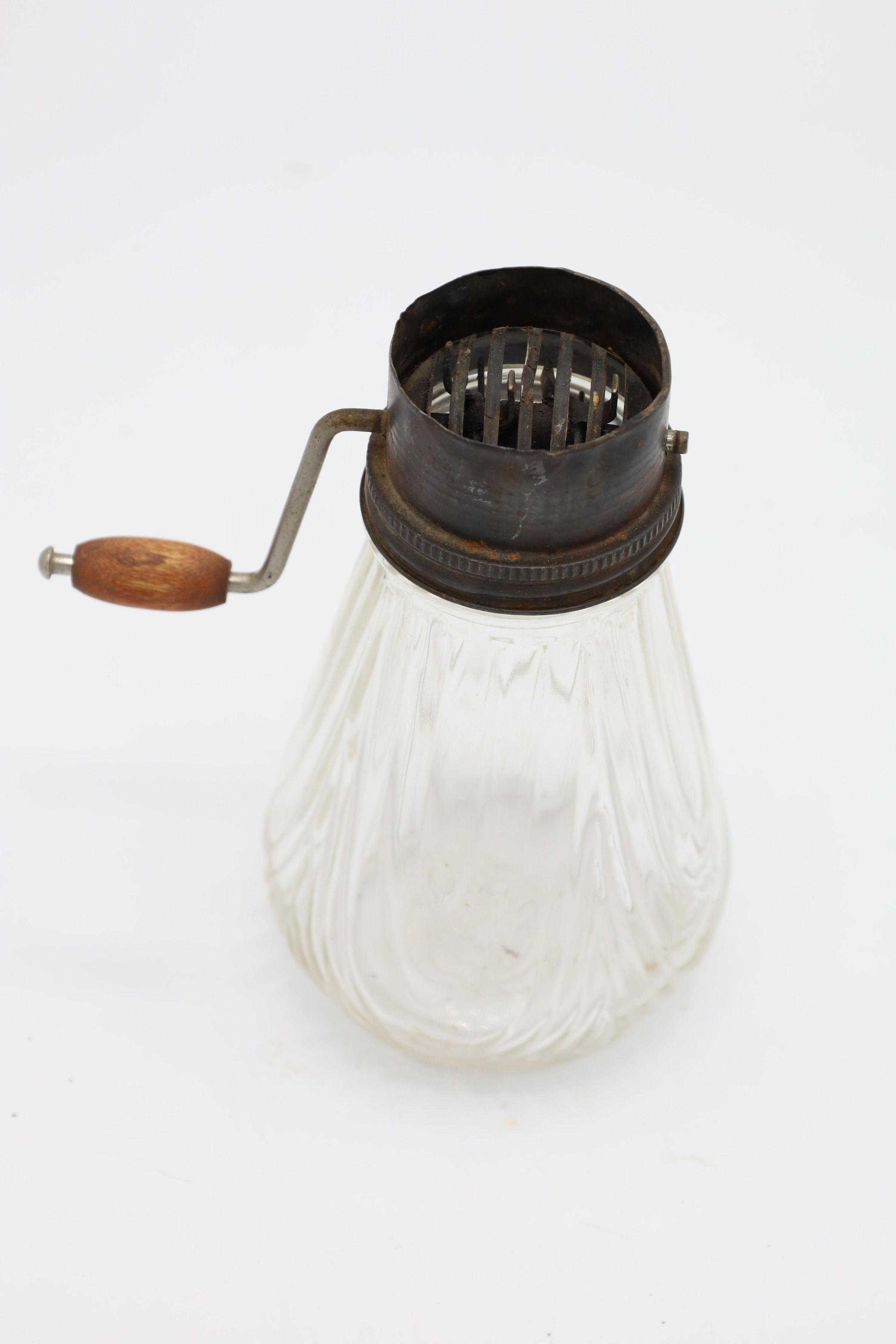 This manual nut grinder from the early or mid 20th century has a hand-crank and a glass jar bottom. The lid is missing. This nut grinder is 6" tall with a ribbed glass container and a metal screw top with tines and a crank handle. The nuts are placed on top and pushed down while turning the crank. The tines then grind the nuts. The missing lid would either be flat or a measuring cup. Similar grinders appear to have a flat metal lid.Location