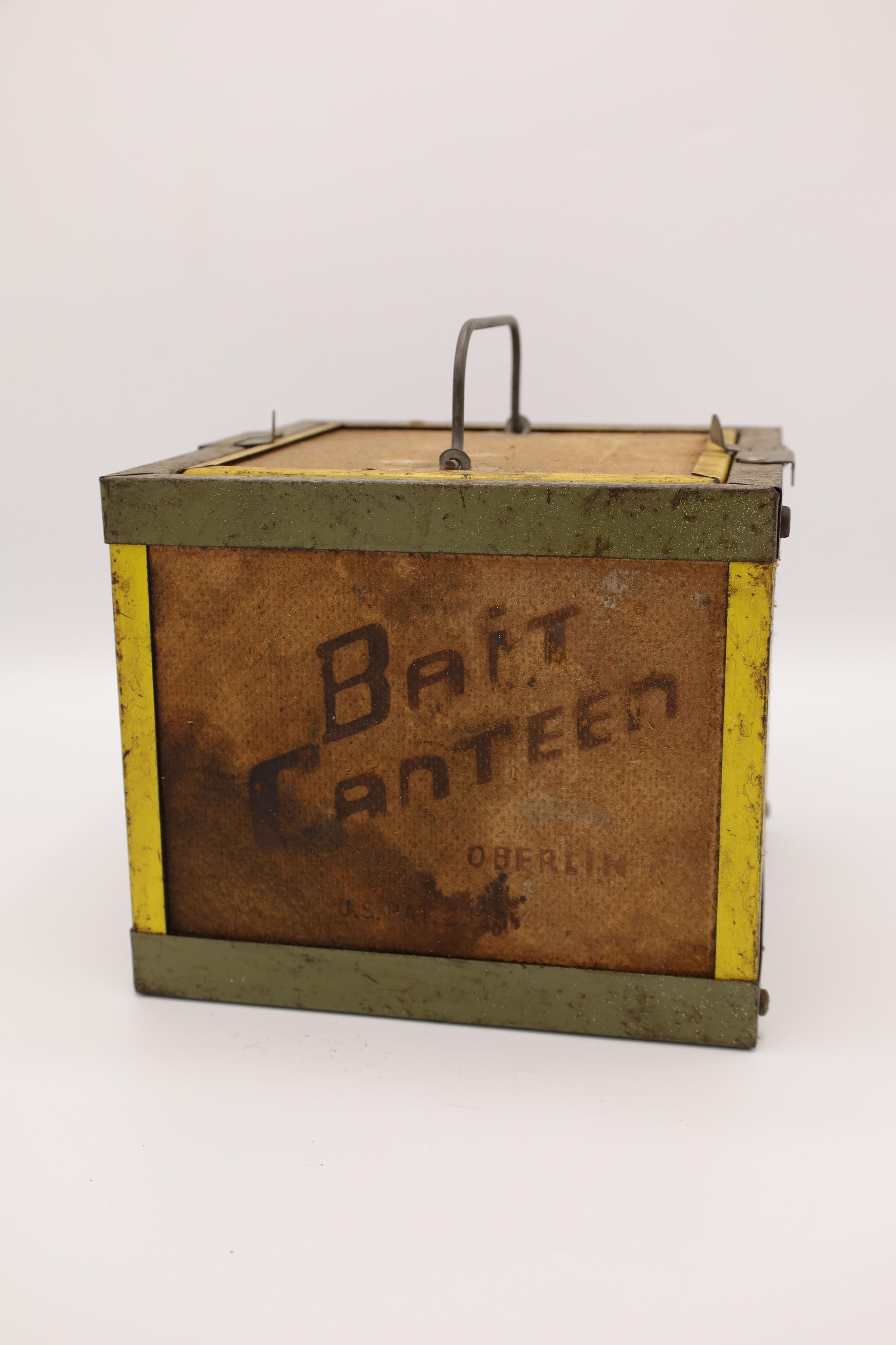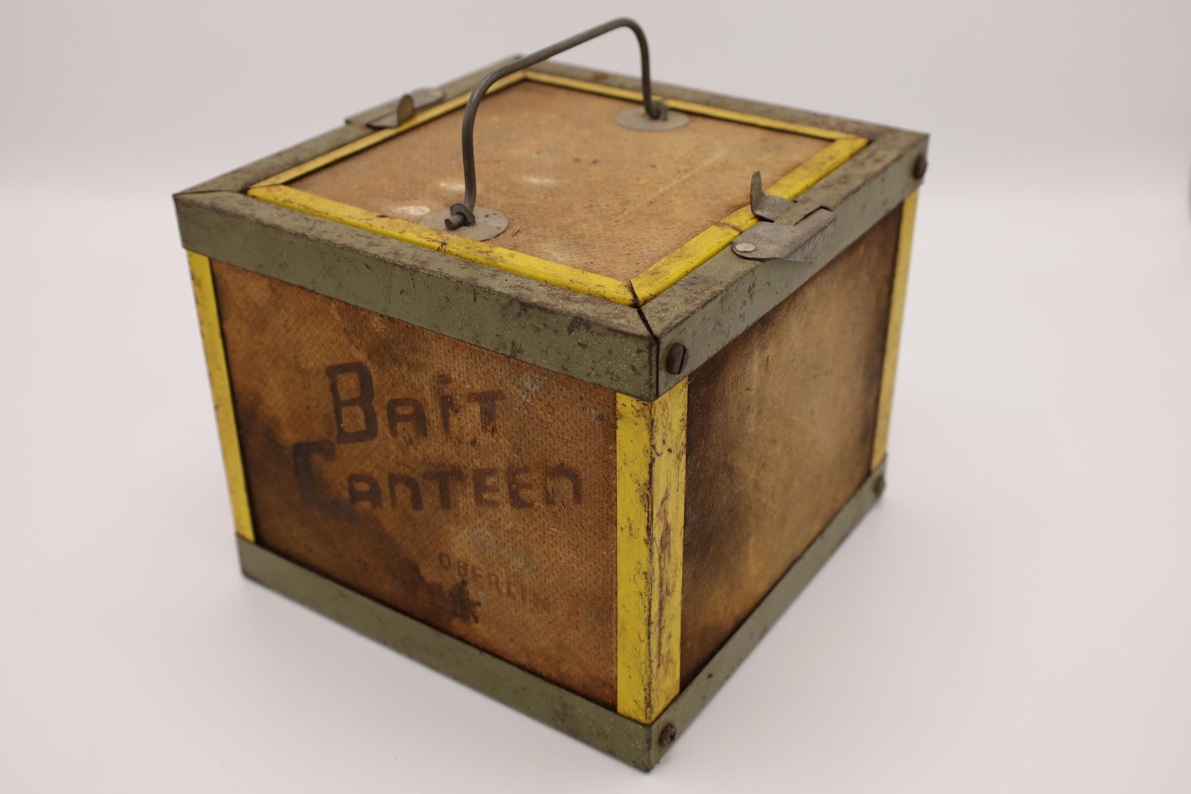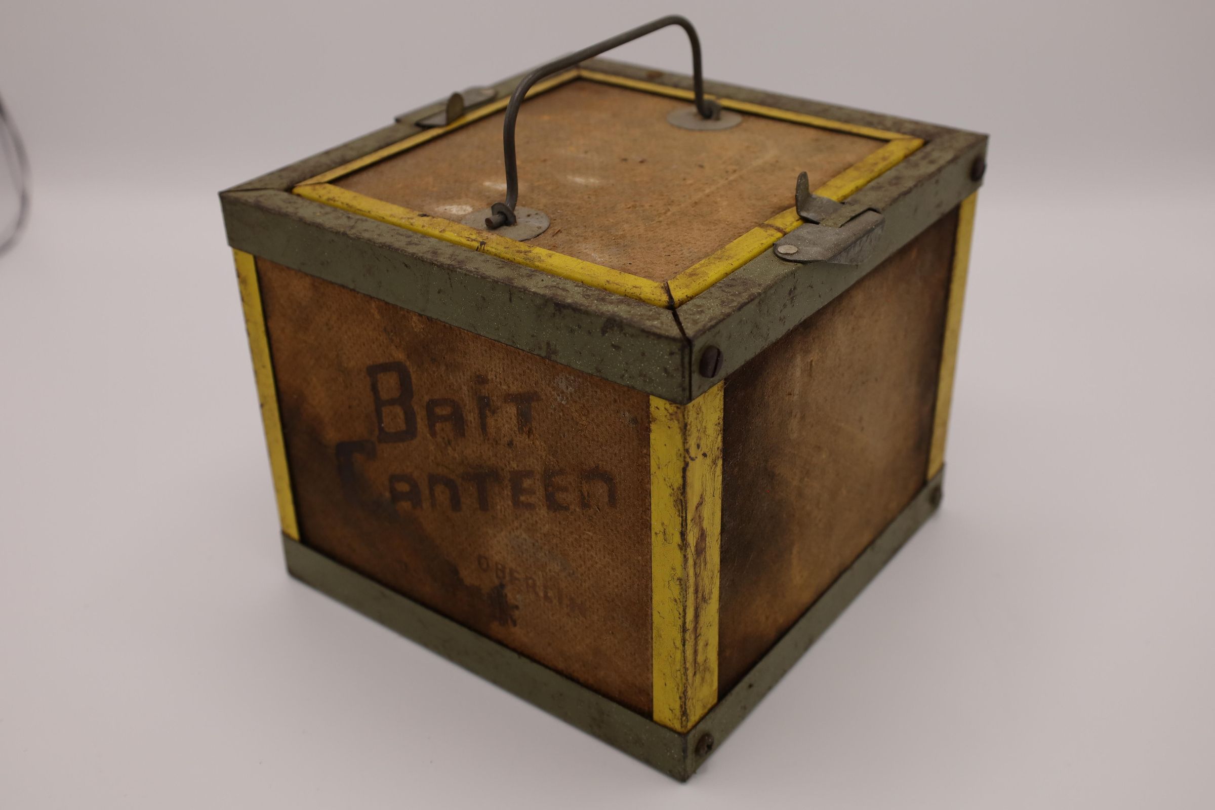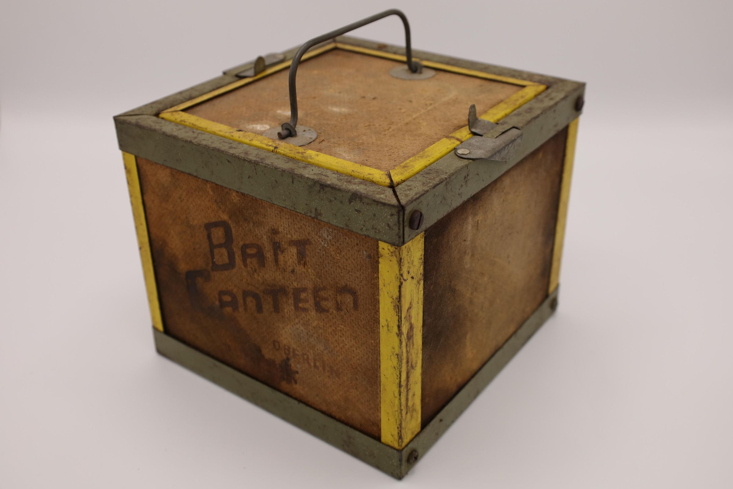 This bait canteen box from the 1960s has seen a lot of use. Manufactured by the Oberlin Canteen Company in Ohio, it measures 7" square by 6" tall. This canteen is made with a cork-like fiber on the sides, top, and bottom, metal along the edges and corners and has a metal handle. The Oberlin Bait-Canteen Company was founded in 1945 and closed in the 1980s.Location