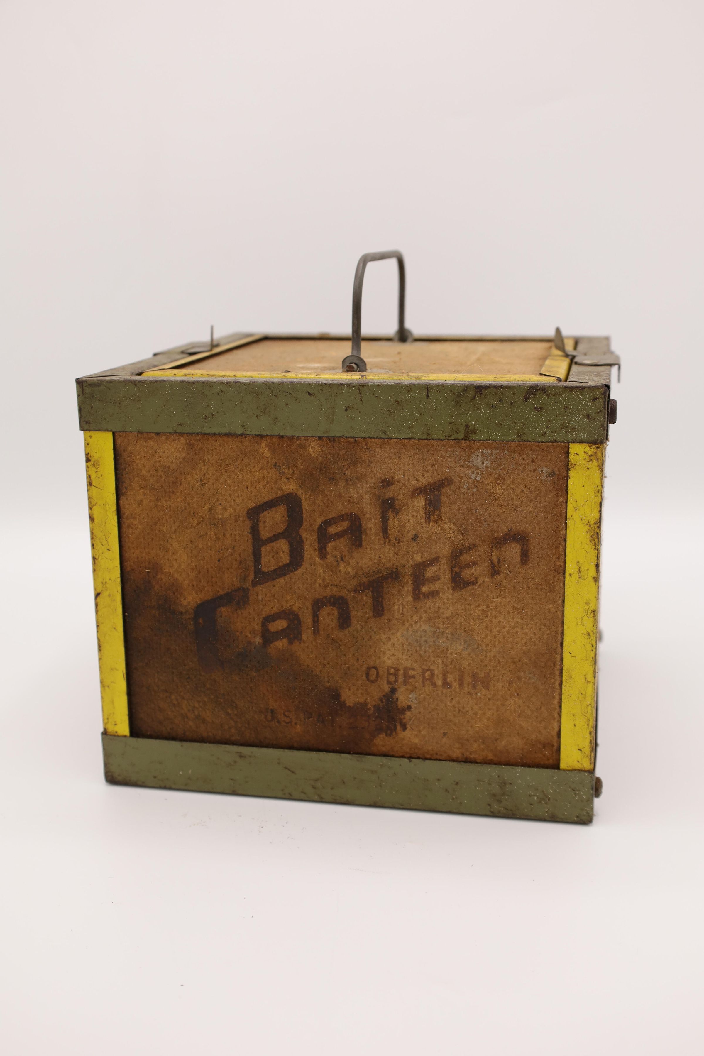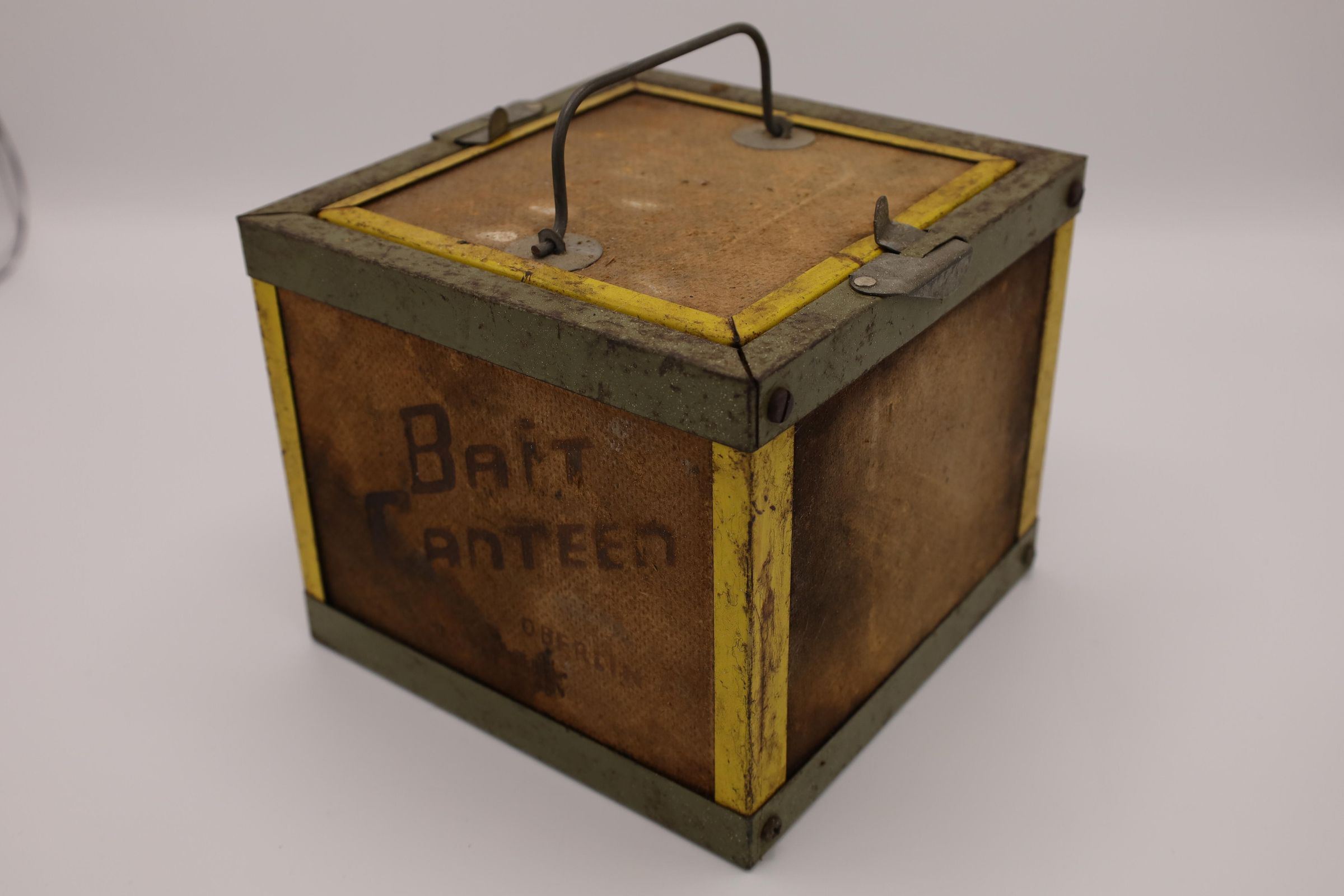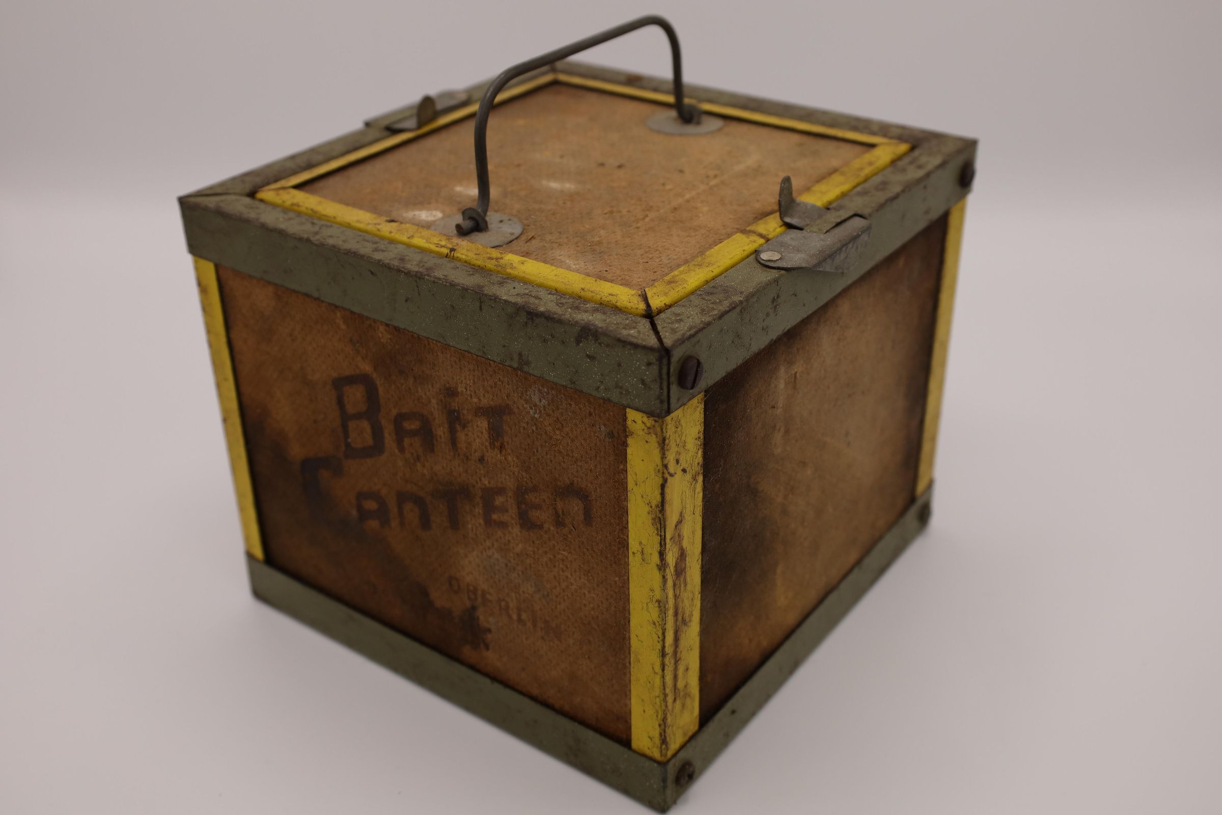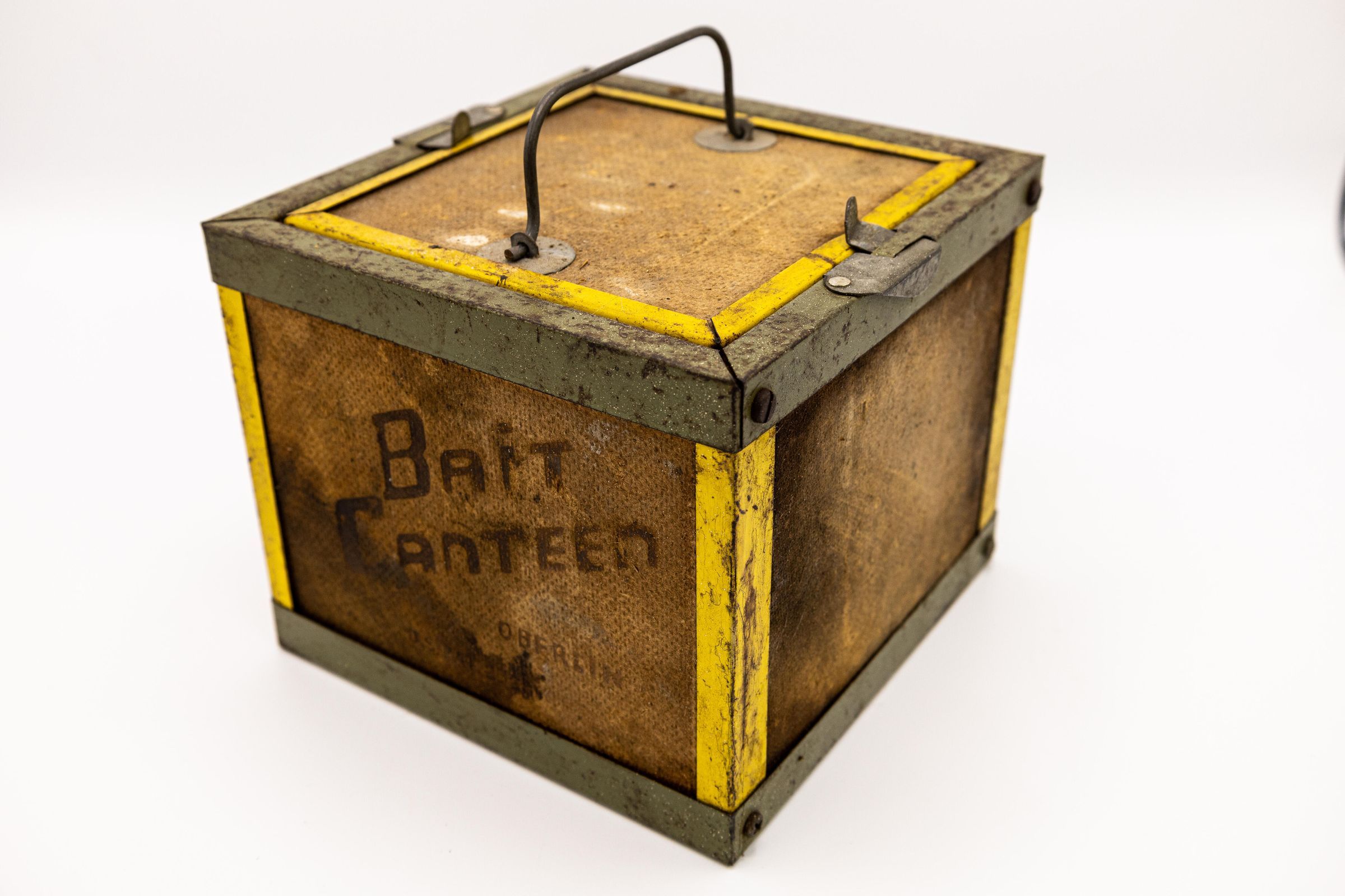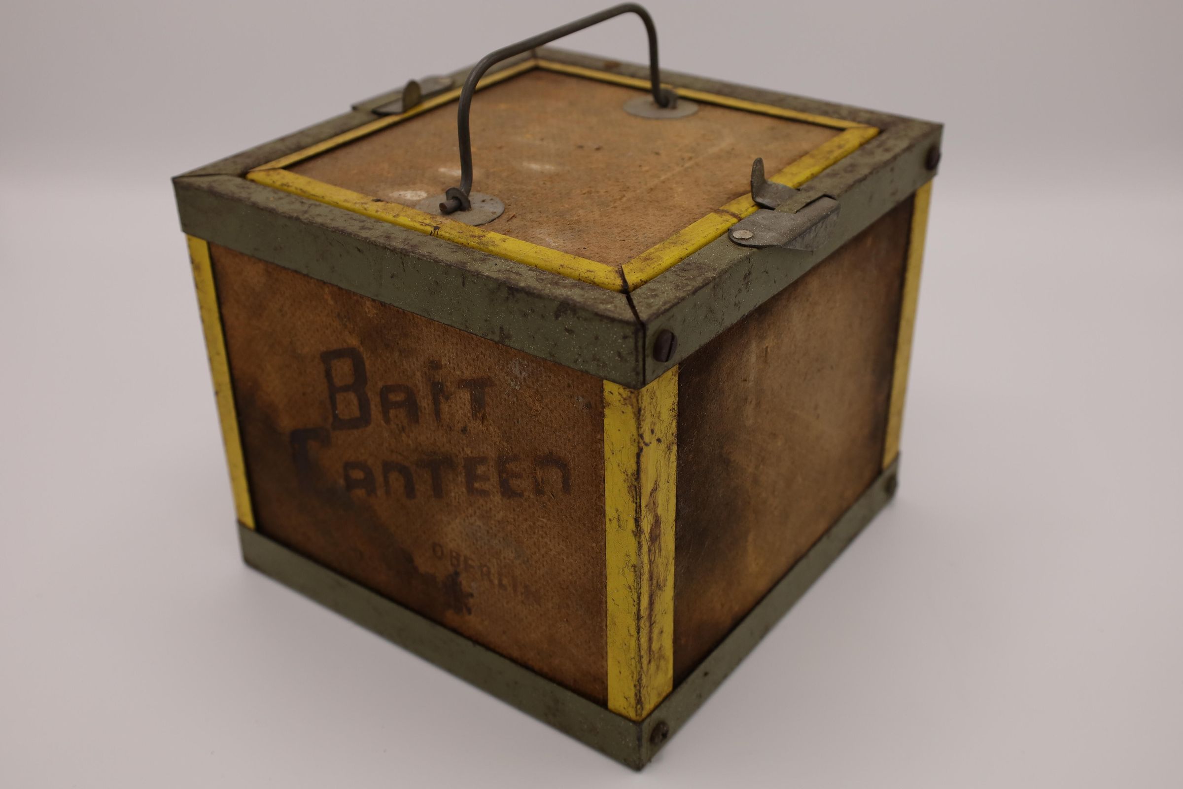 This bait canteen box from the 1960s has seen a lot of use. Manufactured by the Oberlin Canteen Company in Ohio, it measures 7" square by 6" tall. This canteen is made with a cork-like fiber on the sides, top, and bottom, metal along the edges and corners and has a metal handle. The Oberlin Bait-Canteen Company was founded in 1945 and closed in the 1980s.Location