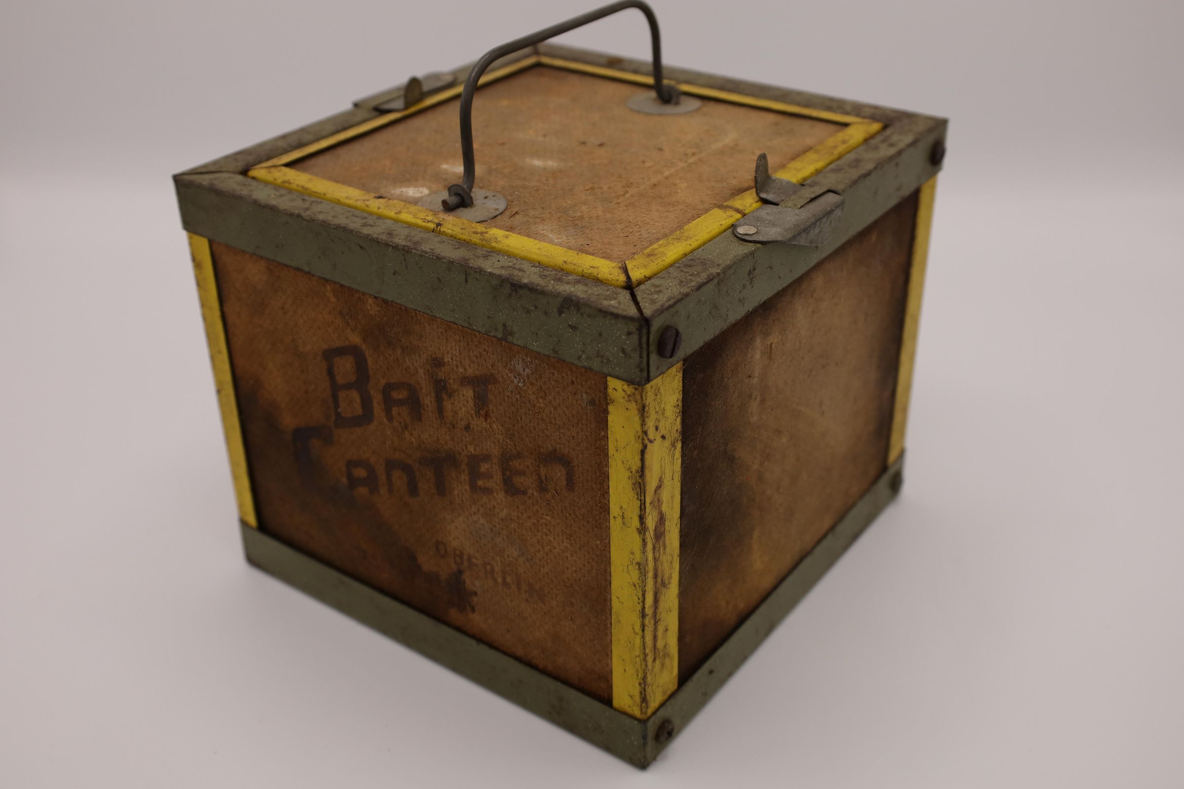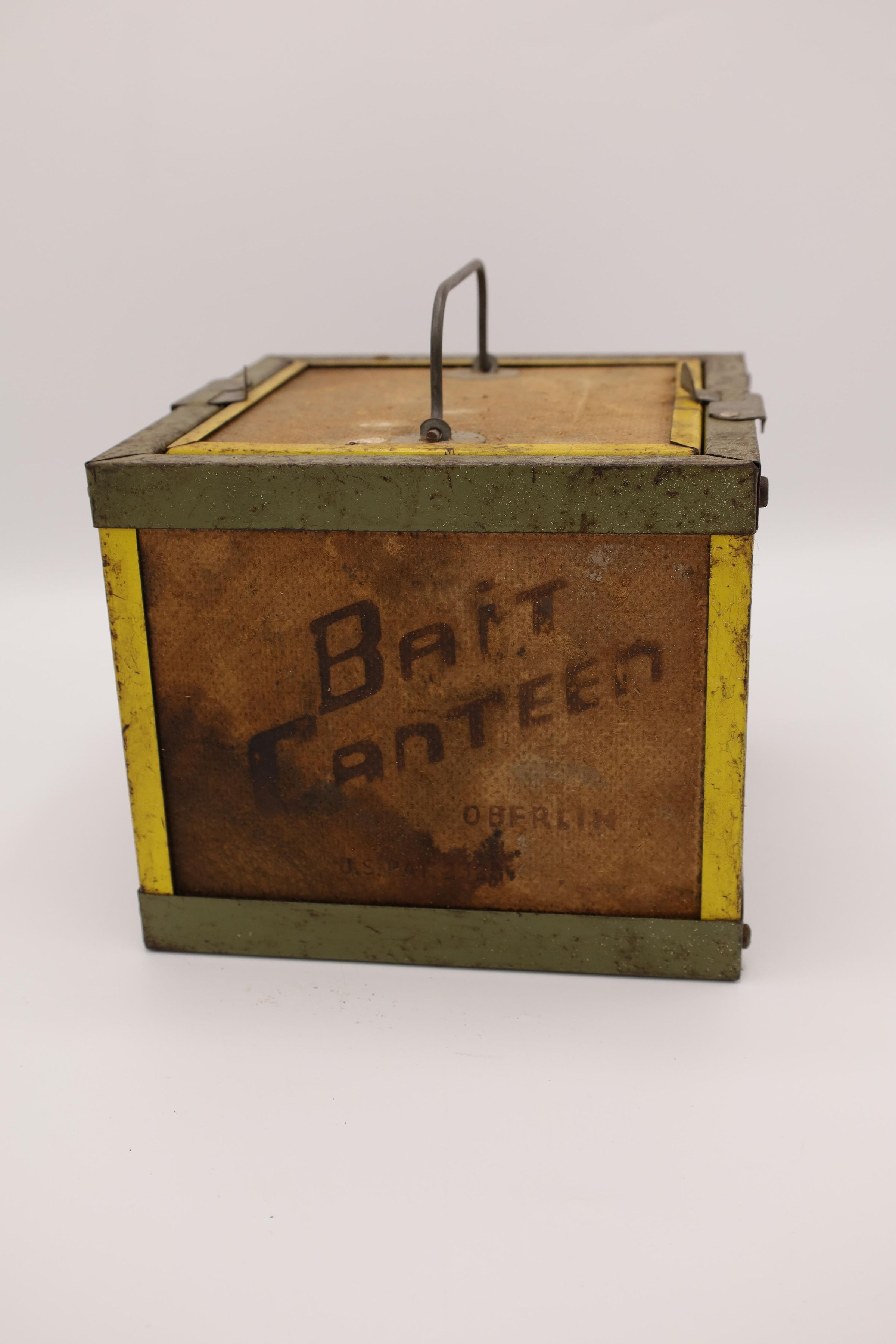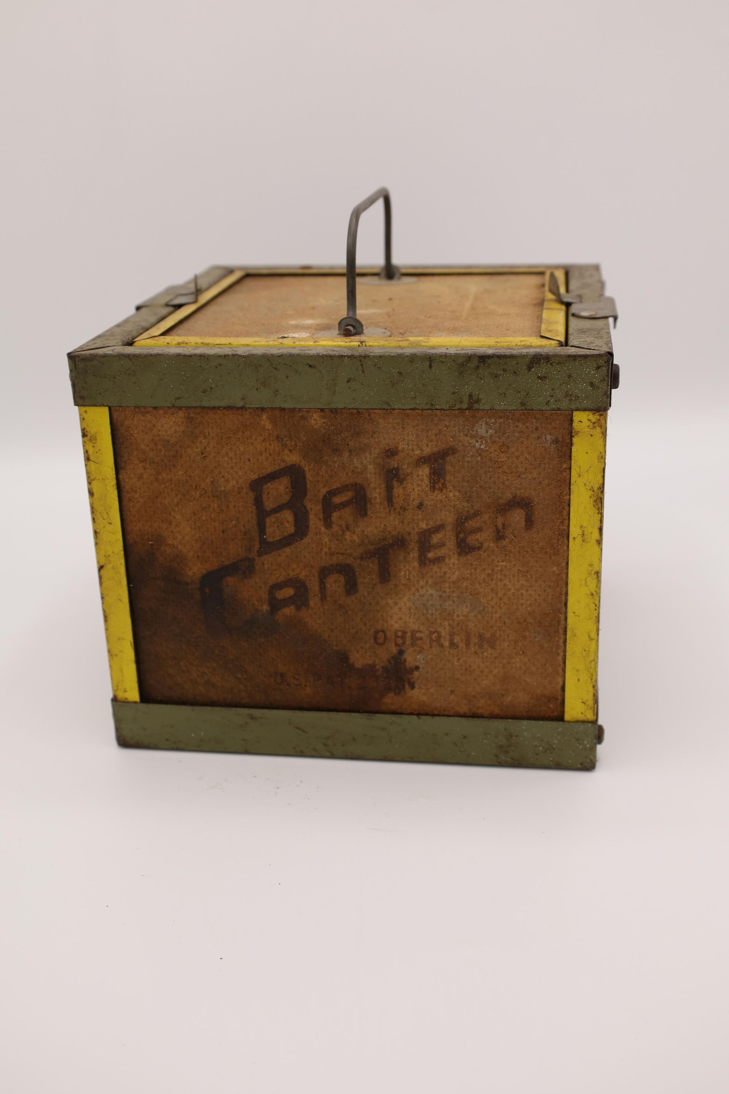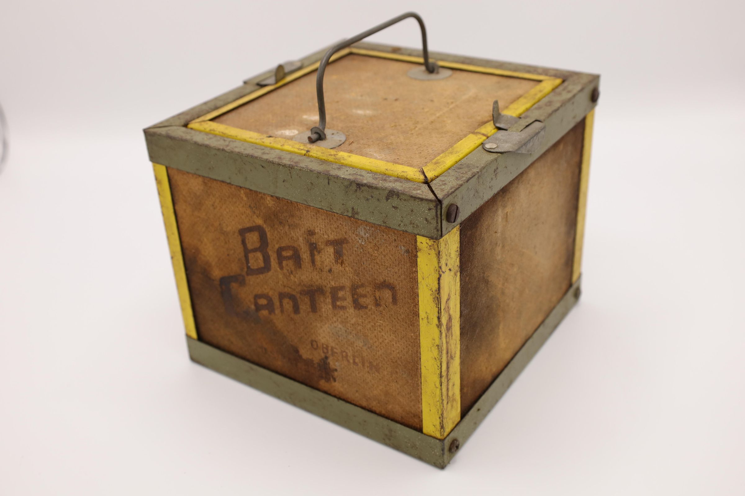 This bait canteen box from the 1960s has seen a lot of use. Manufactured by the Oberlin Canteen Company in Ohio, it measures 7" square by 6" tall. This canteen is made with a cork-like fiber on the sides, top, and bottom, metal along the edges and corners and has a metal handle. The Oberlin Bait-Canteen Company was founded in 1945 and closed in the 1980s.Location