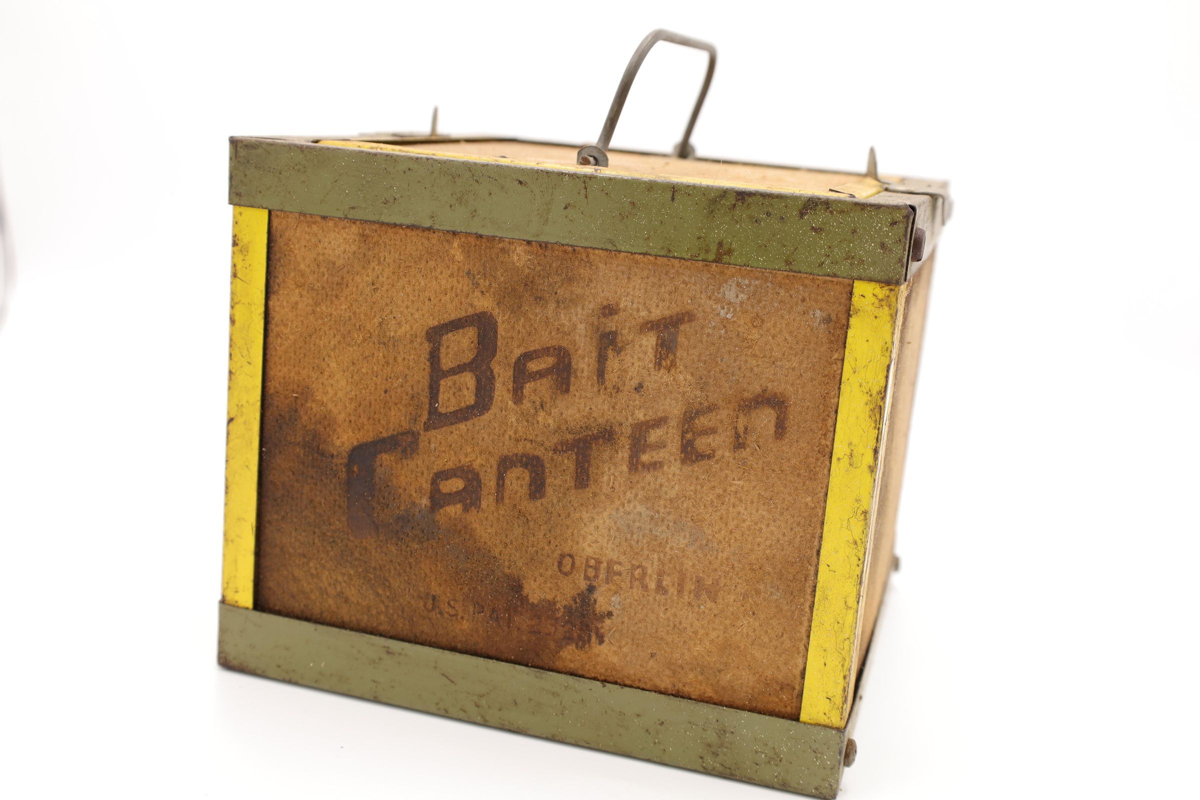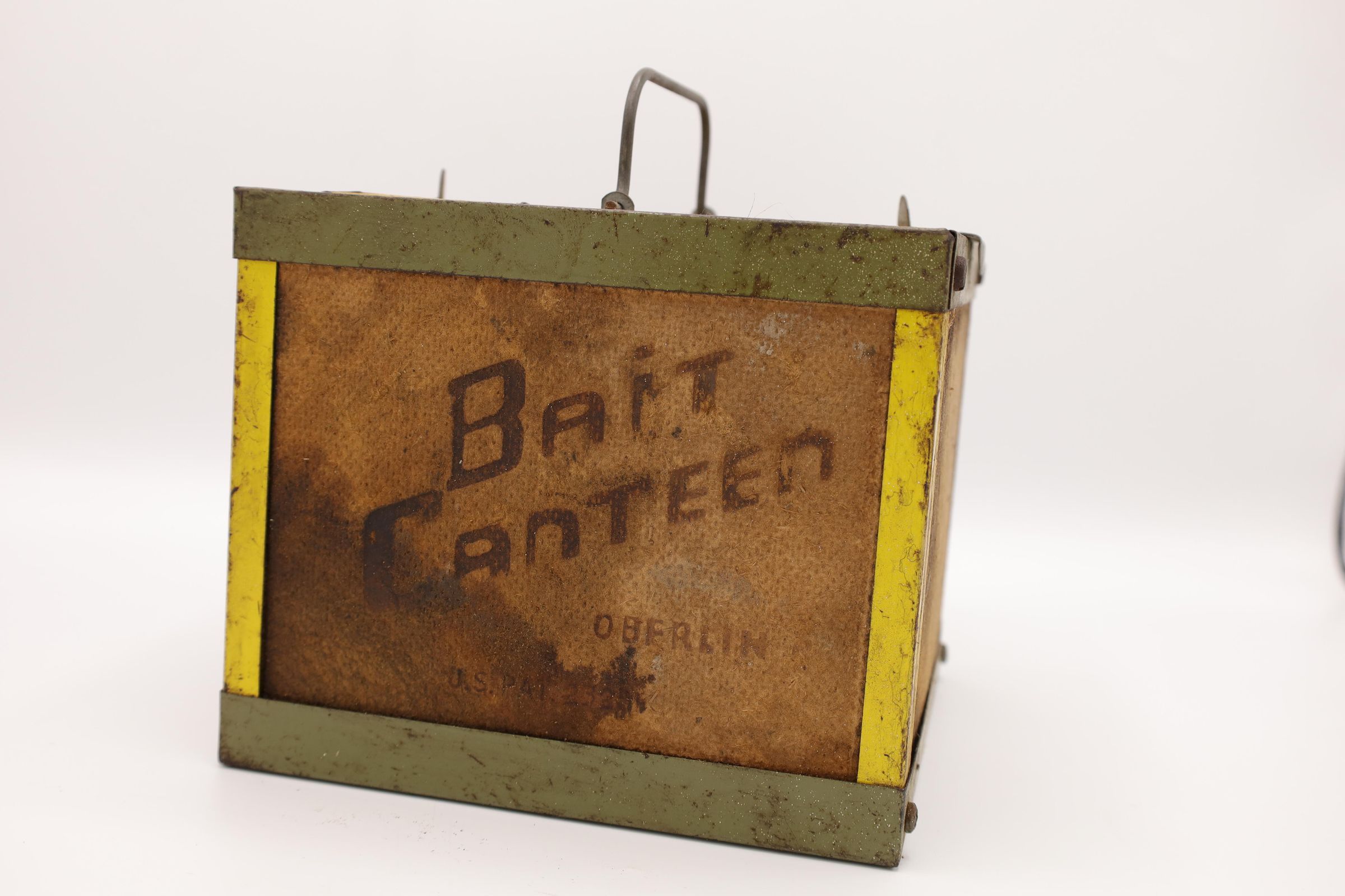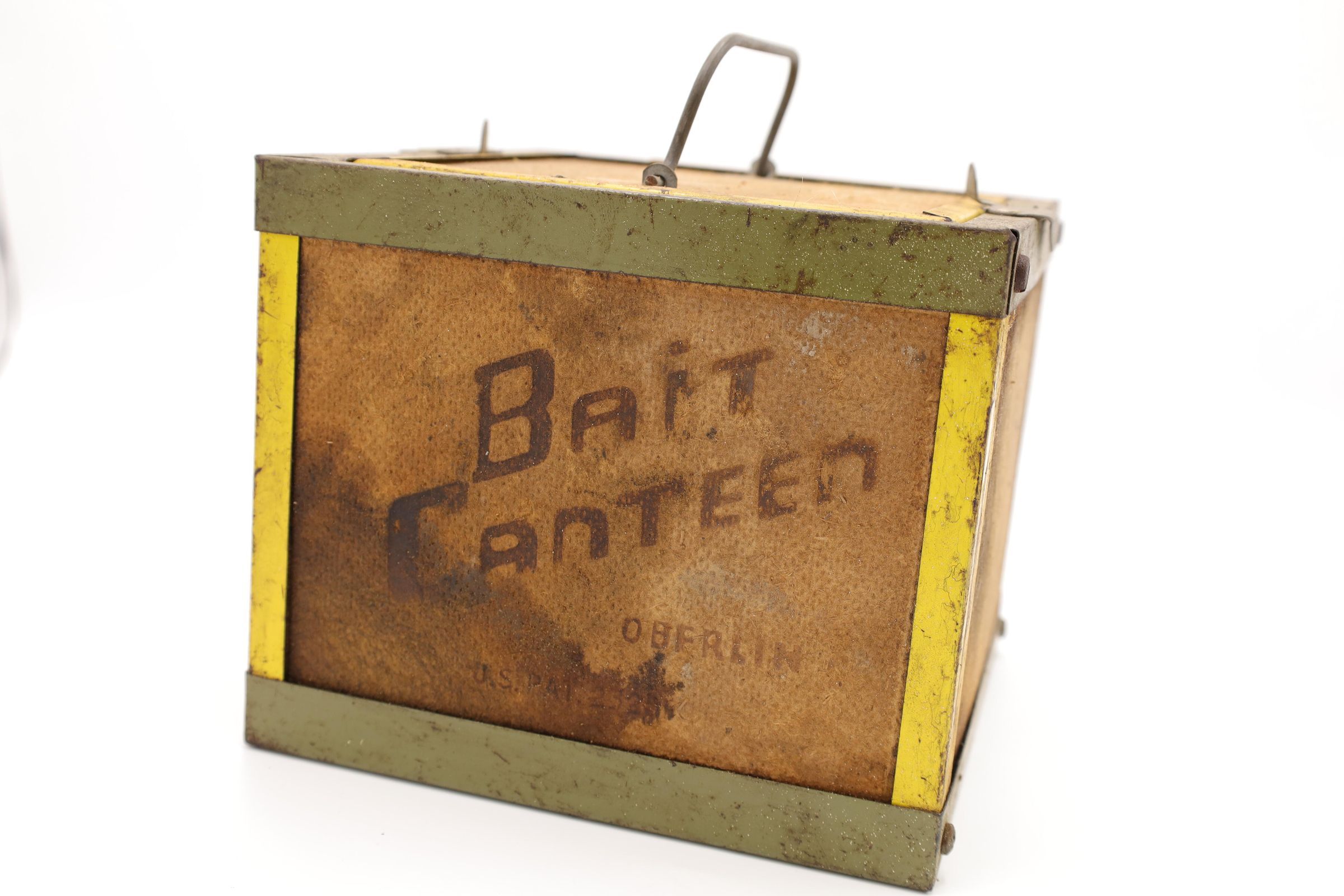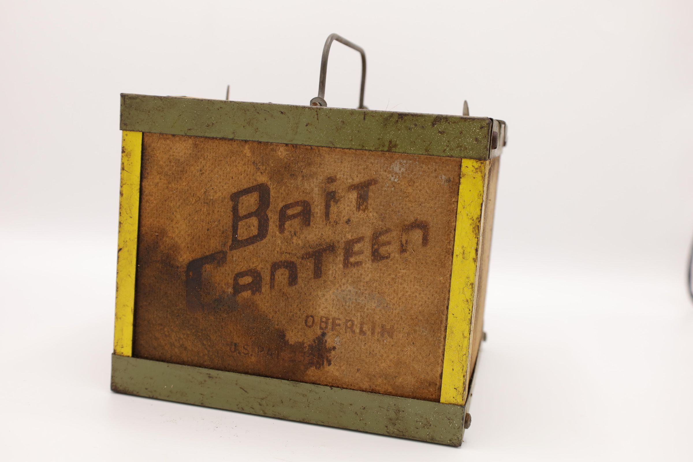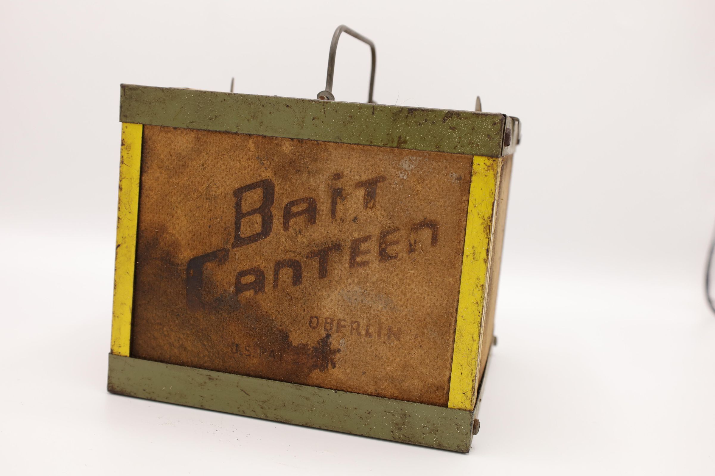 This bait canteen box from the 1960s has seen a lot of use. Manufactured by the Oberlin Canteen Company in Ohio, it measures 7" square by 6" tall. This canteen is made with a cork-like fiber on the sides, top, and bottom, metal along the edges and corners and has a metal handle. The Oberlin Bait-Canteen Company was founded in 1945 and closed in the 1980s.Location