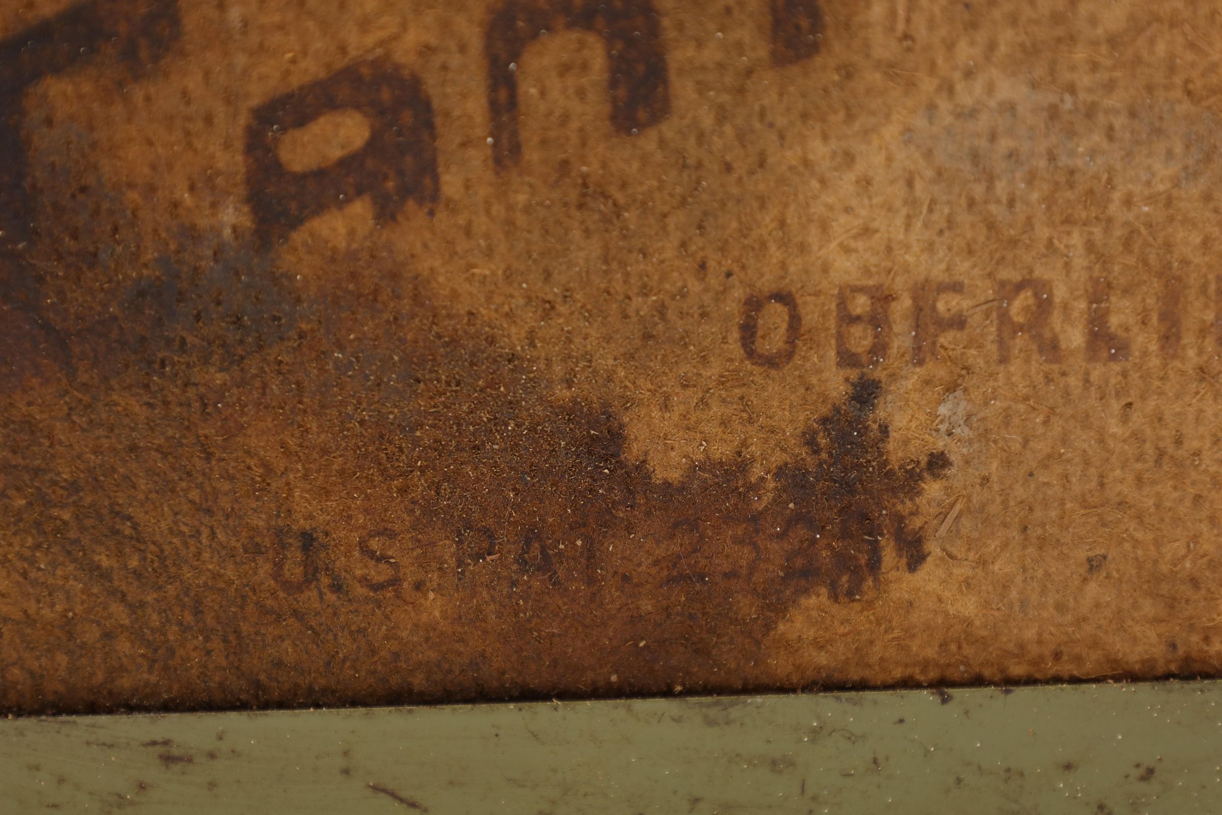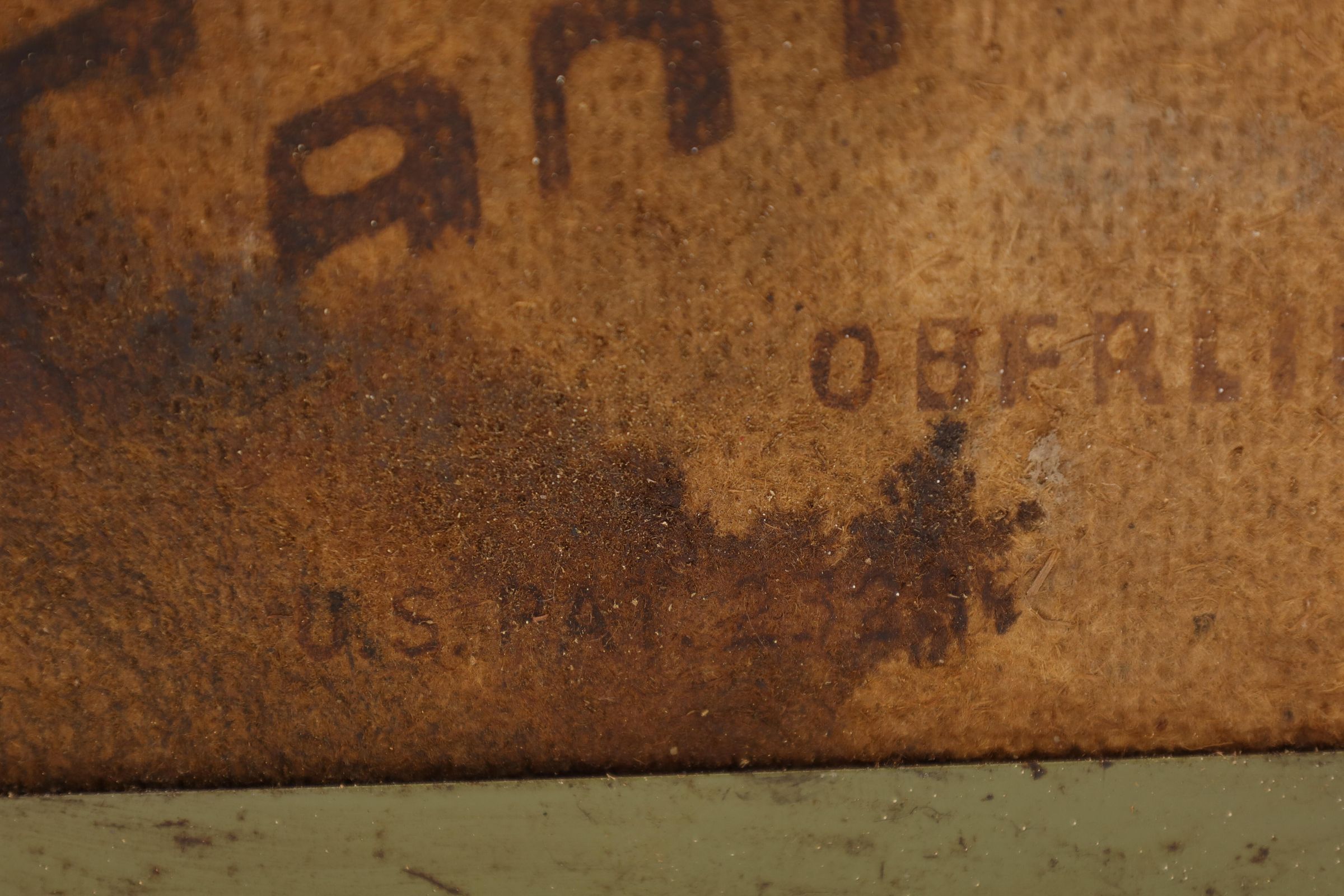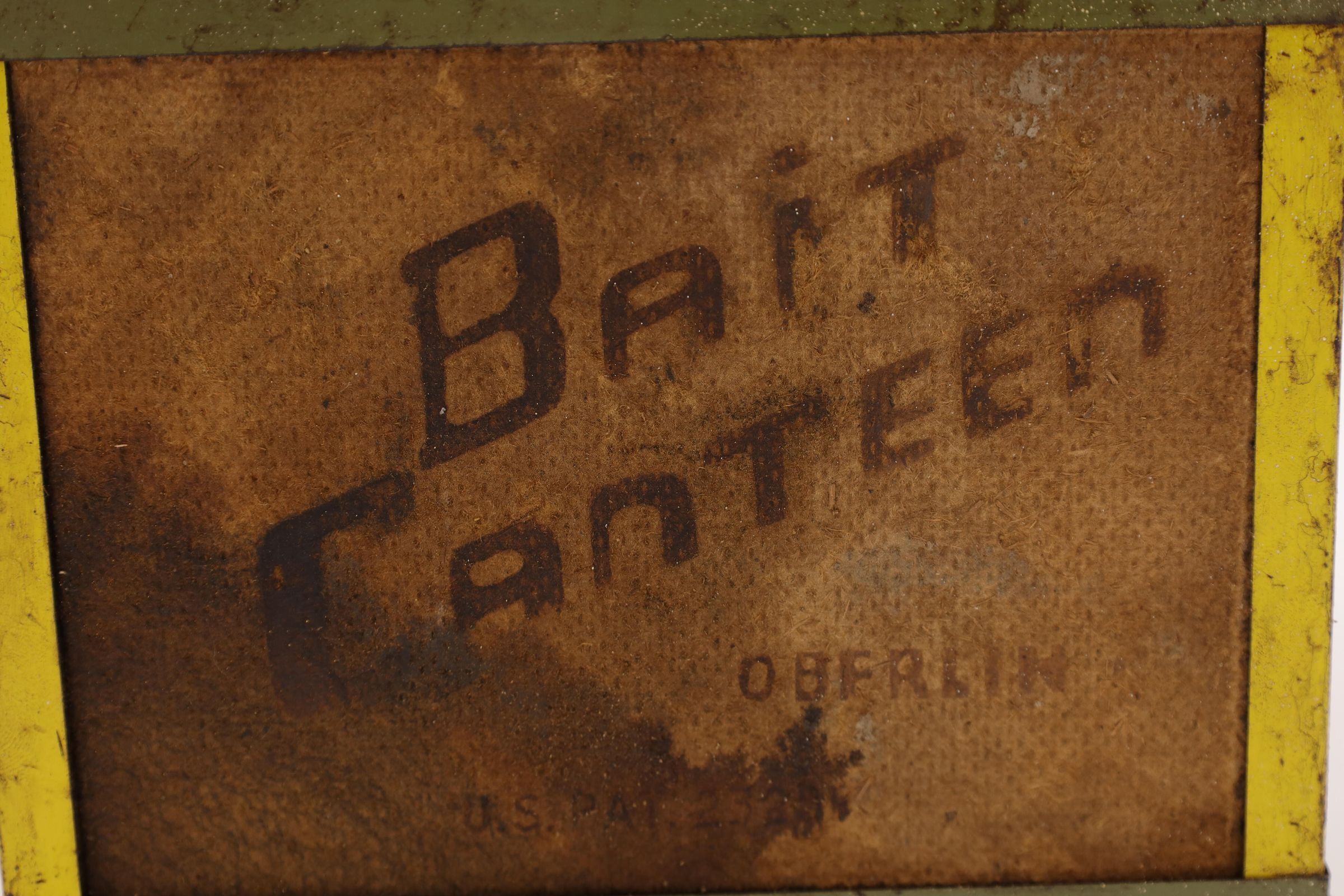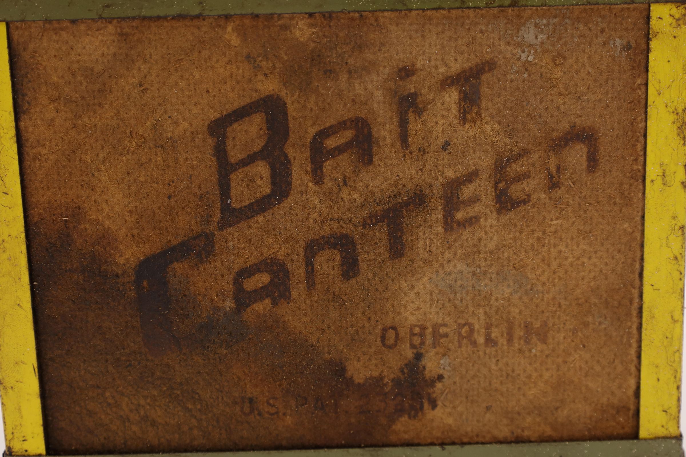 This bait canteen box from the 1960s has seen a lot of use. Manufactured by the Oberlin Canteen Company in Ohio, it measures 7" square by 6" tall. This canteen is made with a cork-like fiber on the sides, top, and bottom, metal along the edges and corners and has a metal handle. The Oberlin Bait-Canteen Company was founded in 1945 and closed in the 1980s.Location