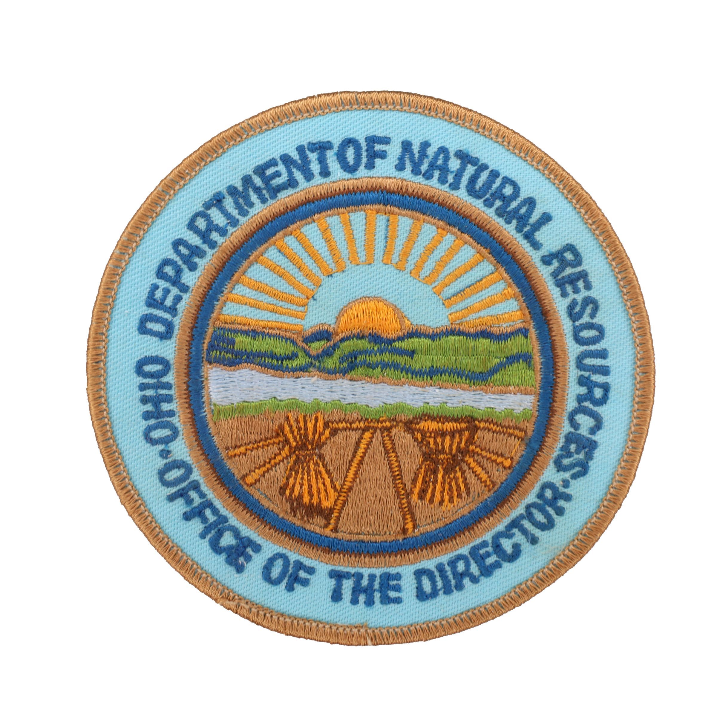 This embroidered round patch has a light blue background, a beige border, and Ohio Department of Natural Resources Office of The Director in blue letters. The patch features the Great Seal of the State of Ohio in its center.