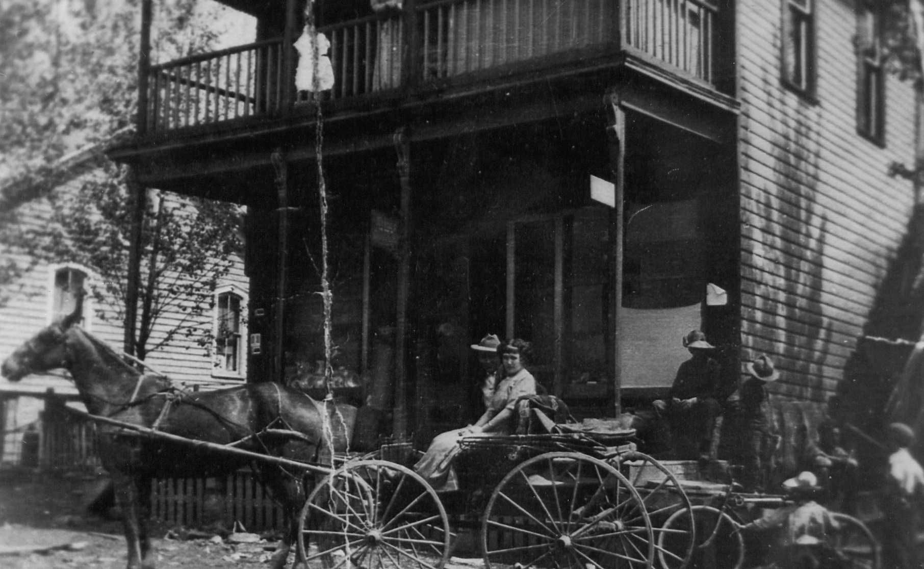 The Gibson family (seated in the carriage) stop outside the Brady General Store and pose for a picture. A handful of men and boys sit and stand around the storefront. The Salt Fork region had many bustling villages that were razed during Salt Fork Lake's impoundment.
