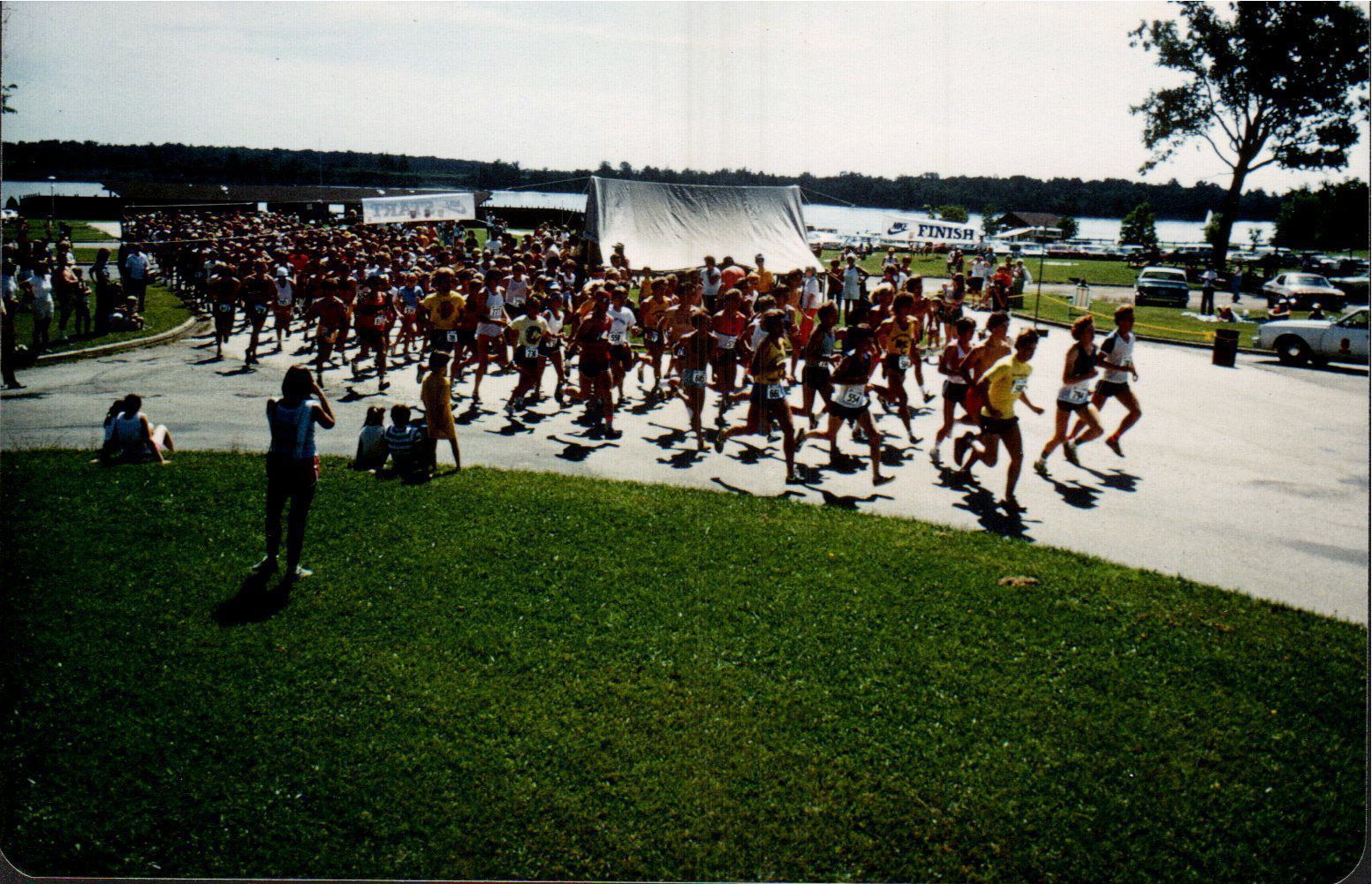Hundreds of runners begin a marathon by the Delaware State Park beach in 1980.