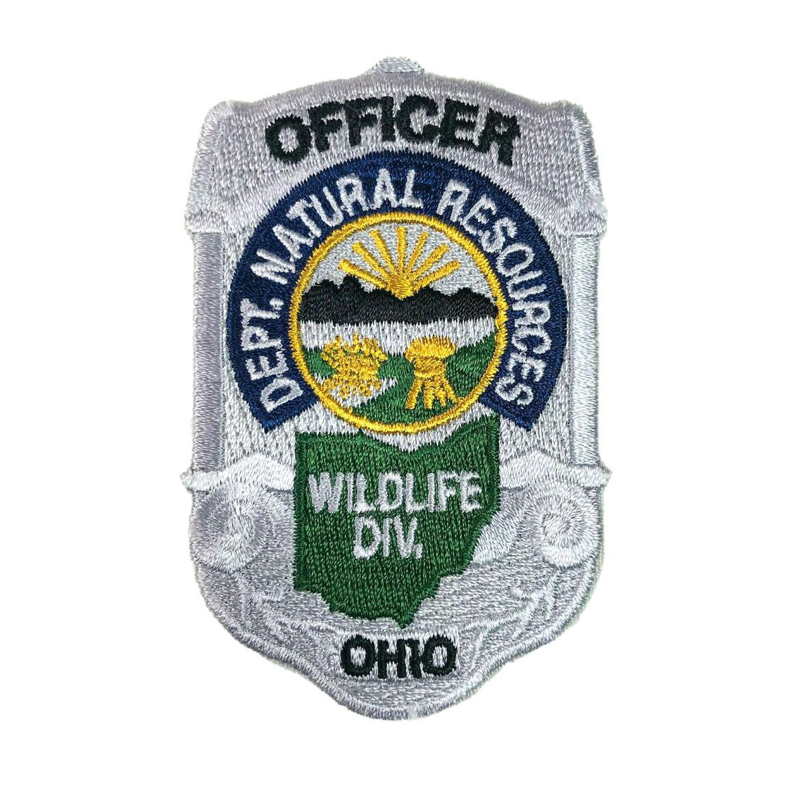 With it's badge shape and silver/white background, this patch would be worn by a wildlife officer. On the silver/white background are the words "Officer" and "Ohio" in black. "Dept. Natural Resources" is written in white on a blue background, and "Wildlife Div." in white letters is on a green background in the shape of the state of Ohio. The Great Seal of Ohio is featured in the center of the patch.