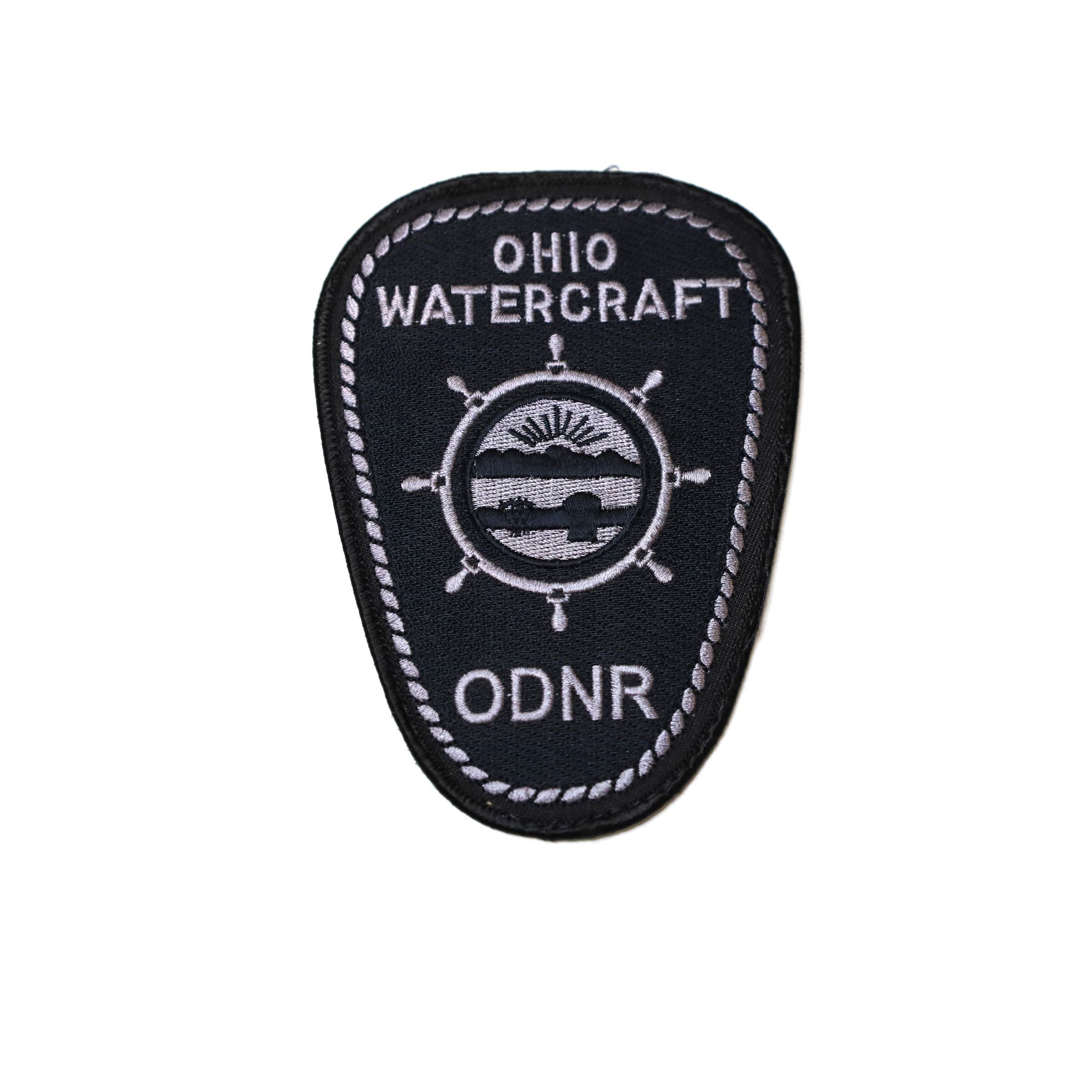The Natural Resources Division of Watercraft officers wore this patch from 2012 to 2016. The black and white patch includes the State of Ohio Seal in the center of a ship's helm. Above it is embroidered Ohio Watercraft and below it is the abbreviation ODNR for the Department of Natural Resources.