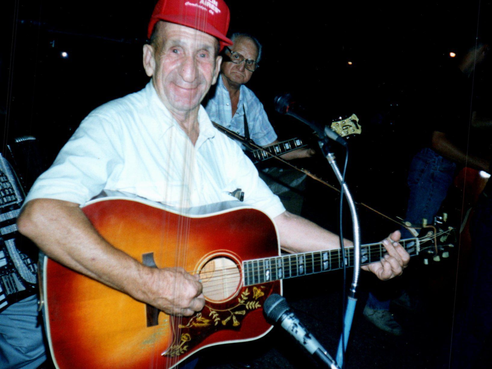 Blue Rock State Park often hosts a Mark Twain Day celebration during the summer. Rather than celebrate the life and work of prominent American author Samuel Clemens (1835-1910) who wrote novels under the pen name "Mark Twain," this is a weekend event filled with traditional music, fun, and food from the 1870s. In this photograph, a guitarist poses for a picture in the middle of a folk music concert.