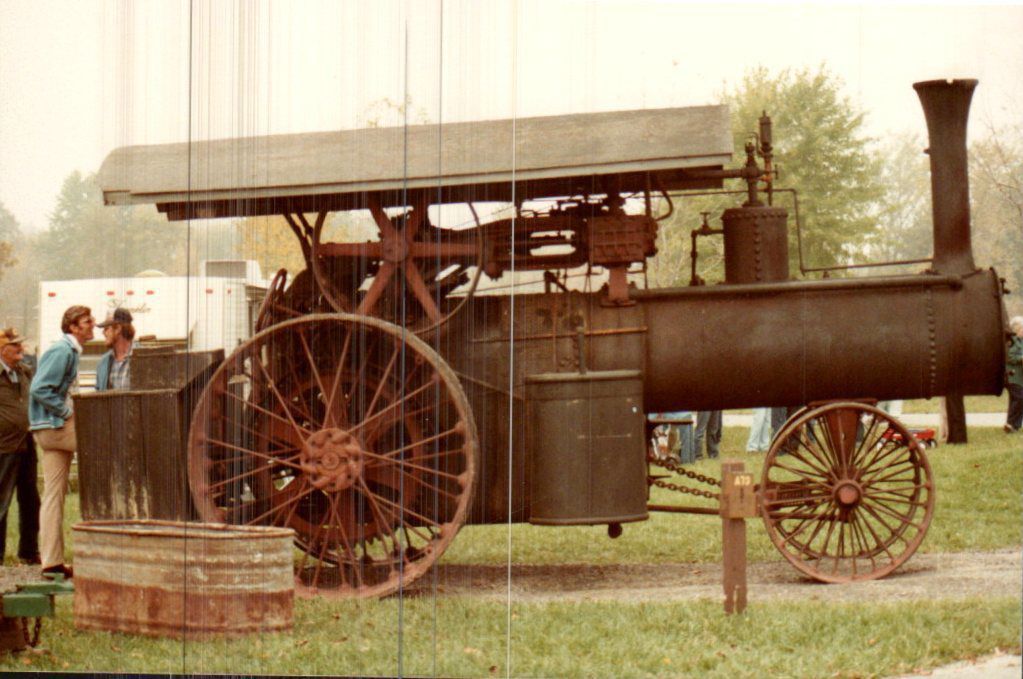 A historic, steam-driven tractor on display during an event at Indian Lake State Park. Parkgoers are interested in the tractor and one visitor in a light-blue jacket carefully inspects it.Cataloged By
