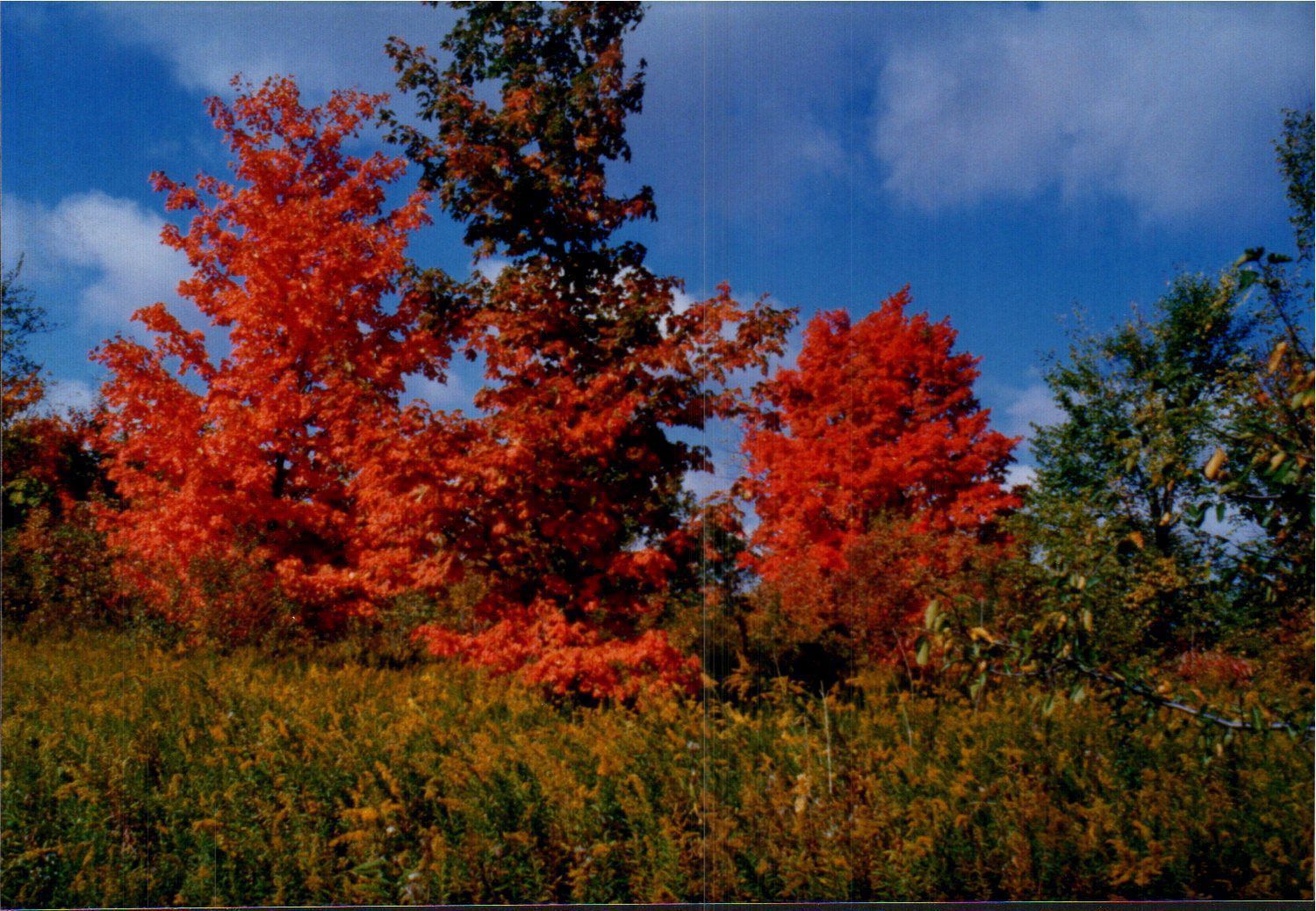 Trees at Delaware State Park have turned a brilliant shade of bright orange. Goldenrod spring up in the field below.