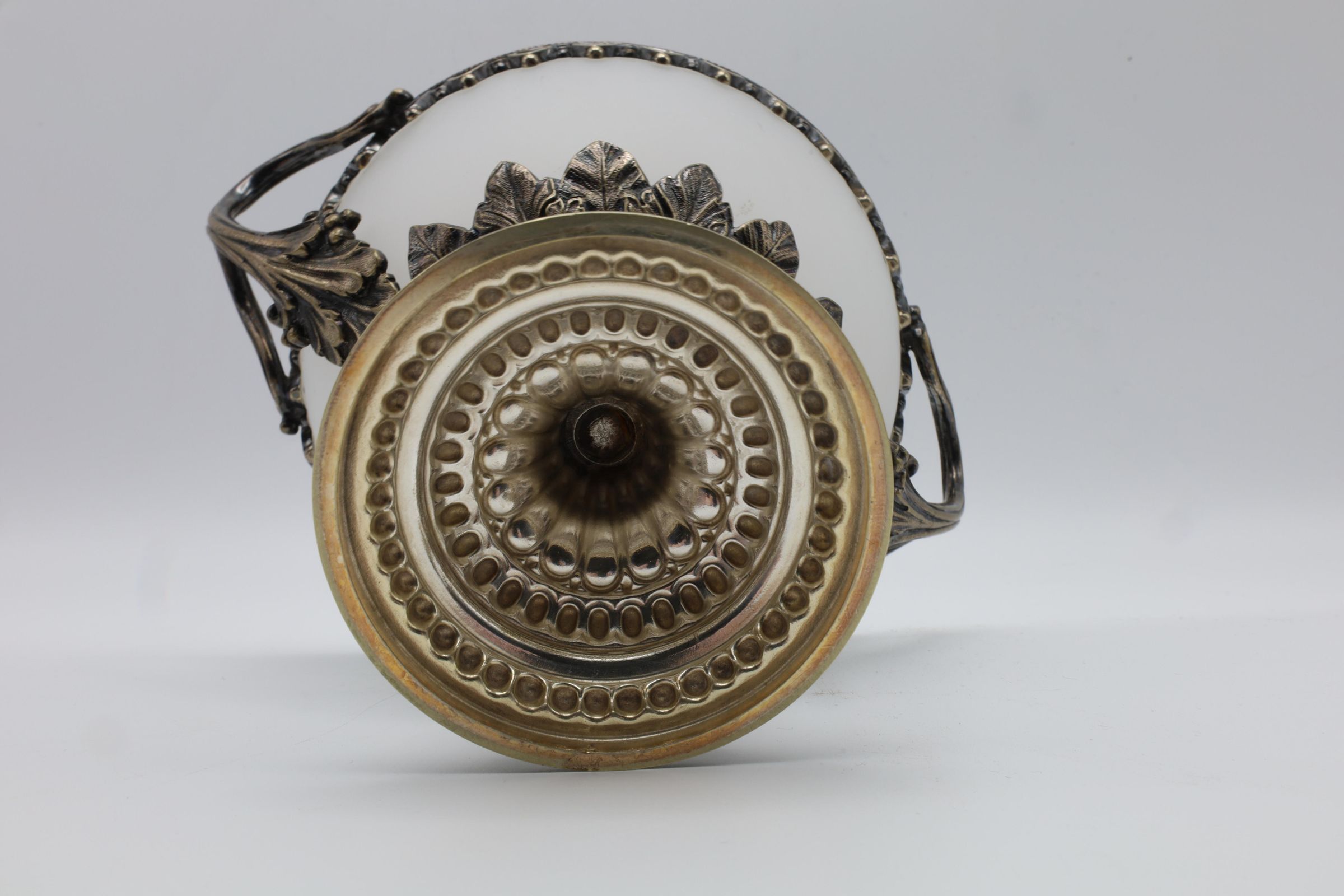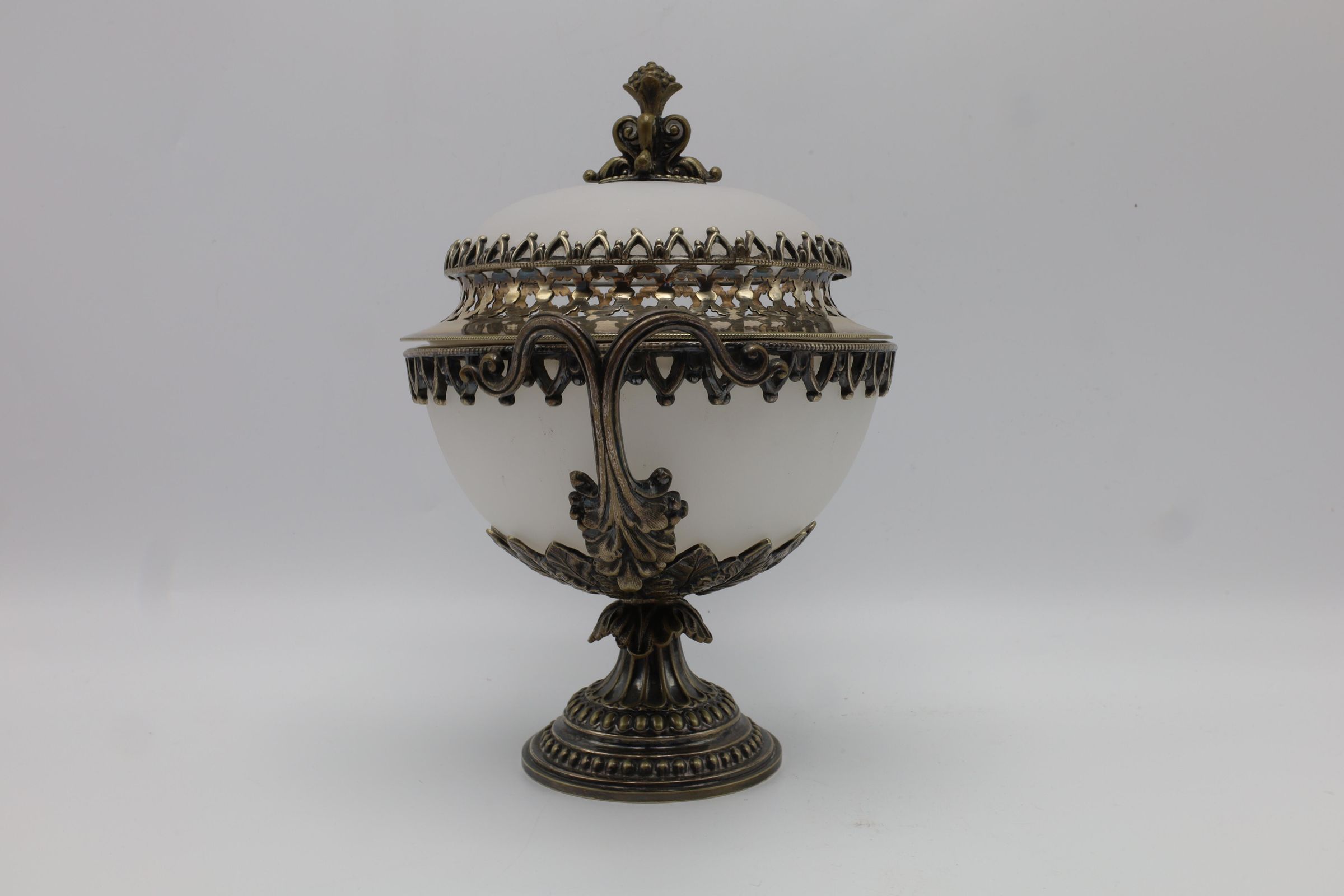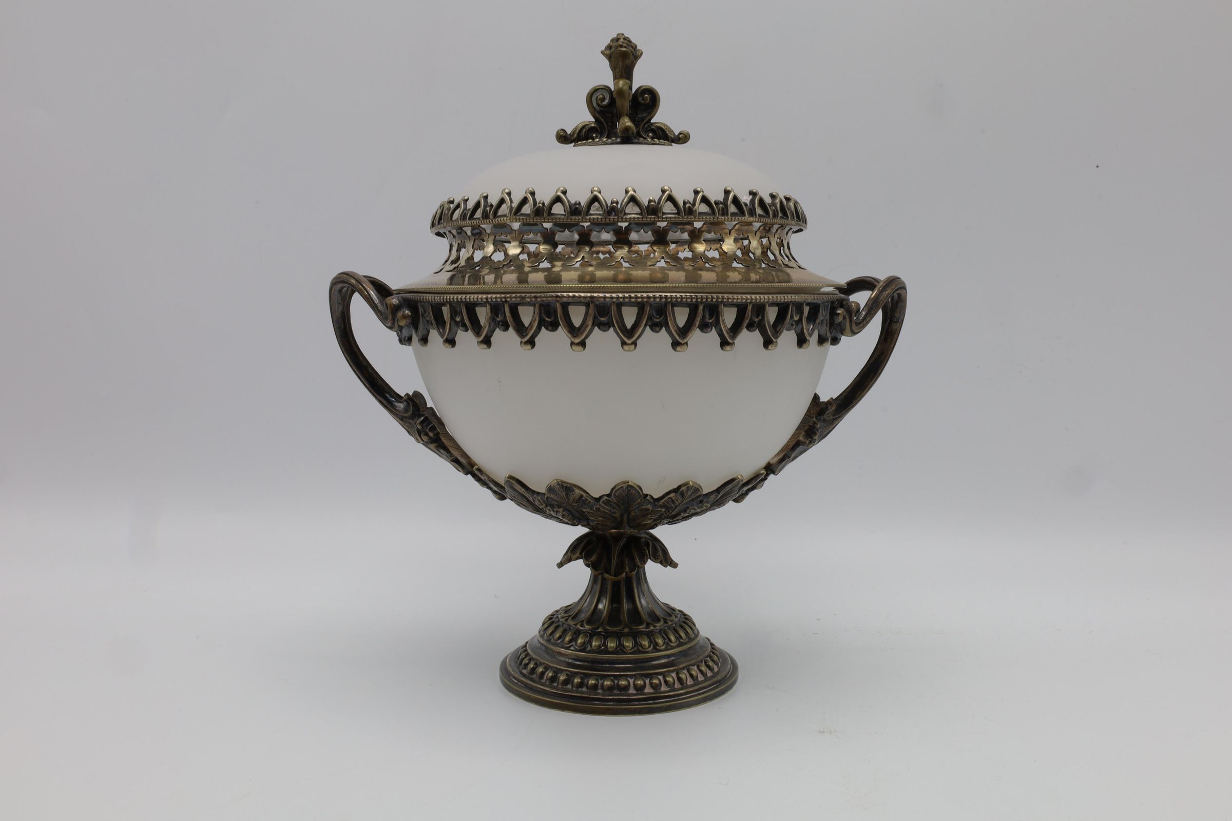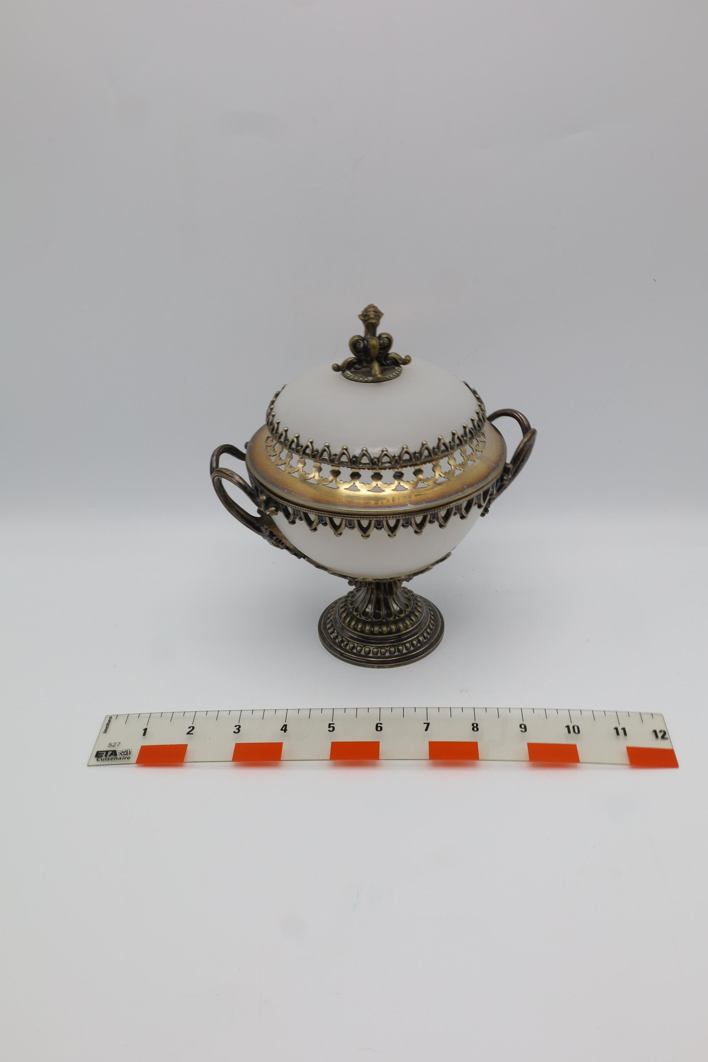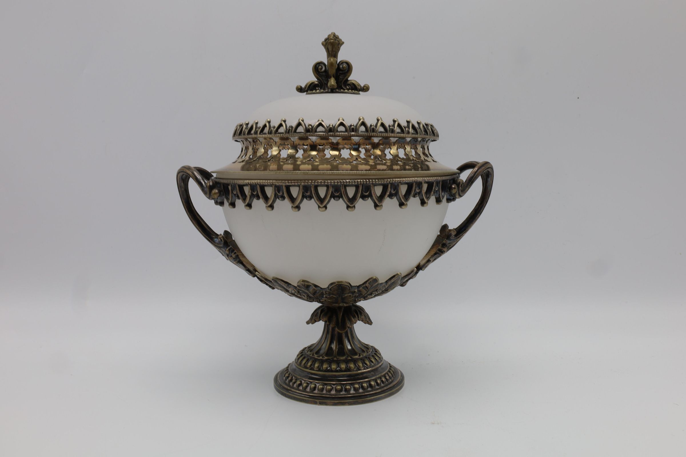 Covered, handled, and footed dish composed of frosted glass and metal fittings. Overall shape of the object is biconal framed with elaborately detailed brass-tone trim, pedestal base, and two handles. The lid has a brass tone finial top, while the glass components are of opaque white frosted glass.Location