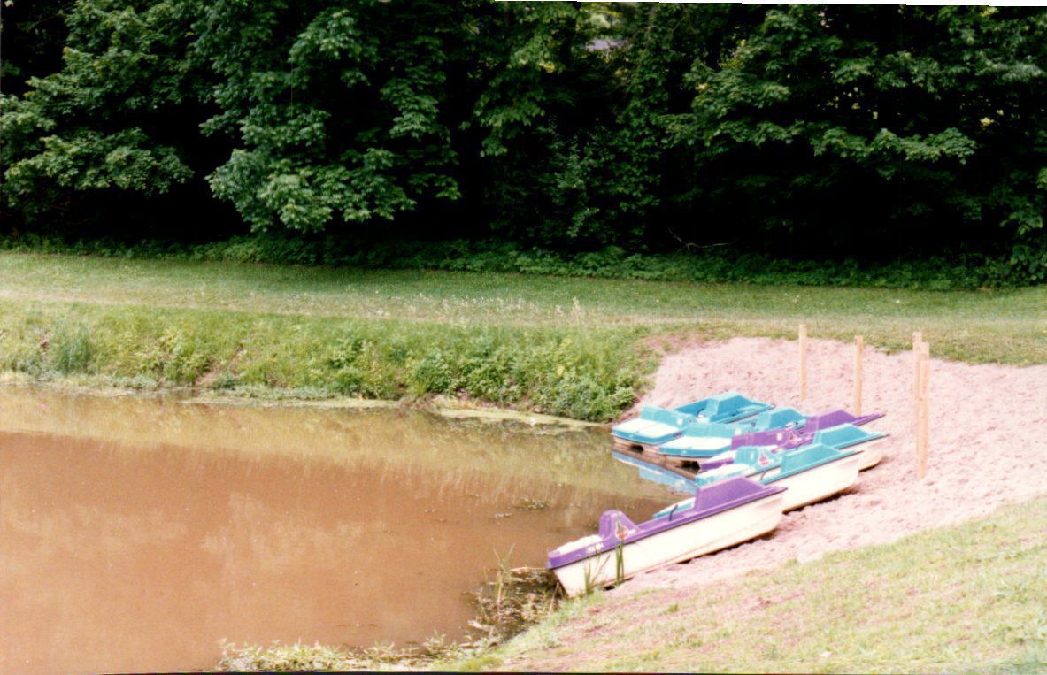 Paddleboats are docked and tied to posts on a sandy beach along the shore of Mount Gilead Lake at Mt. Gilead State Park.