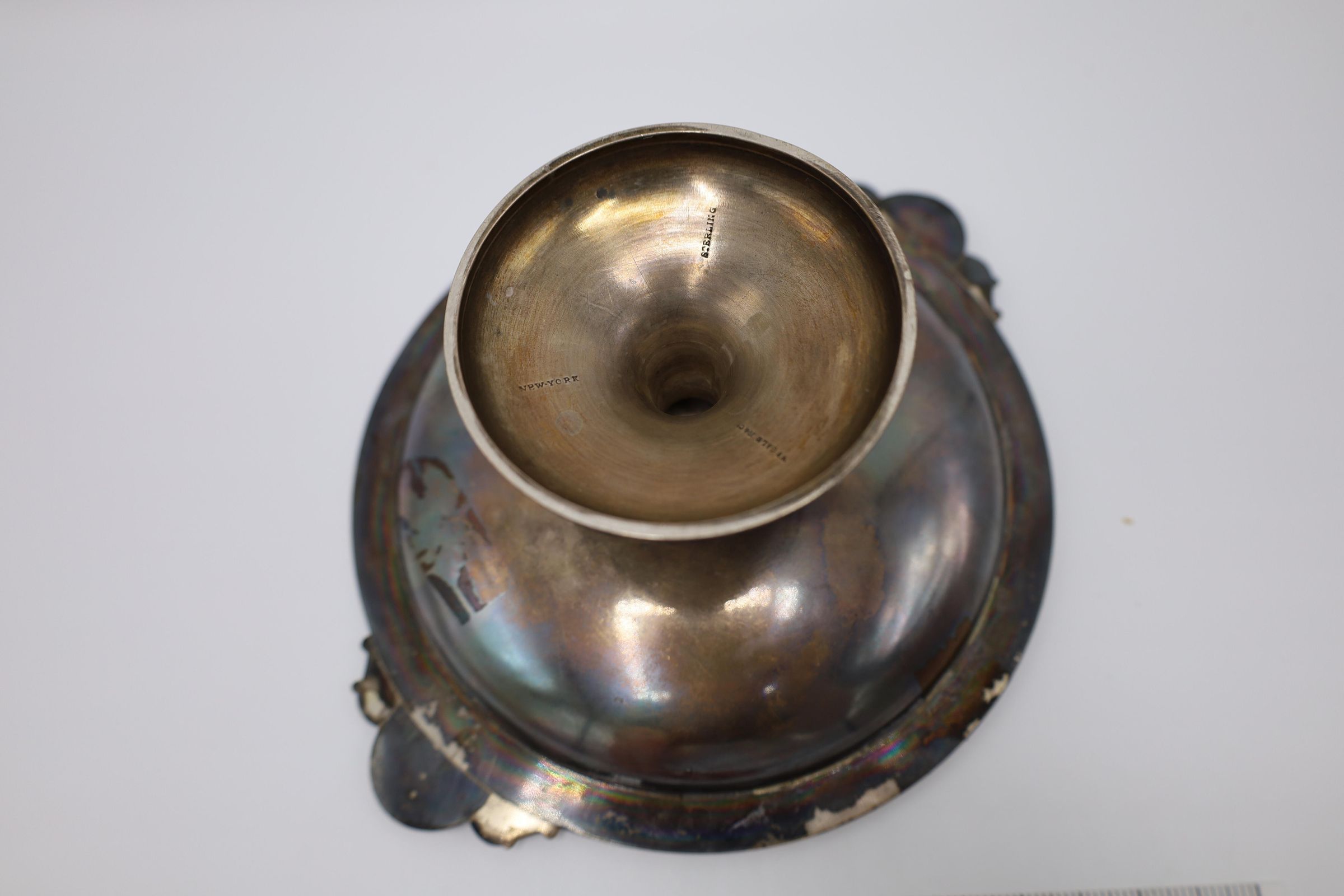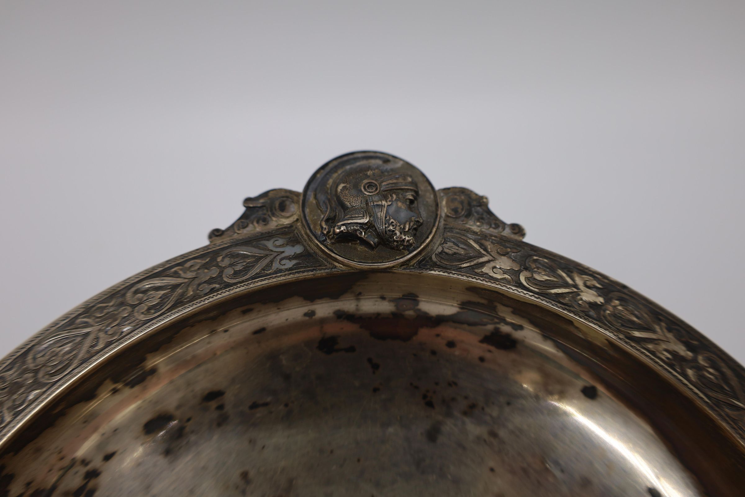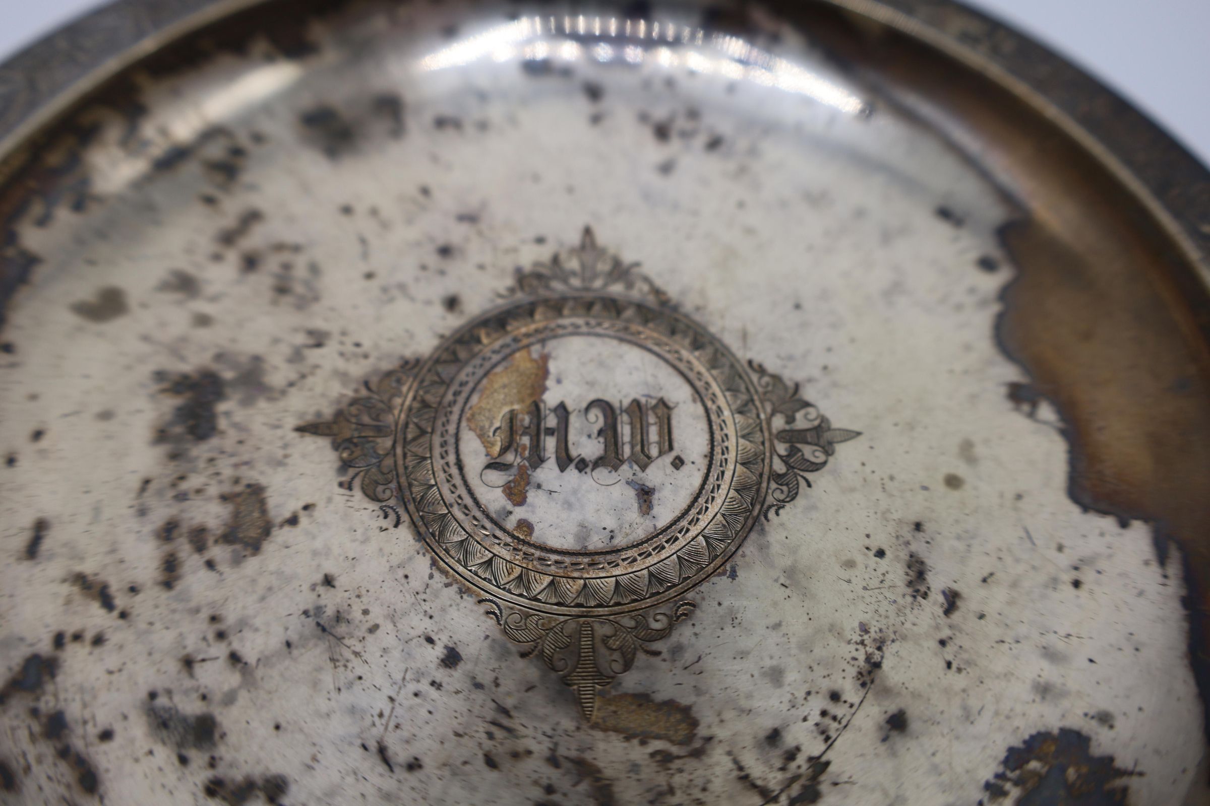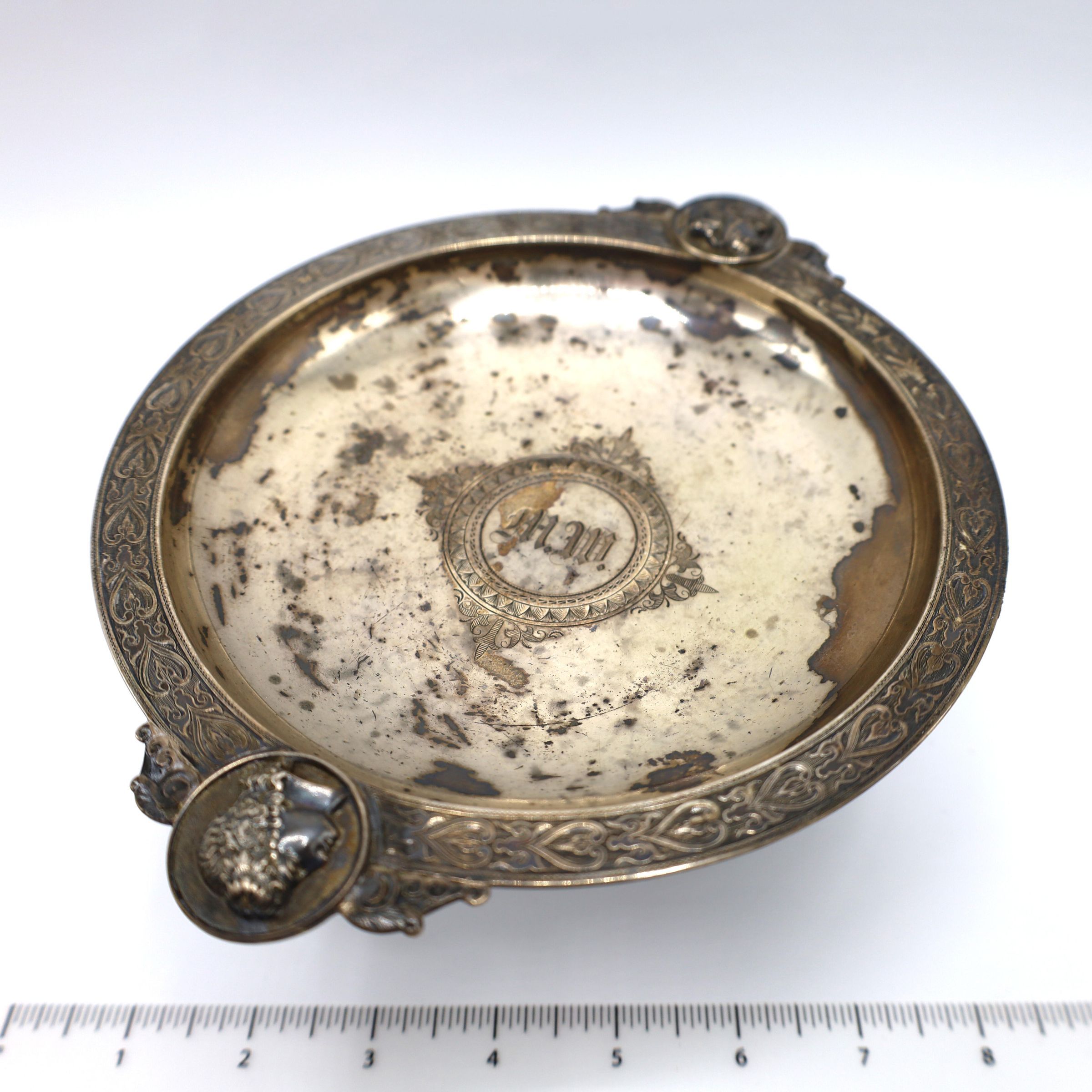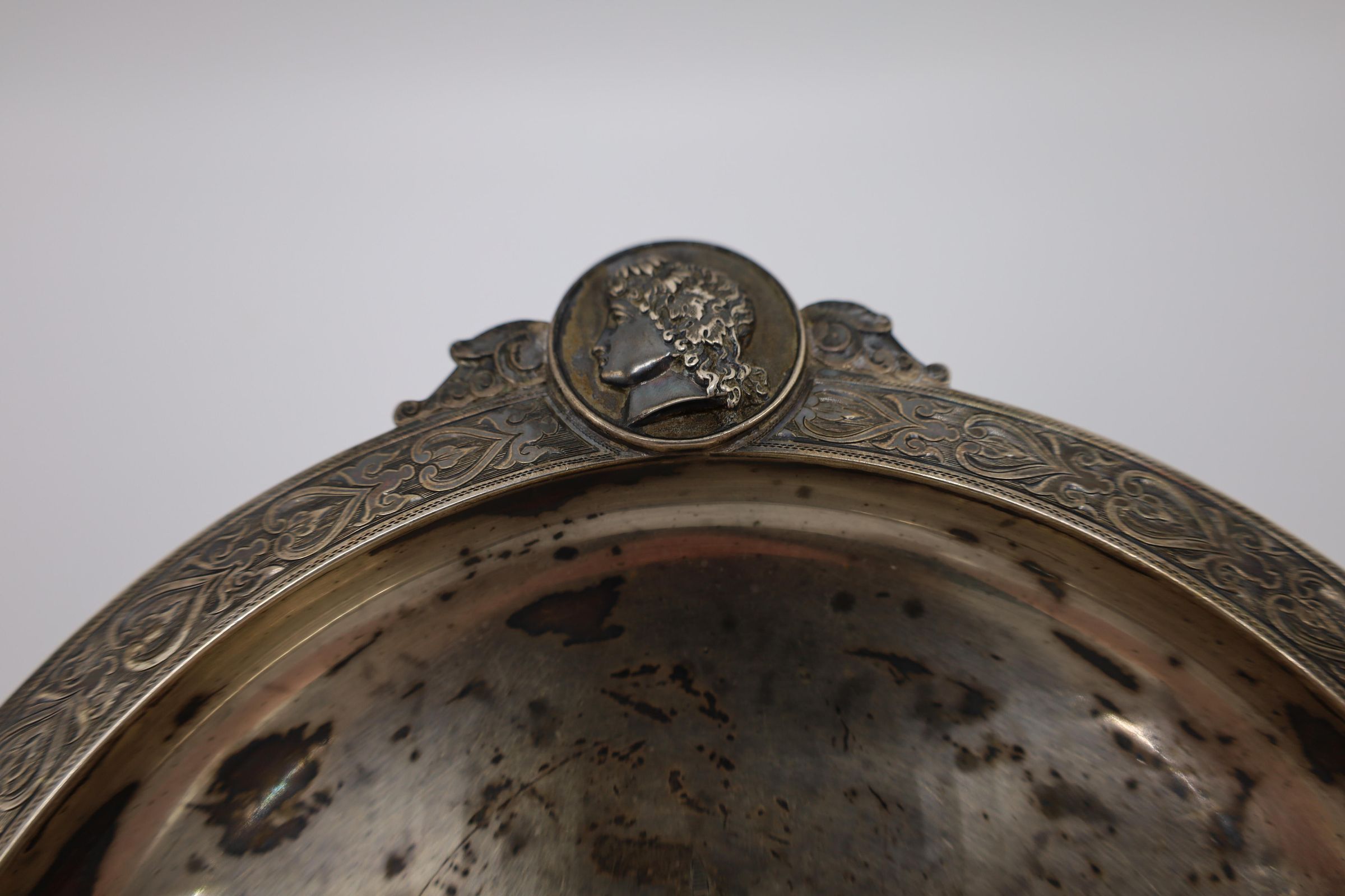 This is a silver-plated pedestal serving dish. Decorations and embellishments include two profiles: one of a solider and the other of a woman. The stylized leaf border follows the Classical theme of the two decorative medals. There is a central monogram of "M.W." Dishes of this style served many purposes, including holding small servings during a meal, or use as a decorative piece to receive mail or keys. Marked 'STERLING'.Location