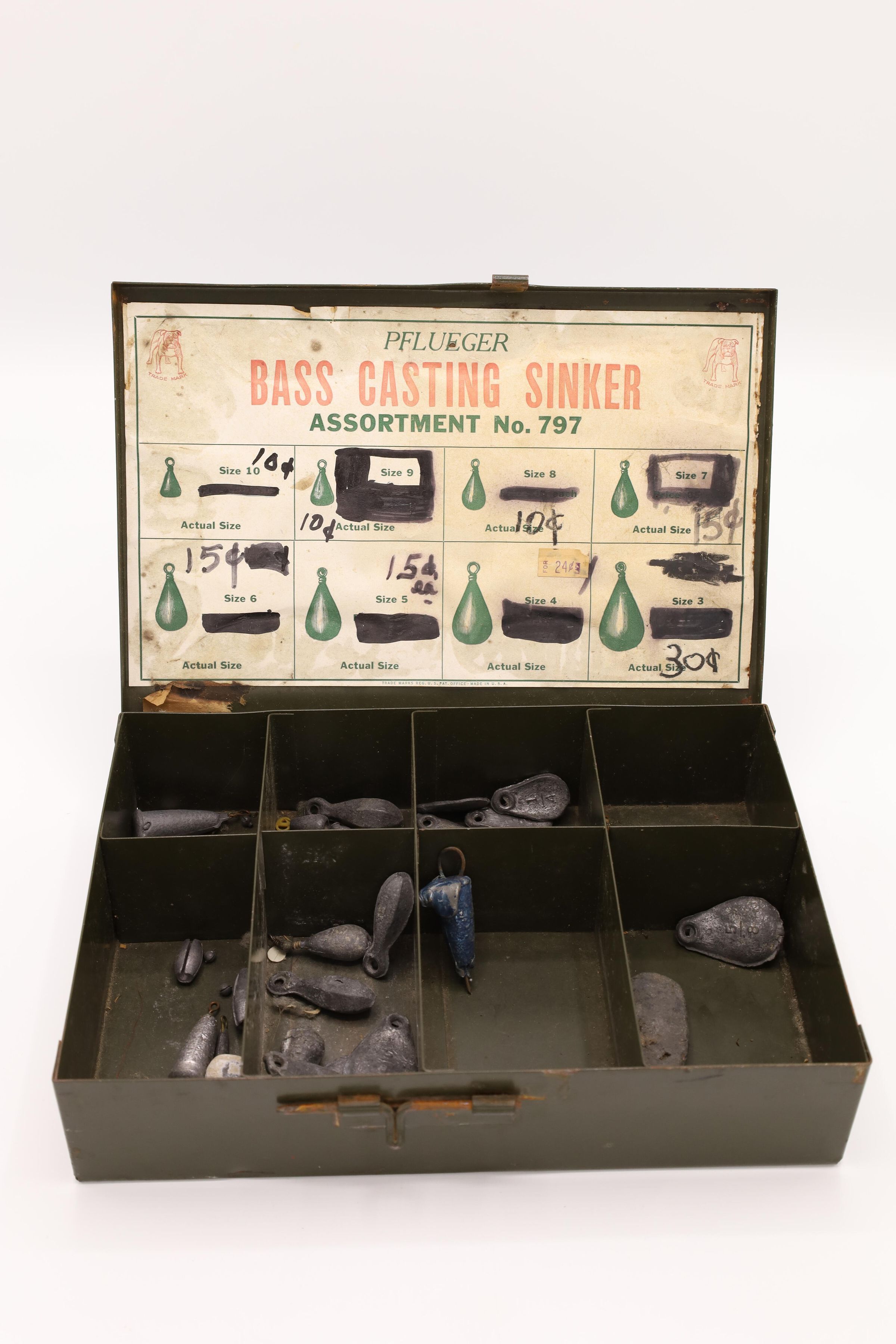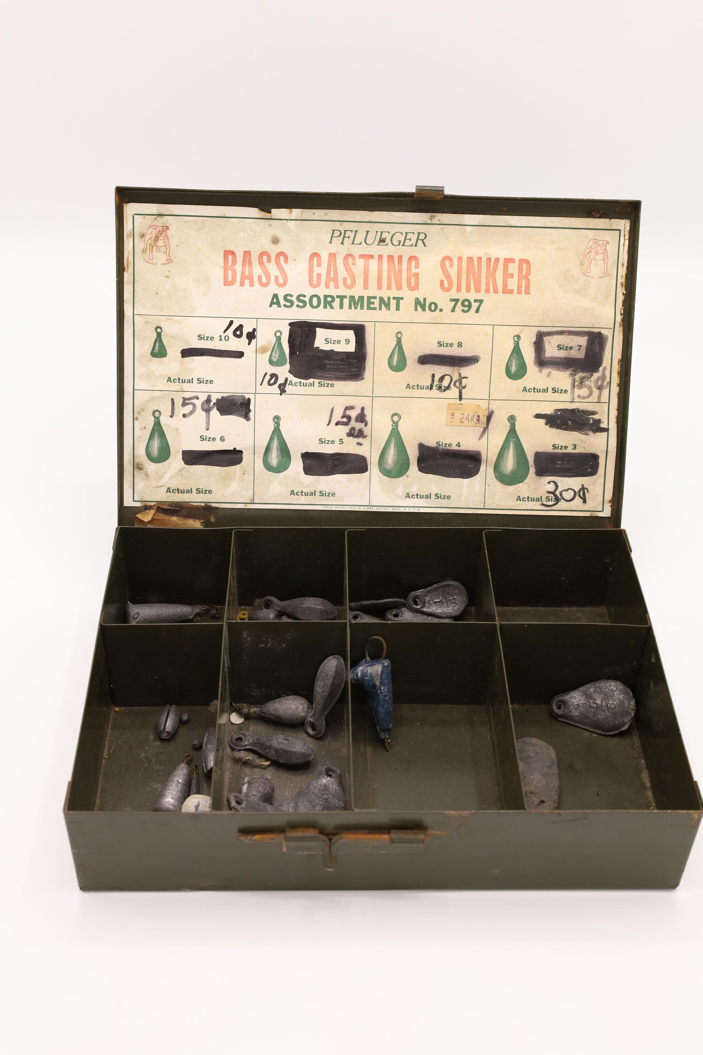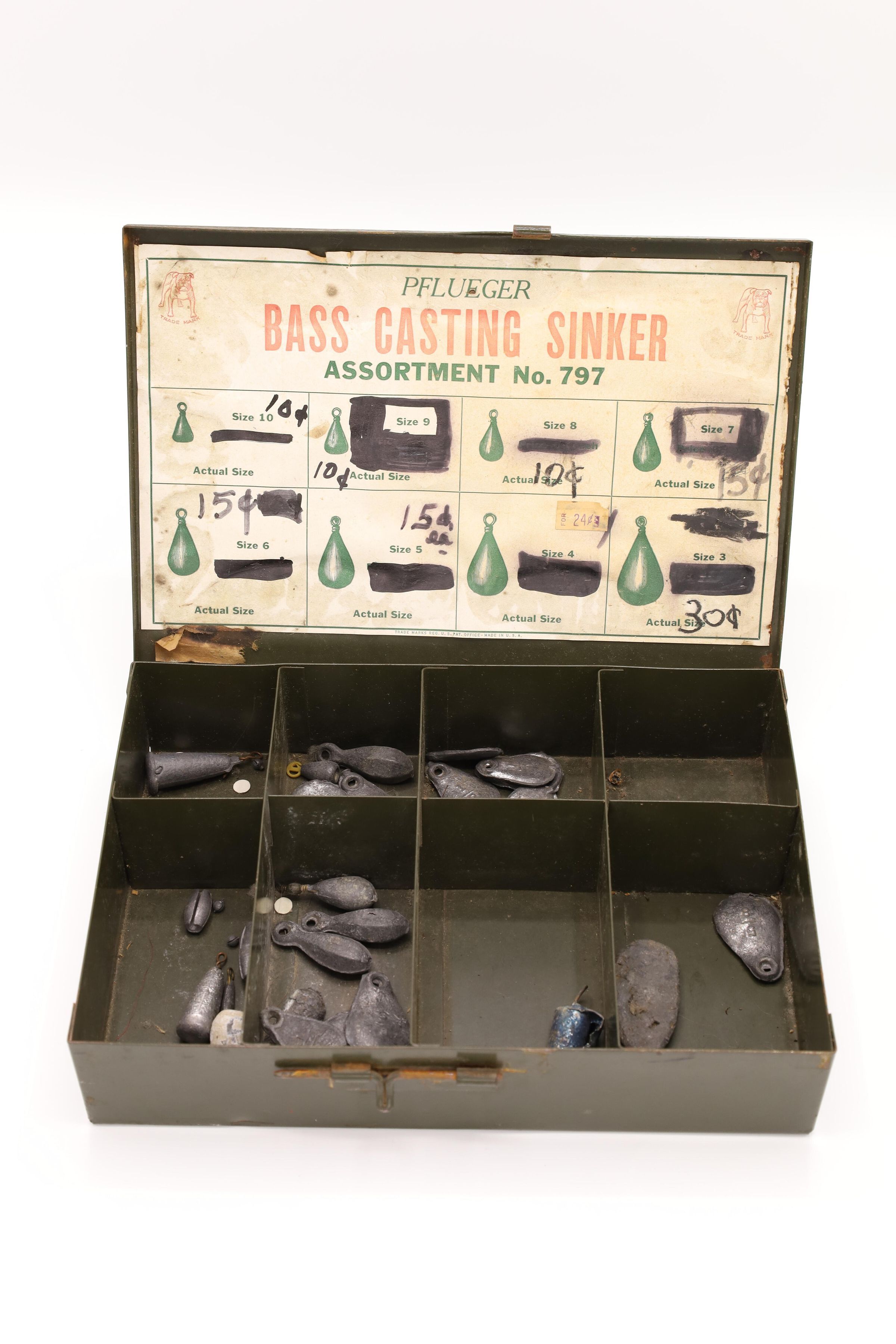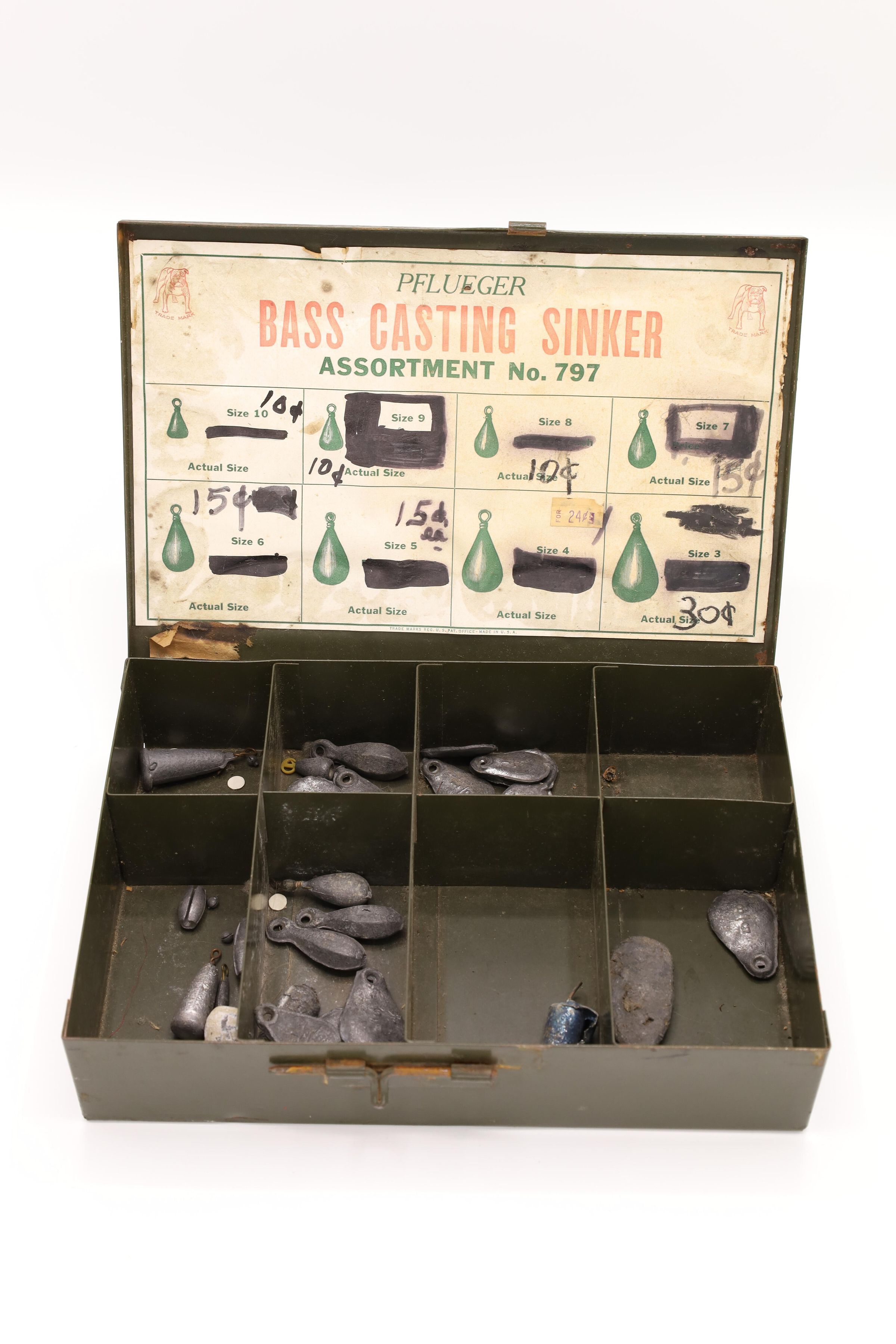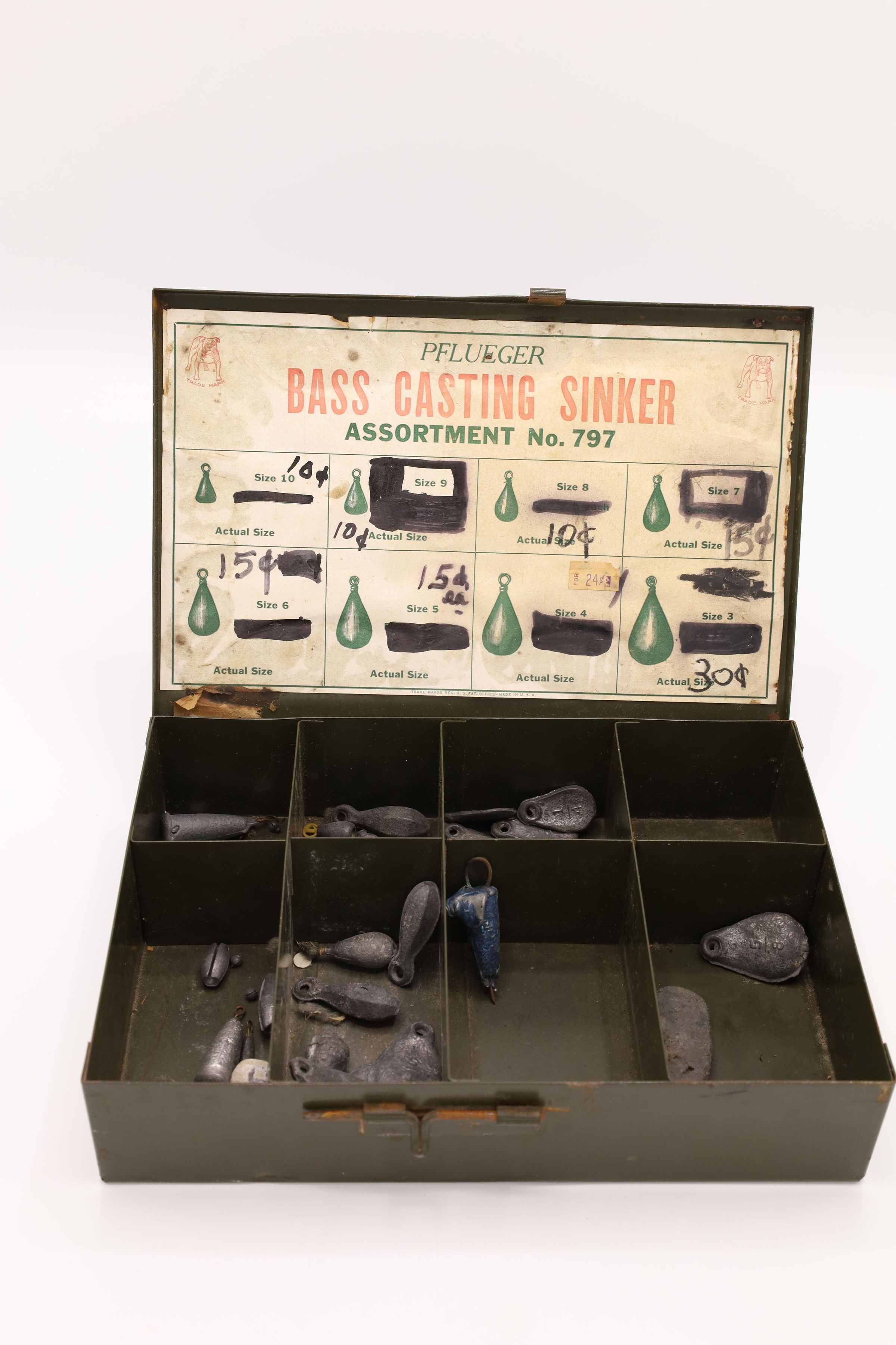 This sales box containing Pflueger Bass Casting Sinkers, Assortment No. 797, has the Pflueger bulldog trademark in the top corners and 8 sinker compartments. F. Pflueger founded a fish hook company called the Enterprise Manufacturing Company in 1881 in Akron, Ohio. His son E. A. Pflueger expanded the company and founded the E. A. Pflueger Company that is still in business today. The original prices, ranging from 4-14 cents, are blacked out and replaced with updated prices on this box.Location
