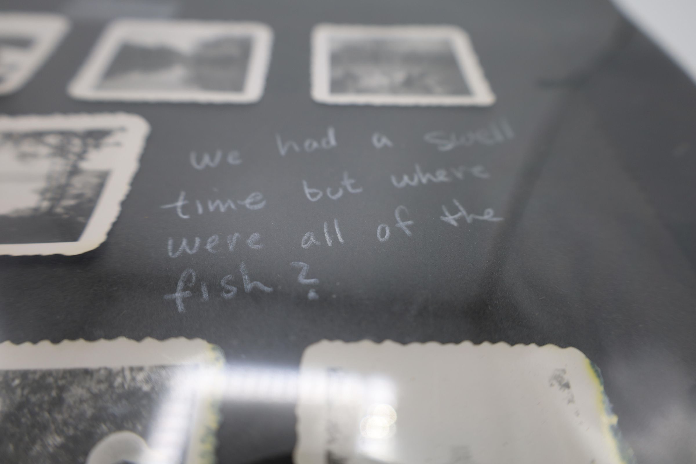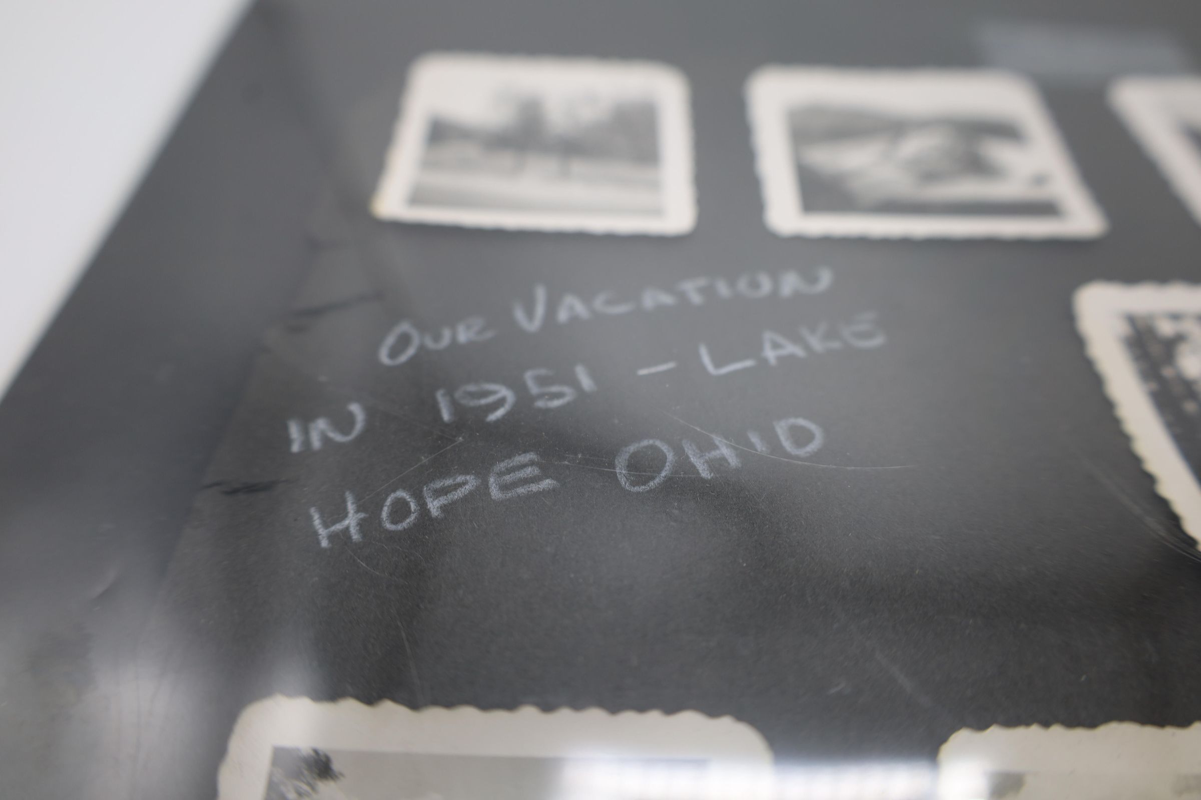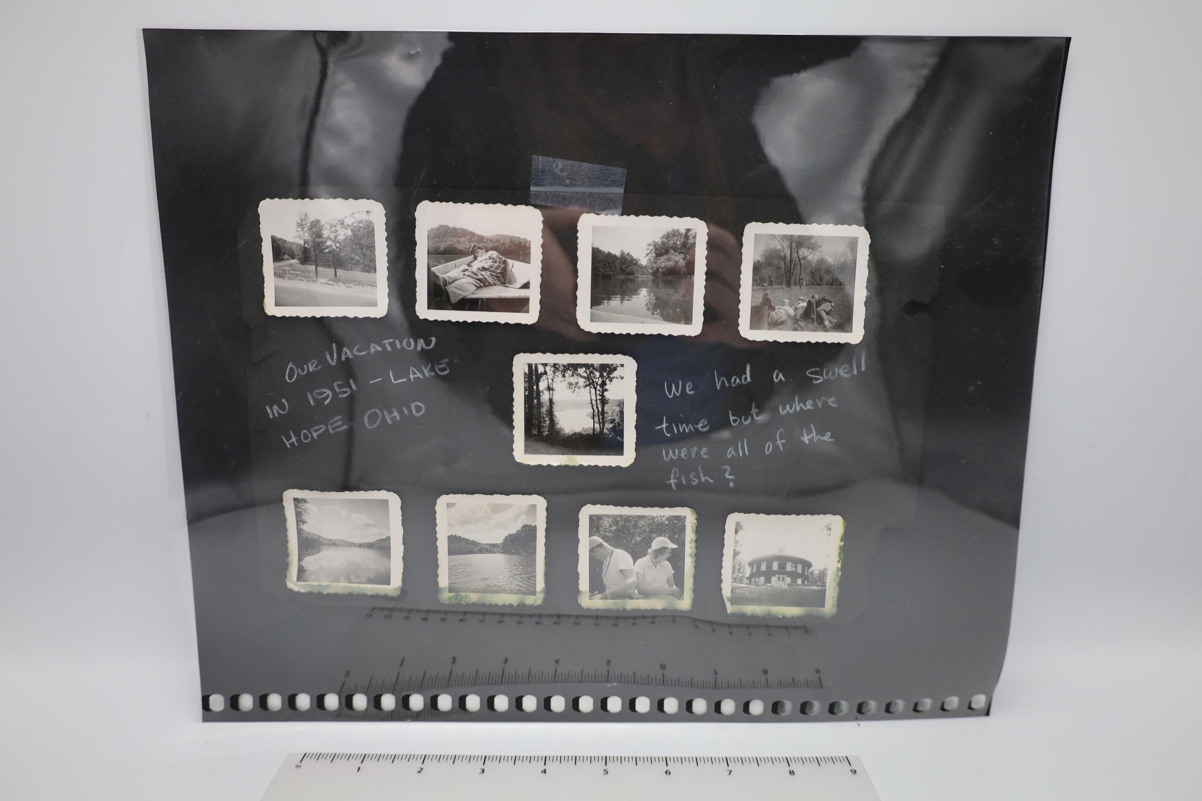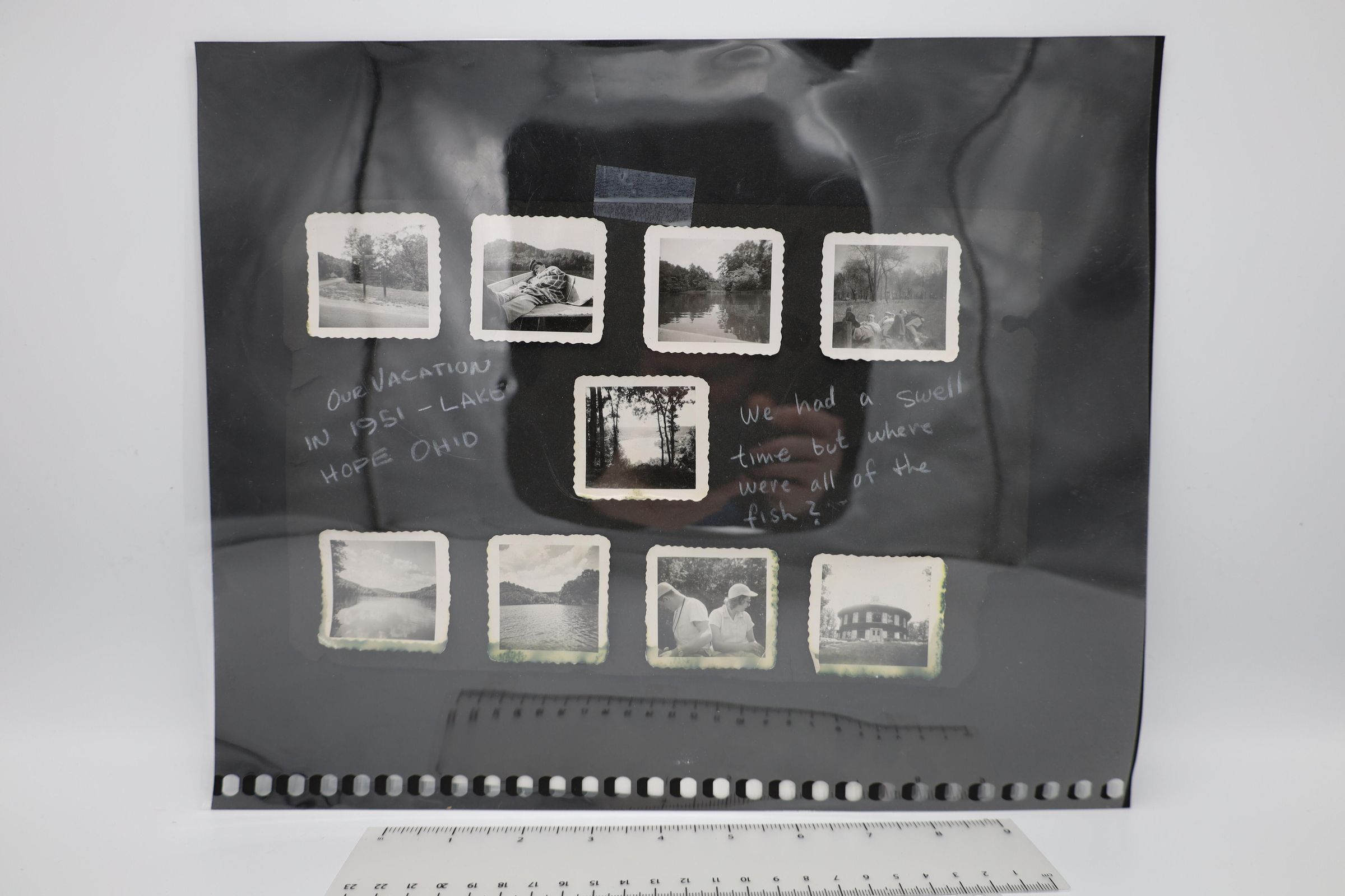 A page from a photo album featuring square deckle edge black and white photographs from a park visitor's vacation. Hand-written captions include "Our Vacation in 1951 – Lake Hope Ohio" and "We had a swell time but where were all the fish?" Photographs are mounted on black paper with a transparent covering. Photographs include views of the Lodge and the lake.Location