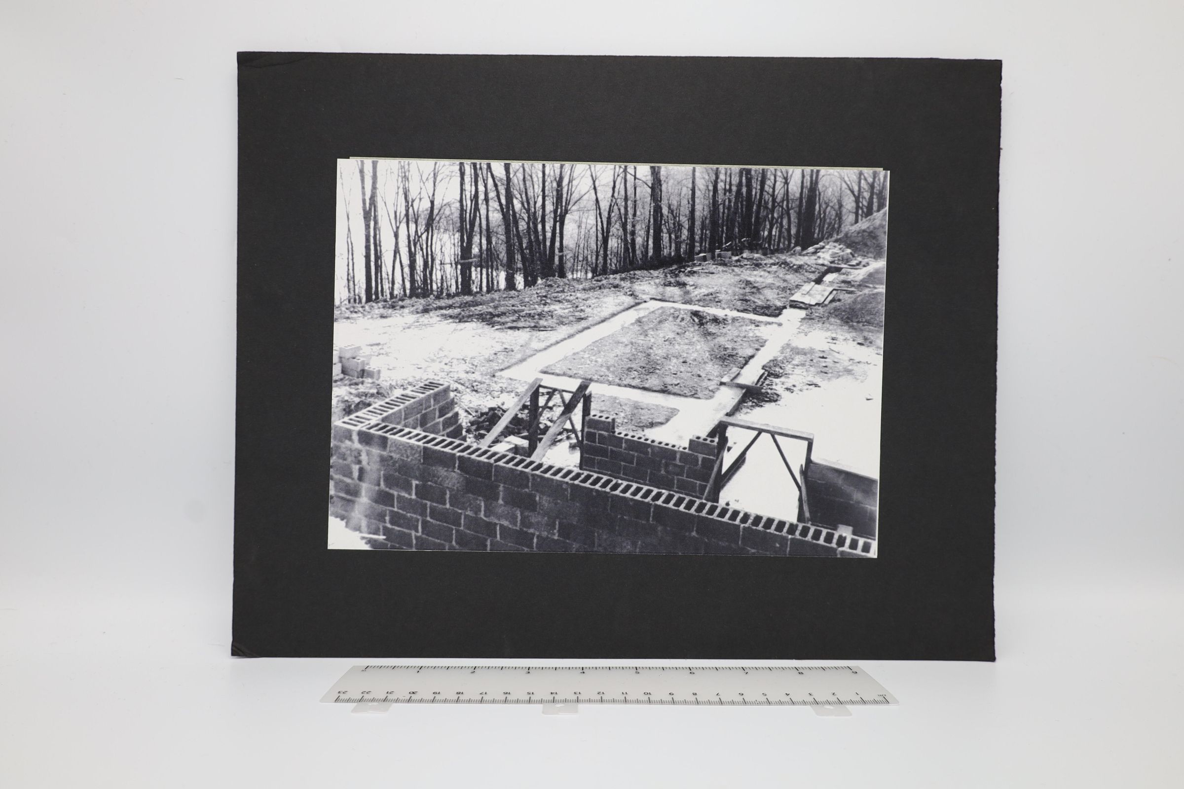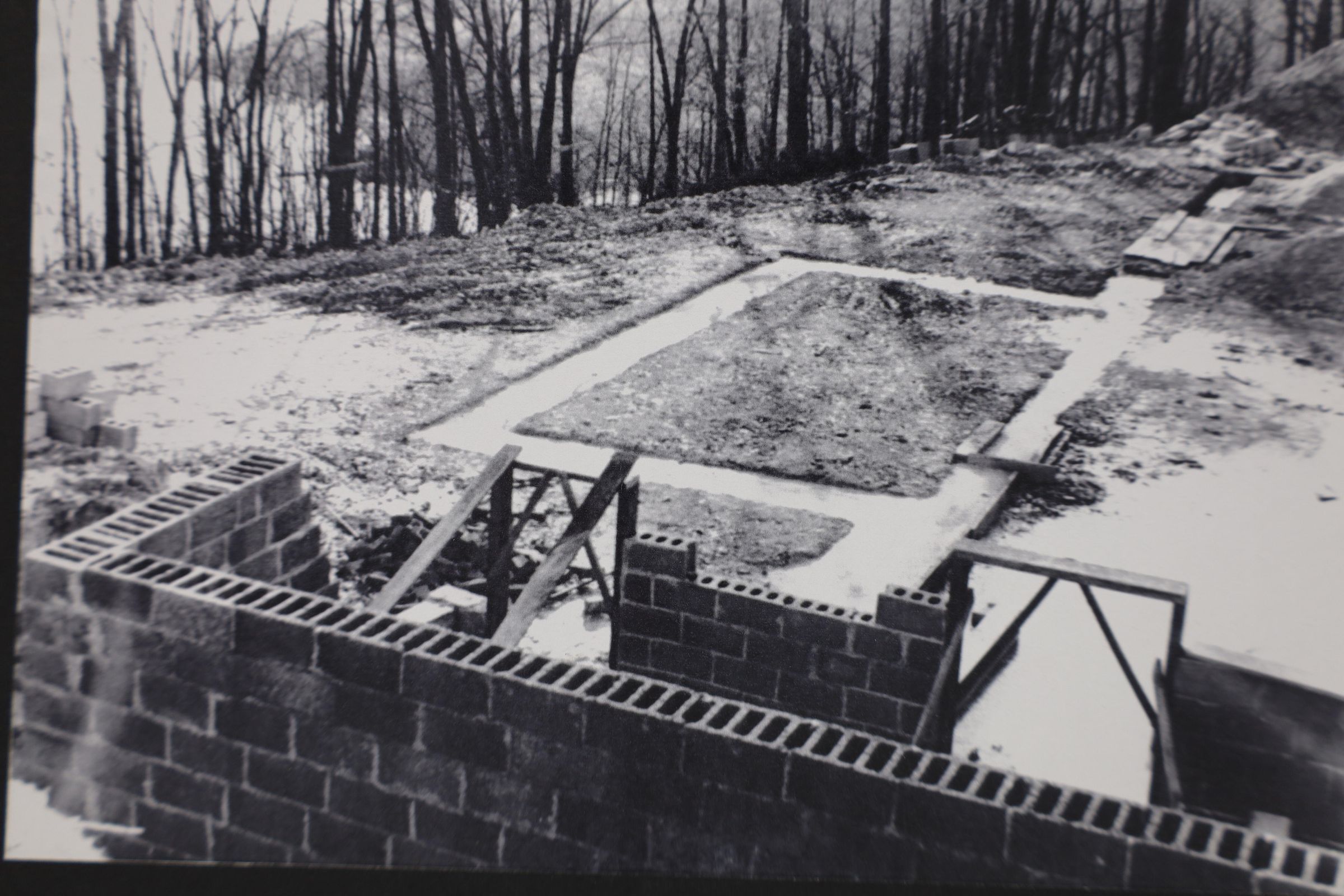 Black and white photograph showing the masonry and block wall construction of the foundation of the original Lake Hope Dining Lodge. This lodge was destroyed during a fire in 2006.